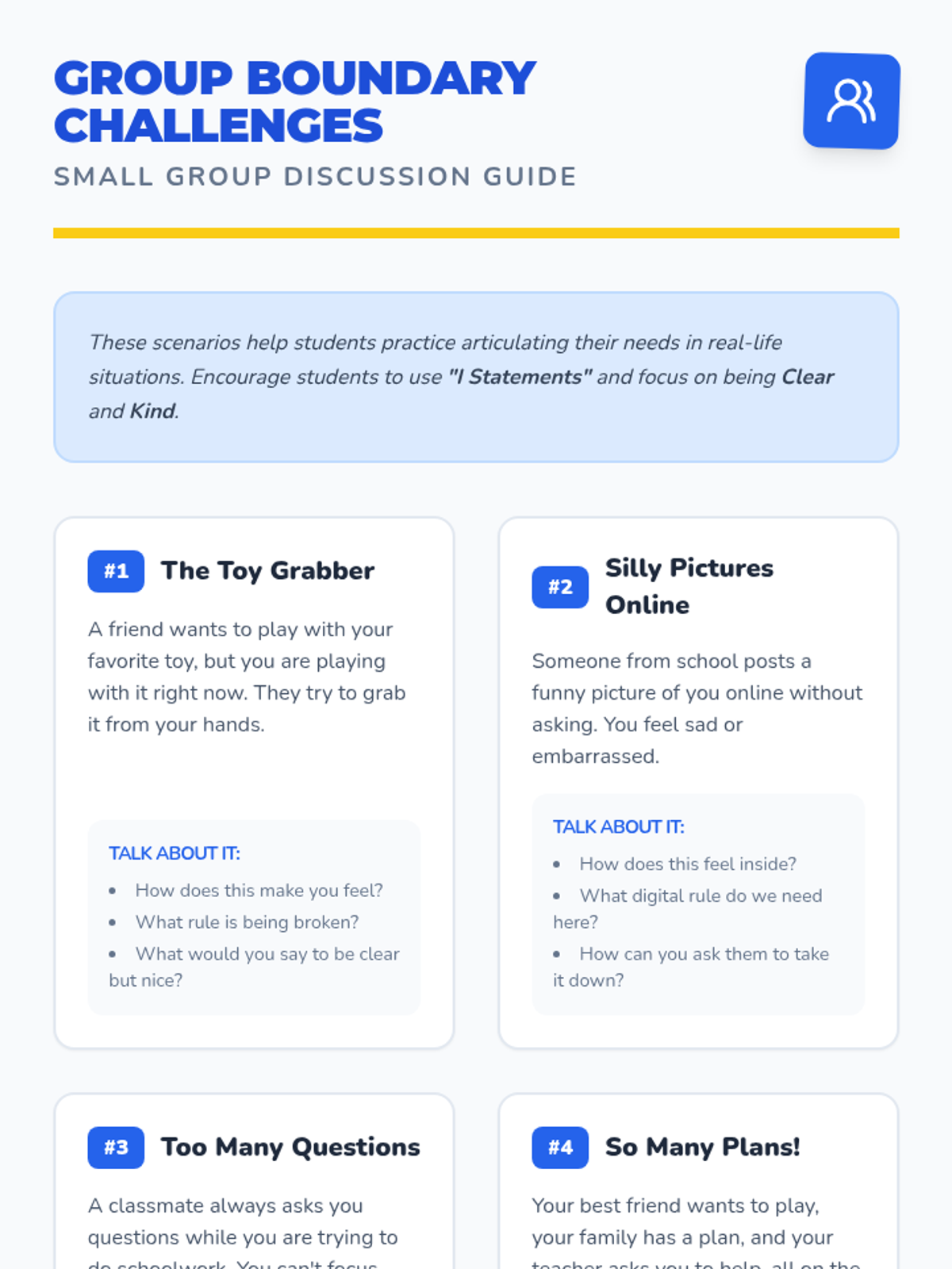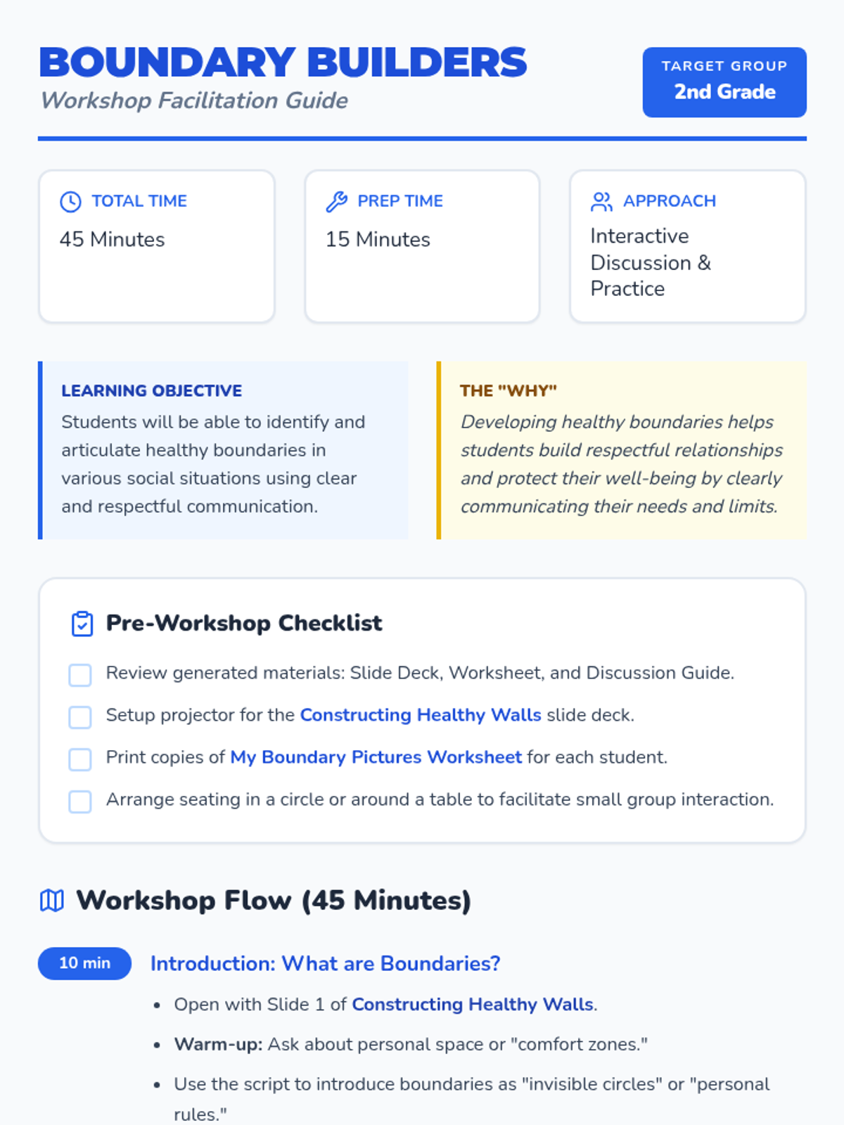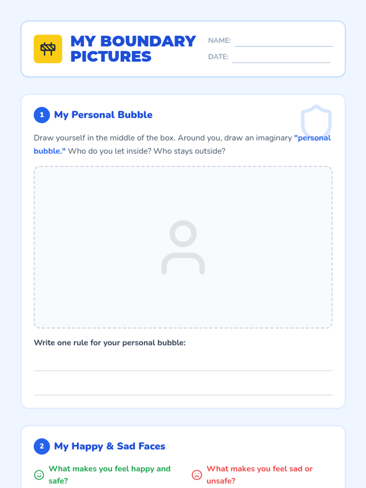 A small-group workshop for 2nd-grade students to identify, understand, and communicate healthy physical, emotional, and digital boundaries through interactive discussion and creative drawing.