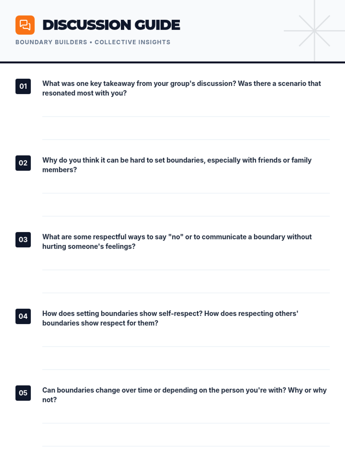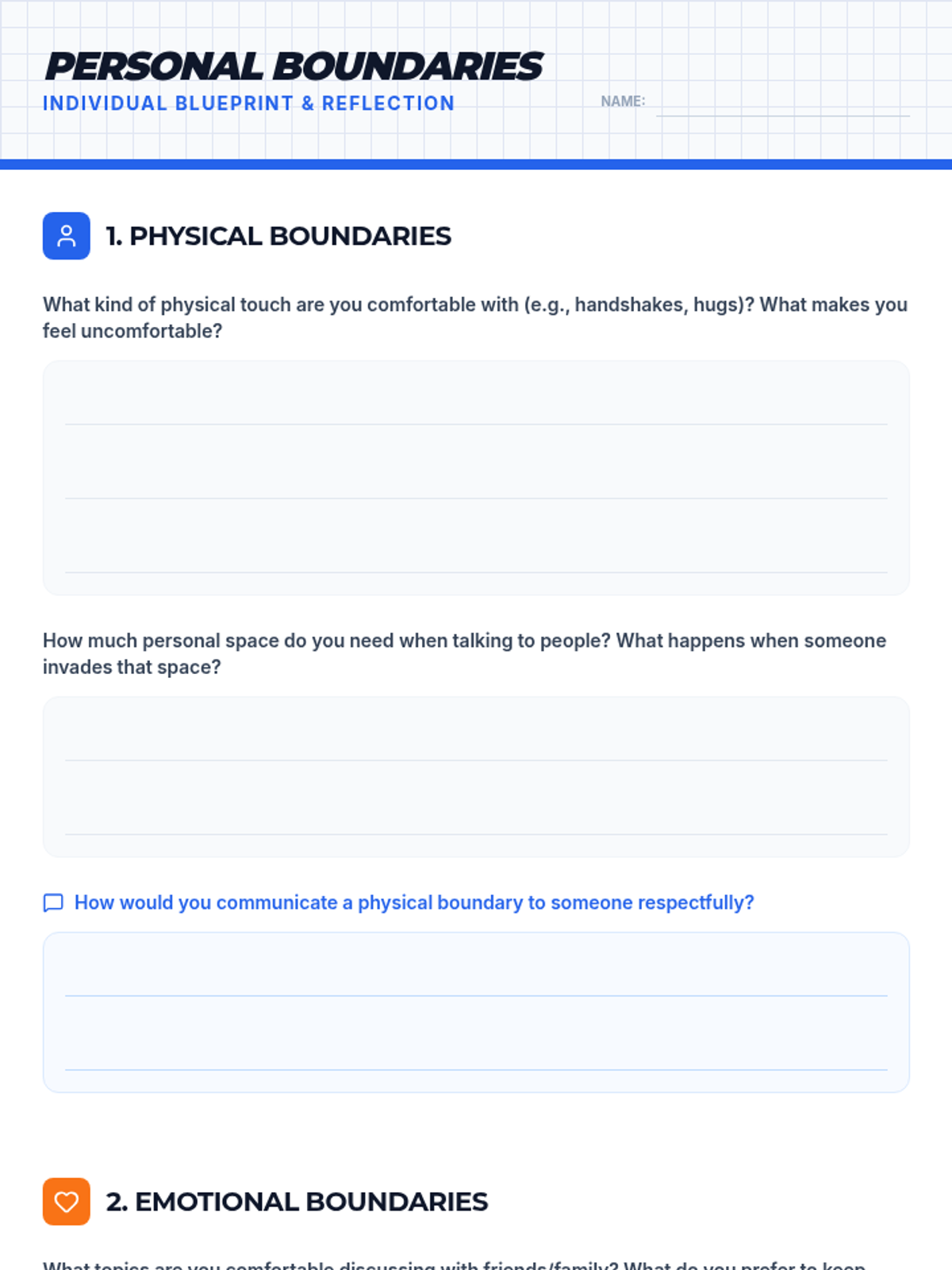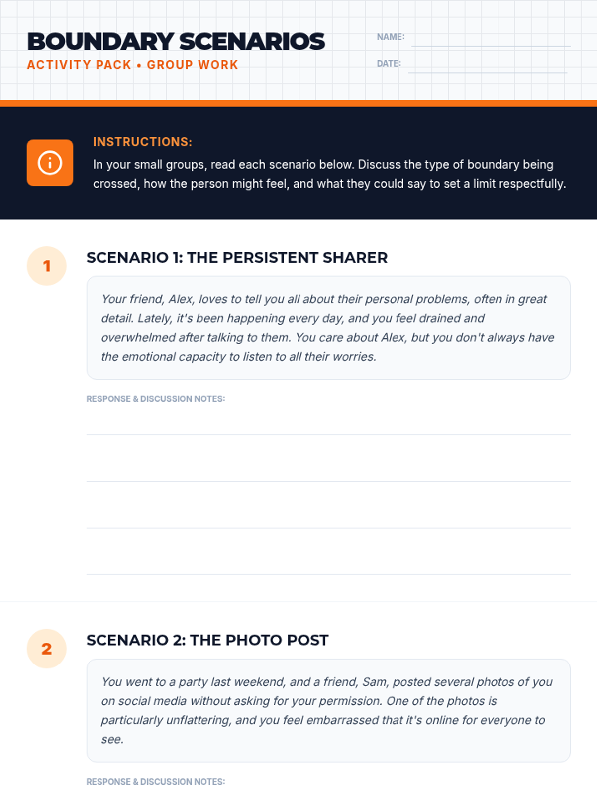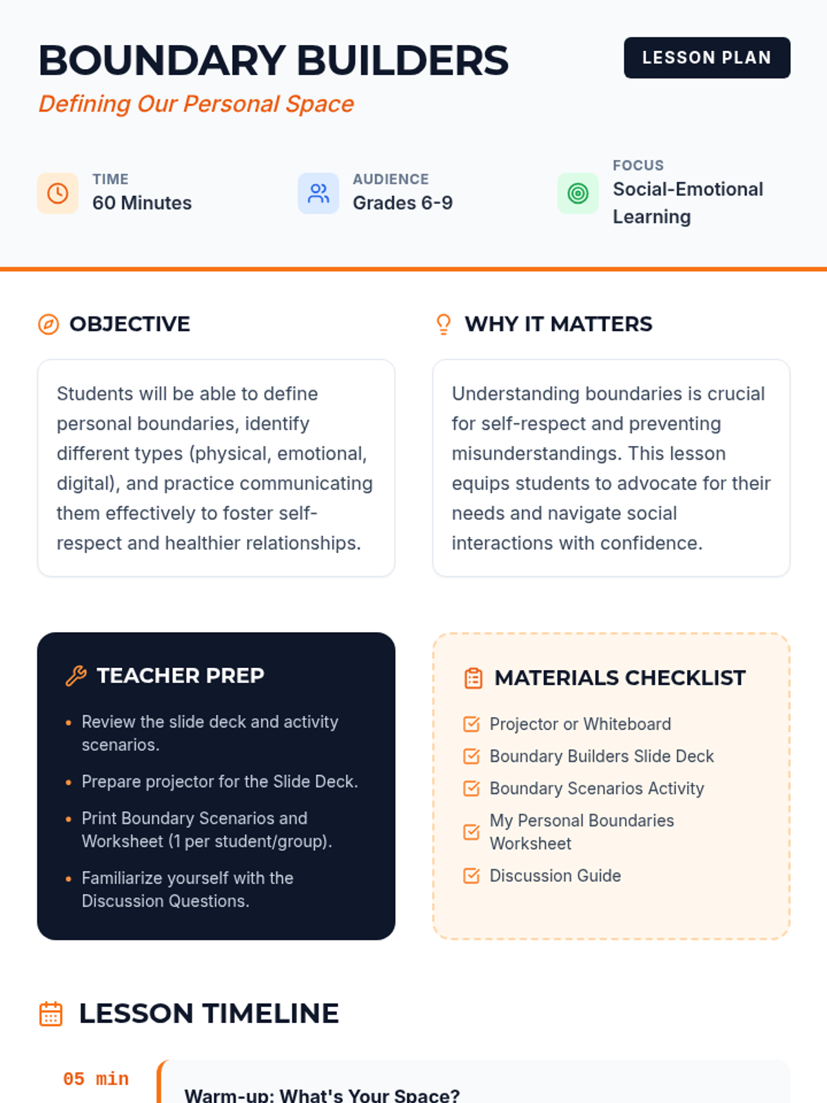 This lesson empowers students to understand, set, and respect personal boundaries in physical, emotional, and digital contexts through scenarios and self-reflection.