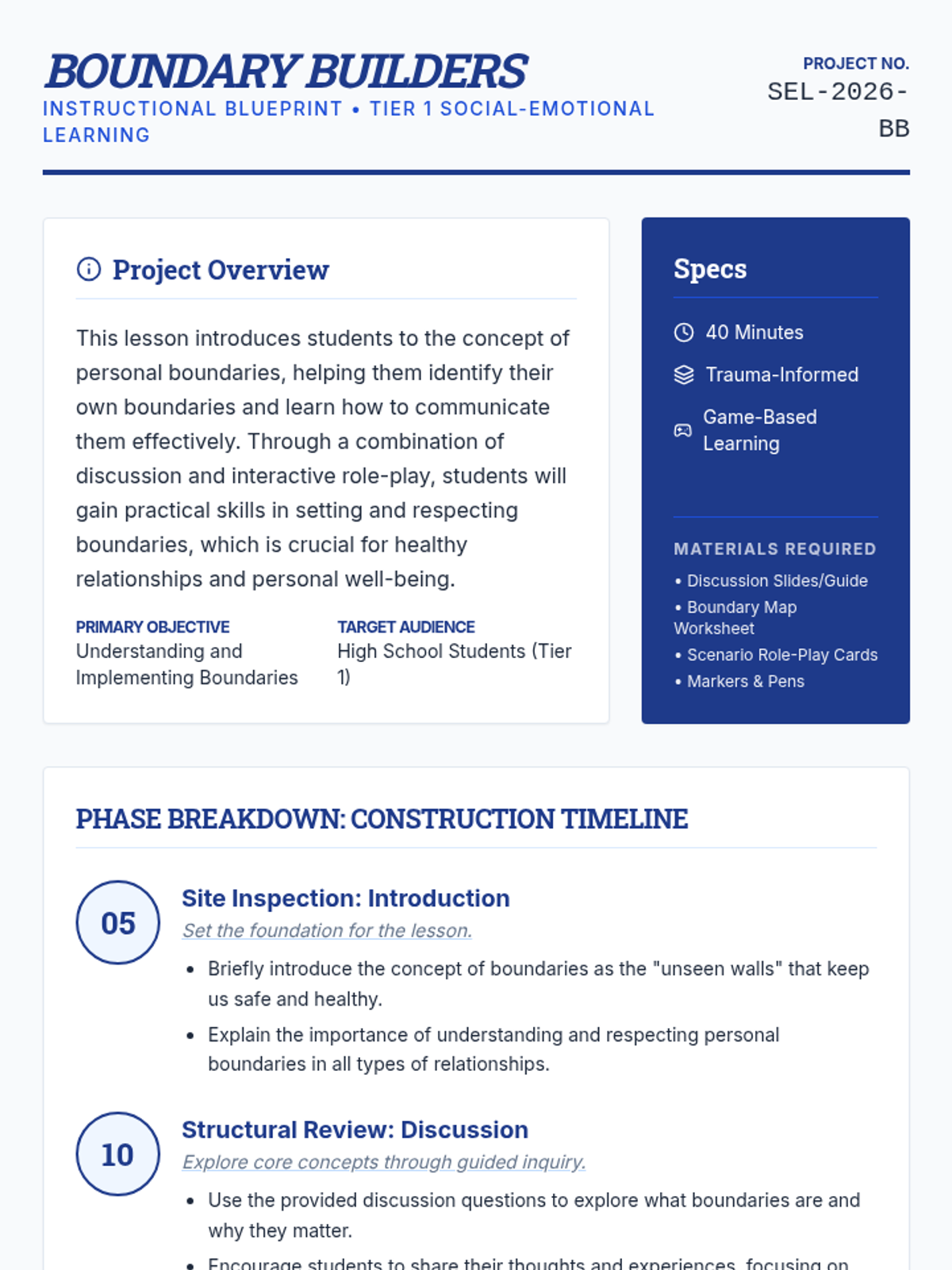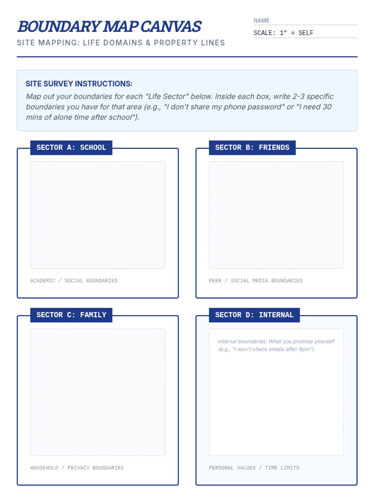 This lesson introduces high school students to personal boundaries, helping them identify, communicate, and respect their own and others' limits through mapping activities and role-play.