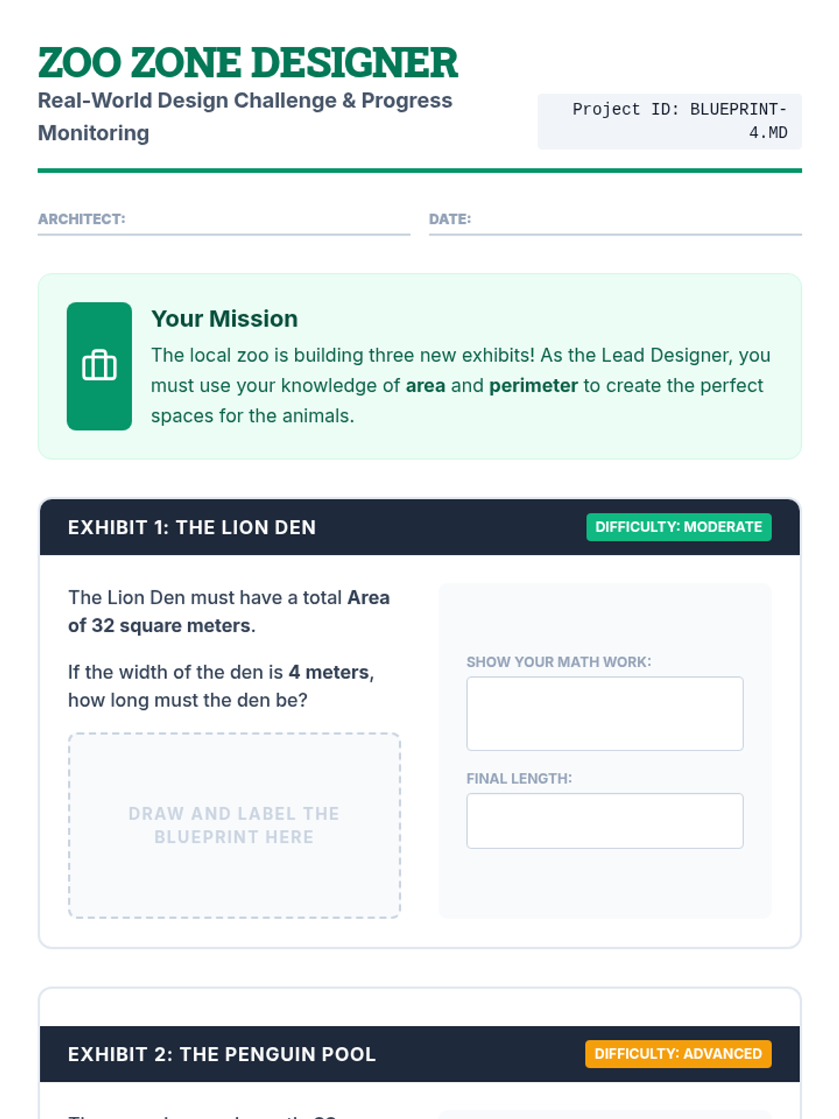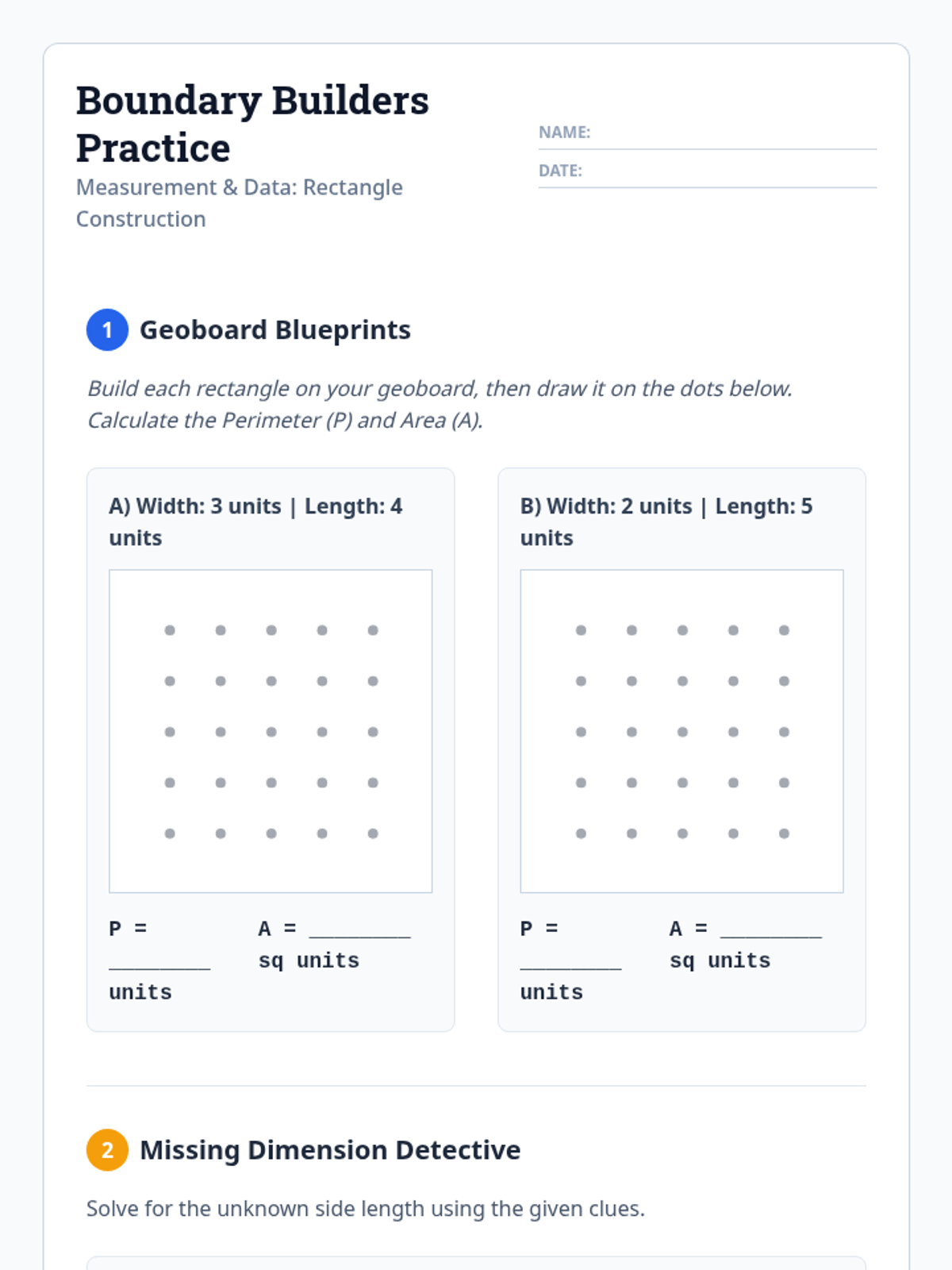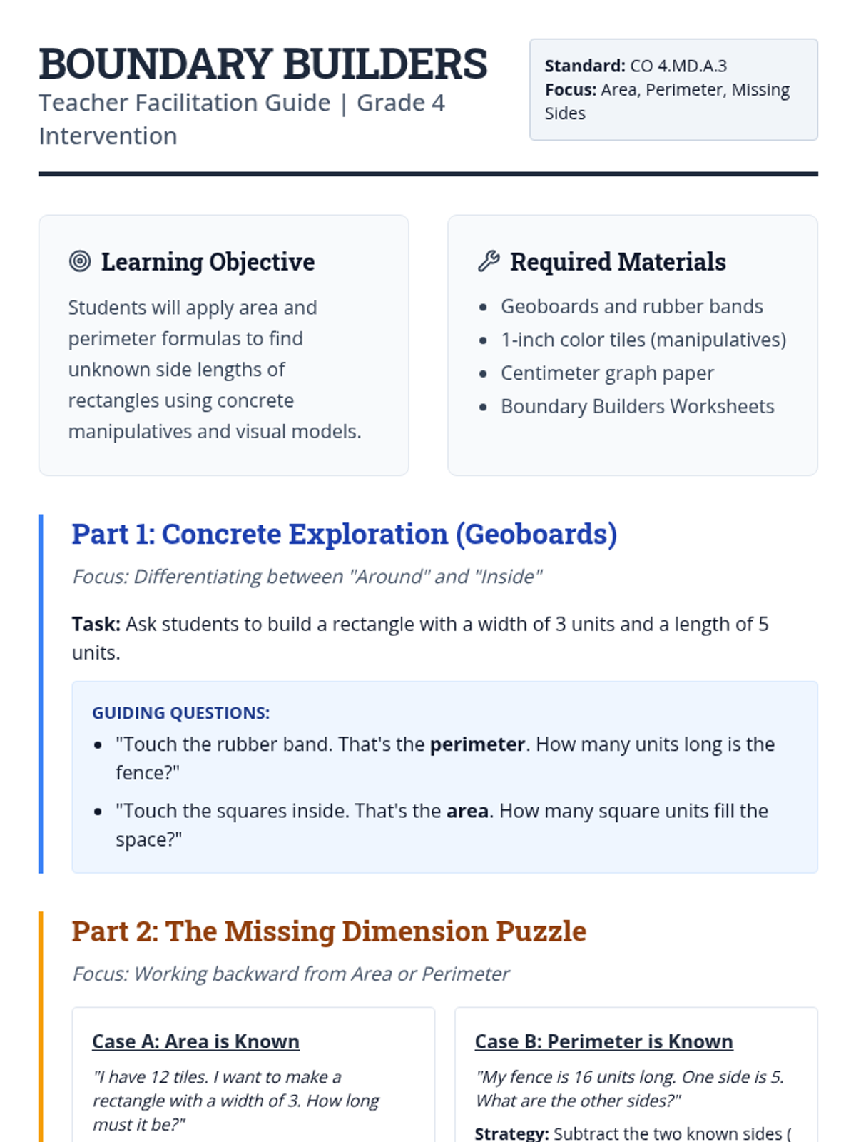 A Tier 2 intervention lesson focusing on area and perimeter using the Concrete-Representational-Abstract (CRA) sequence. Students use geoboards and graph paper to master formulas and solve for missing dimensions through a blueprint-themed design challenge.