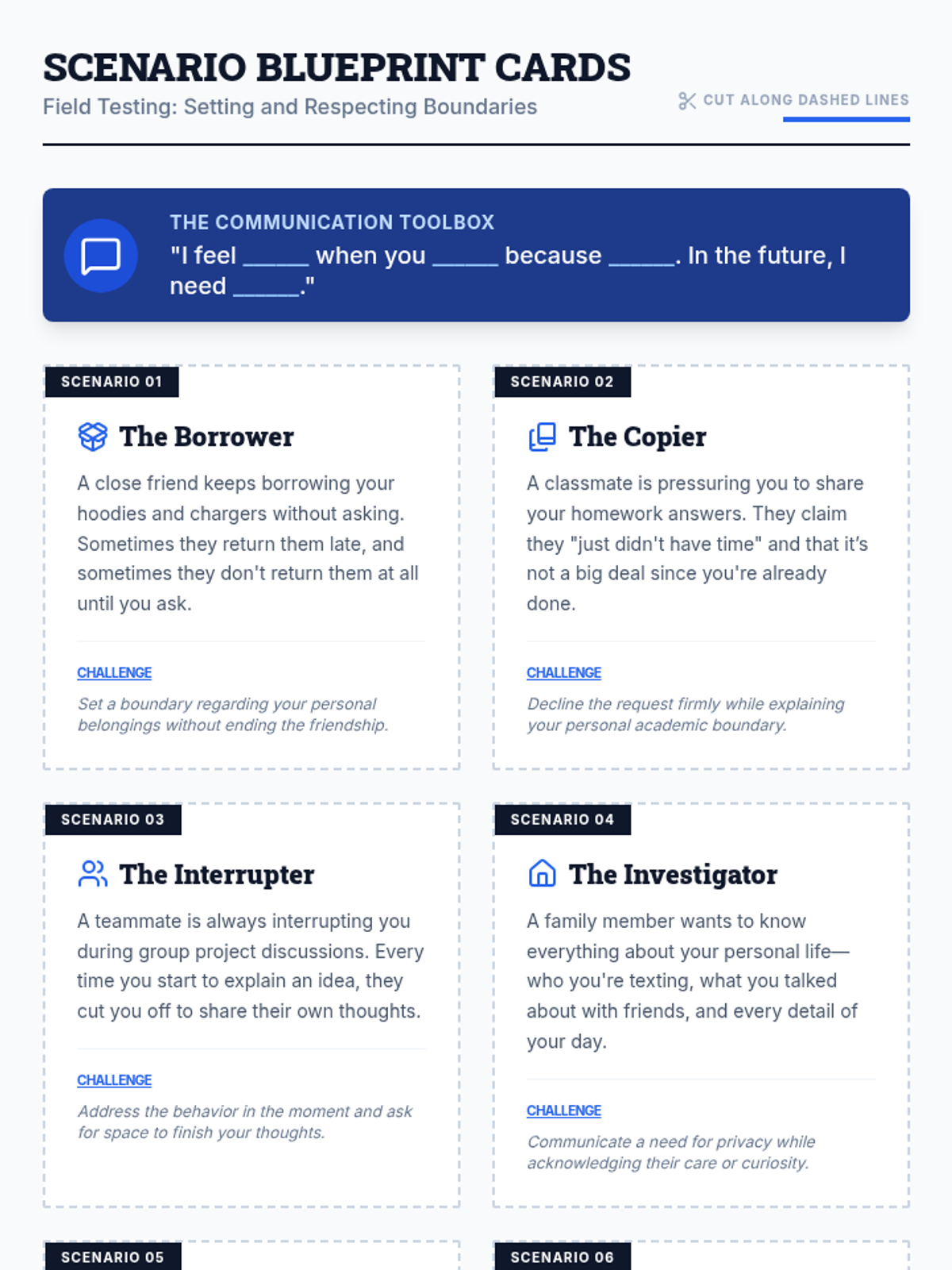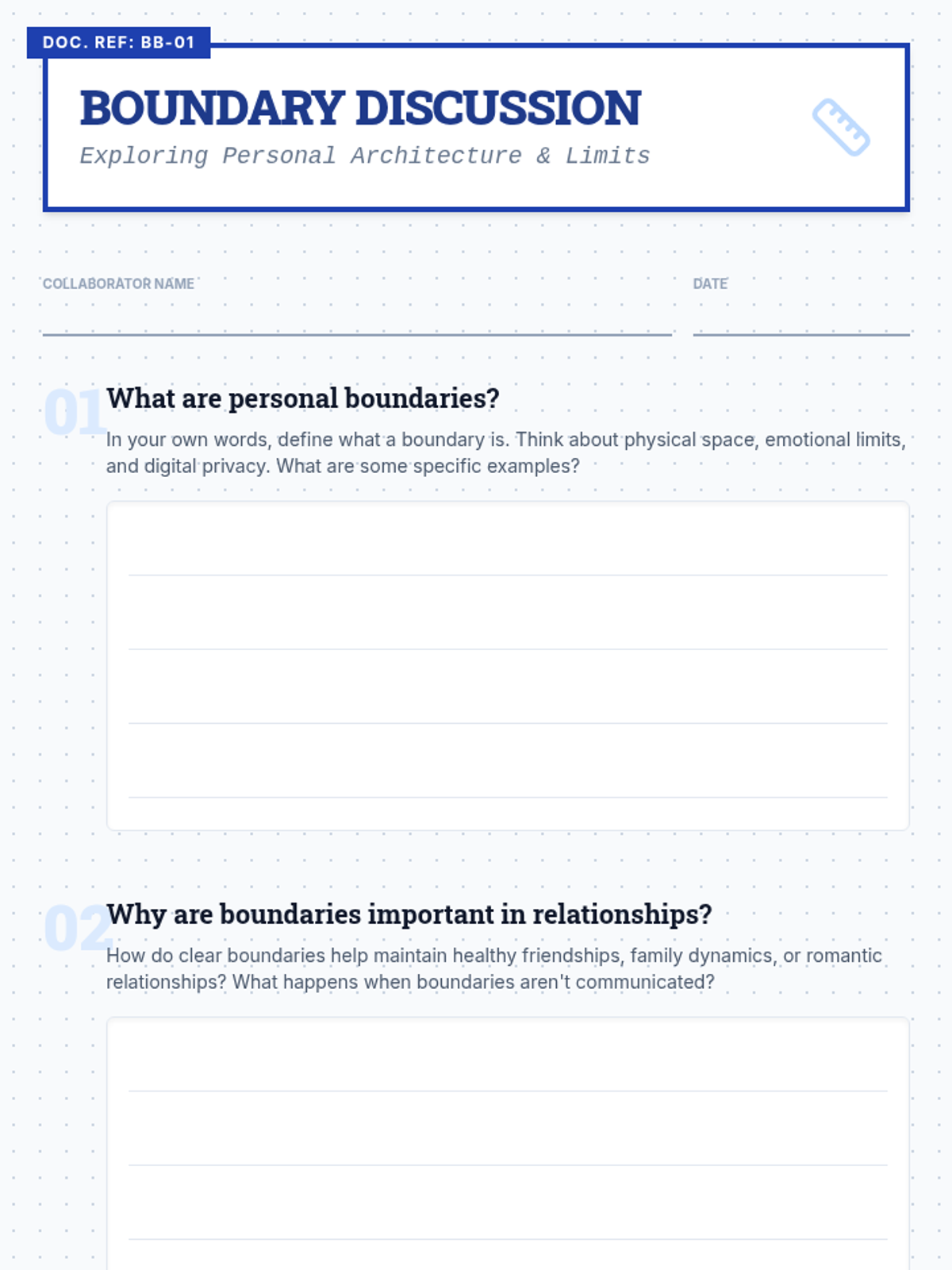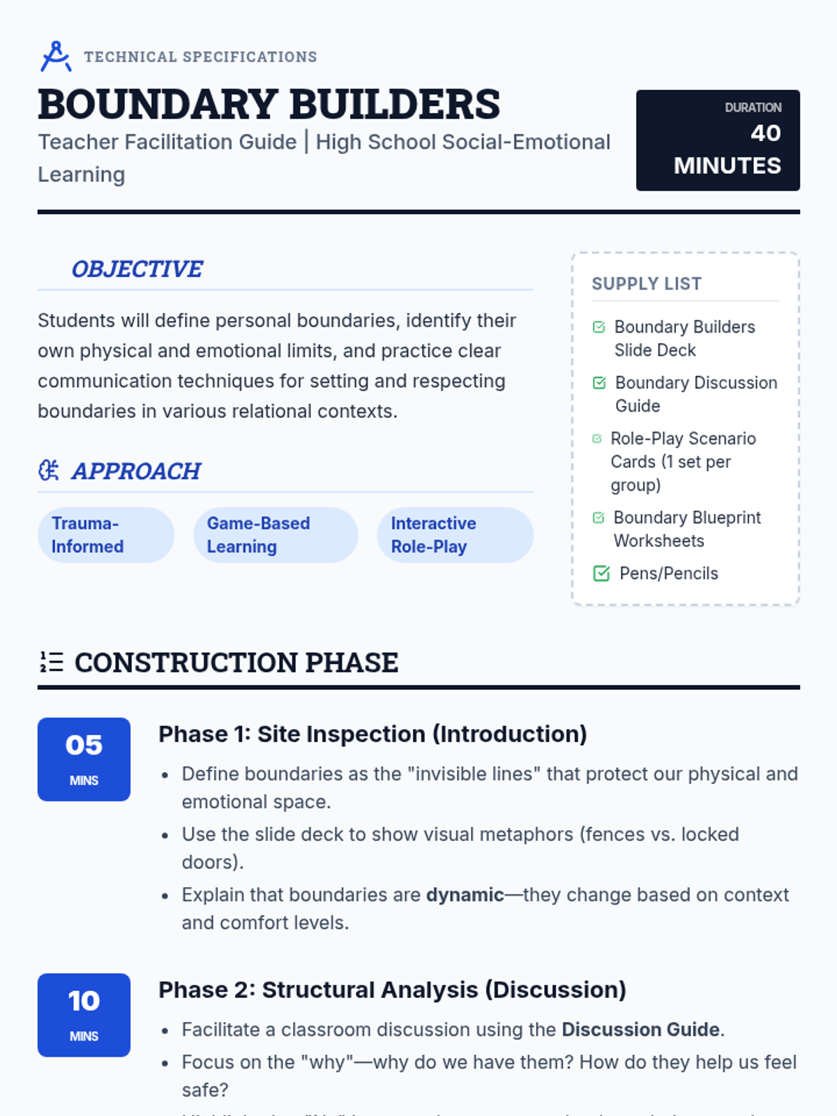 This lesson introduces high school students to personal boundaries through discussion and role-play, focusing on identifying, communicating, and respecting individual limits in various relationships.