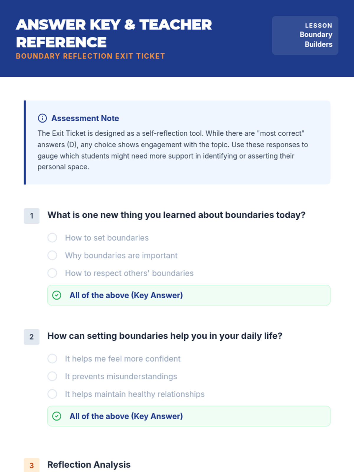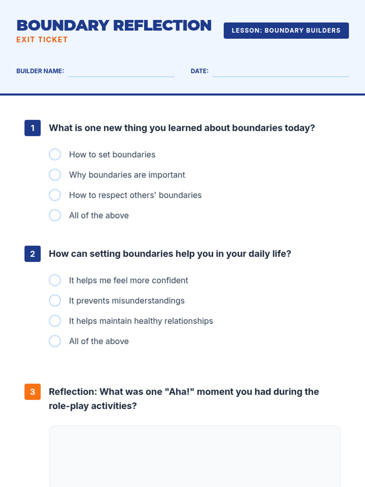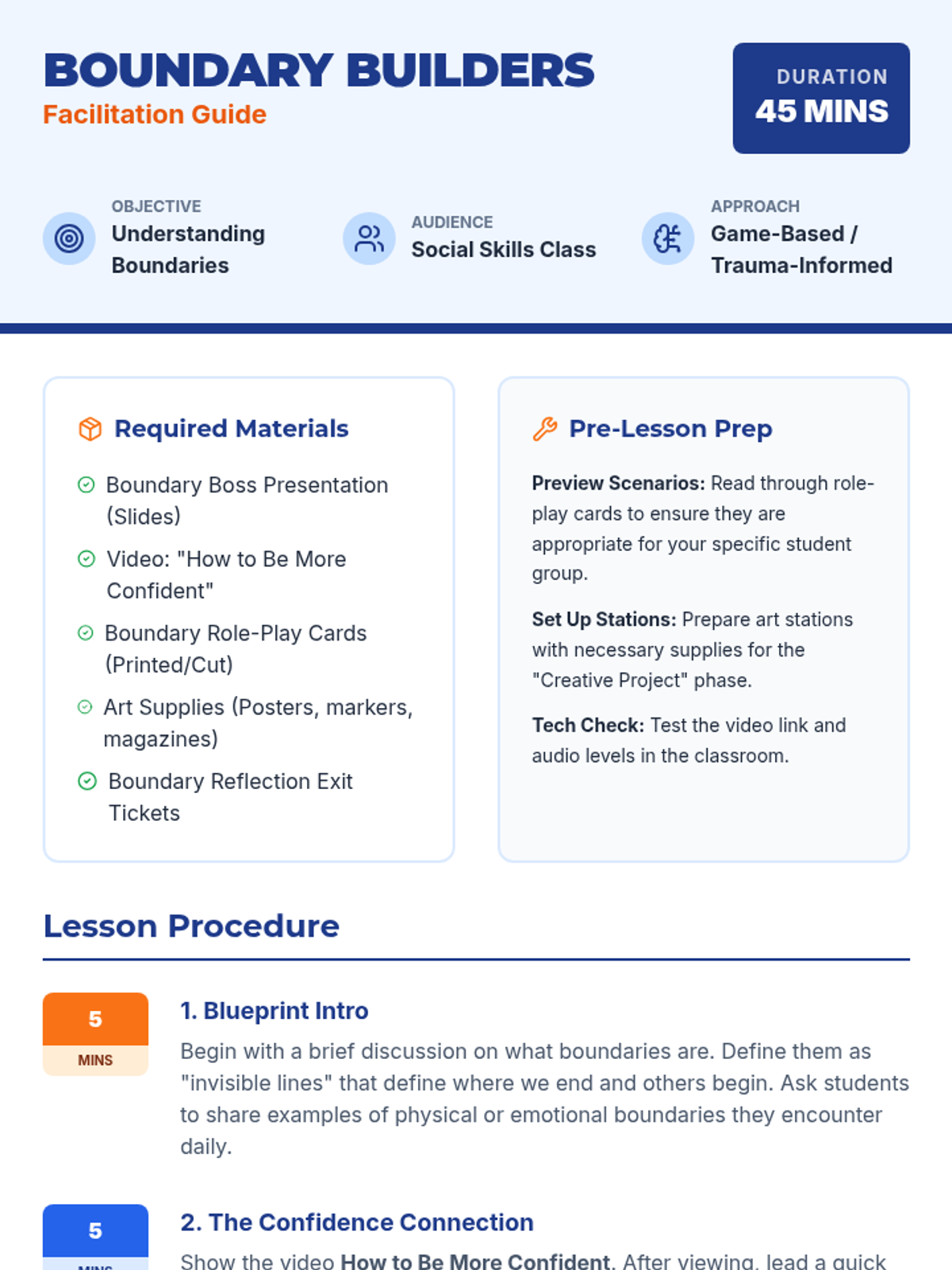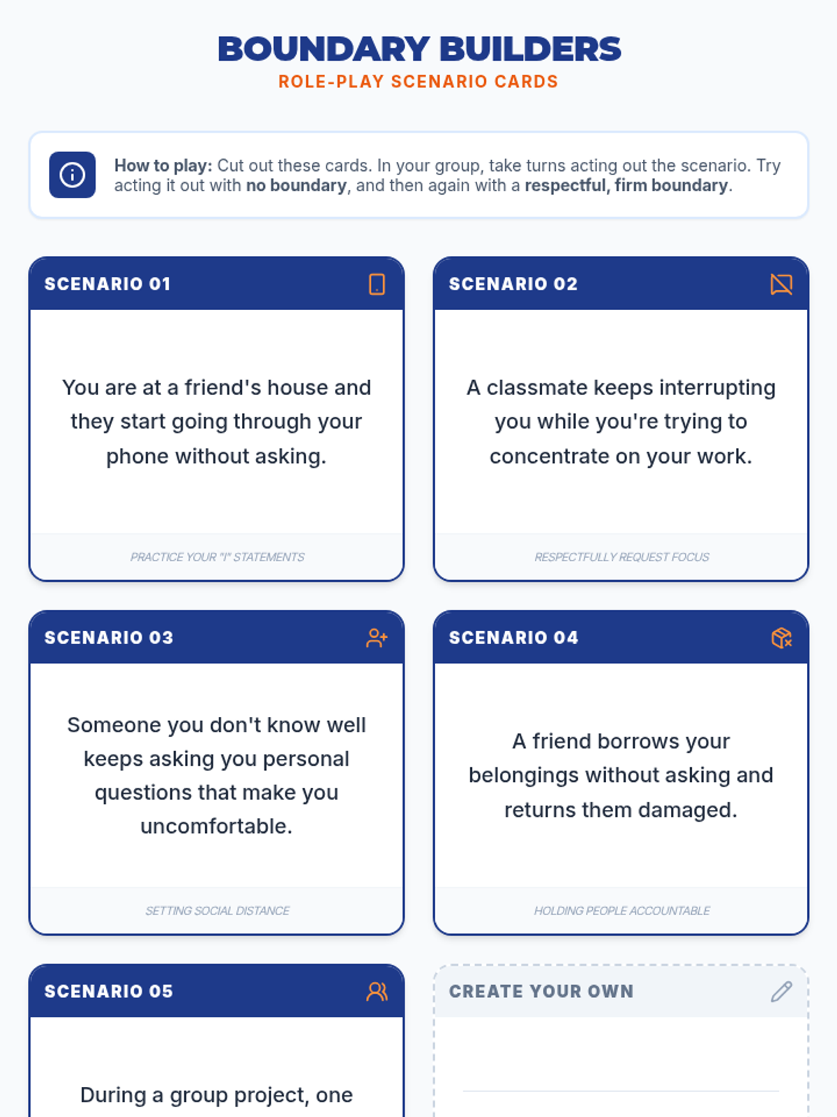 Students explore the concept of personal boundaries through interactive role-play, creative projects, and video analysis, fostering self-confidence and respect in social interactions.