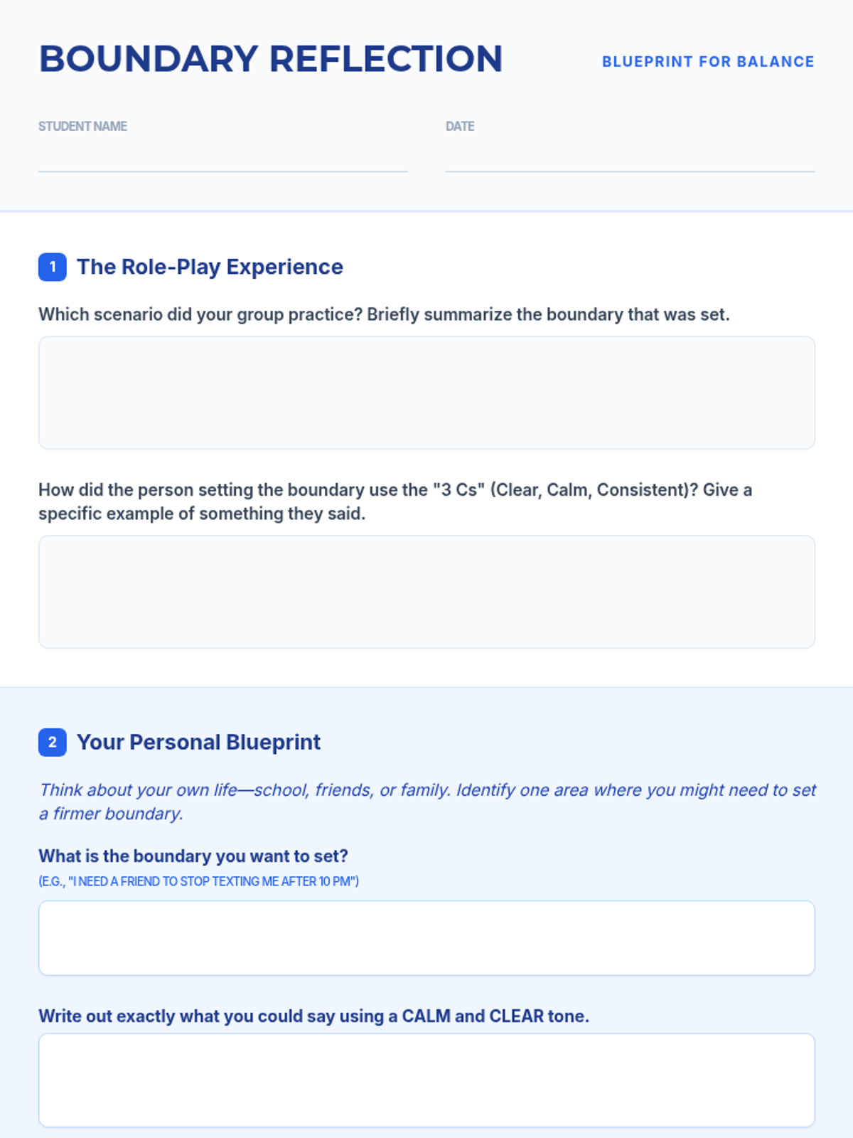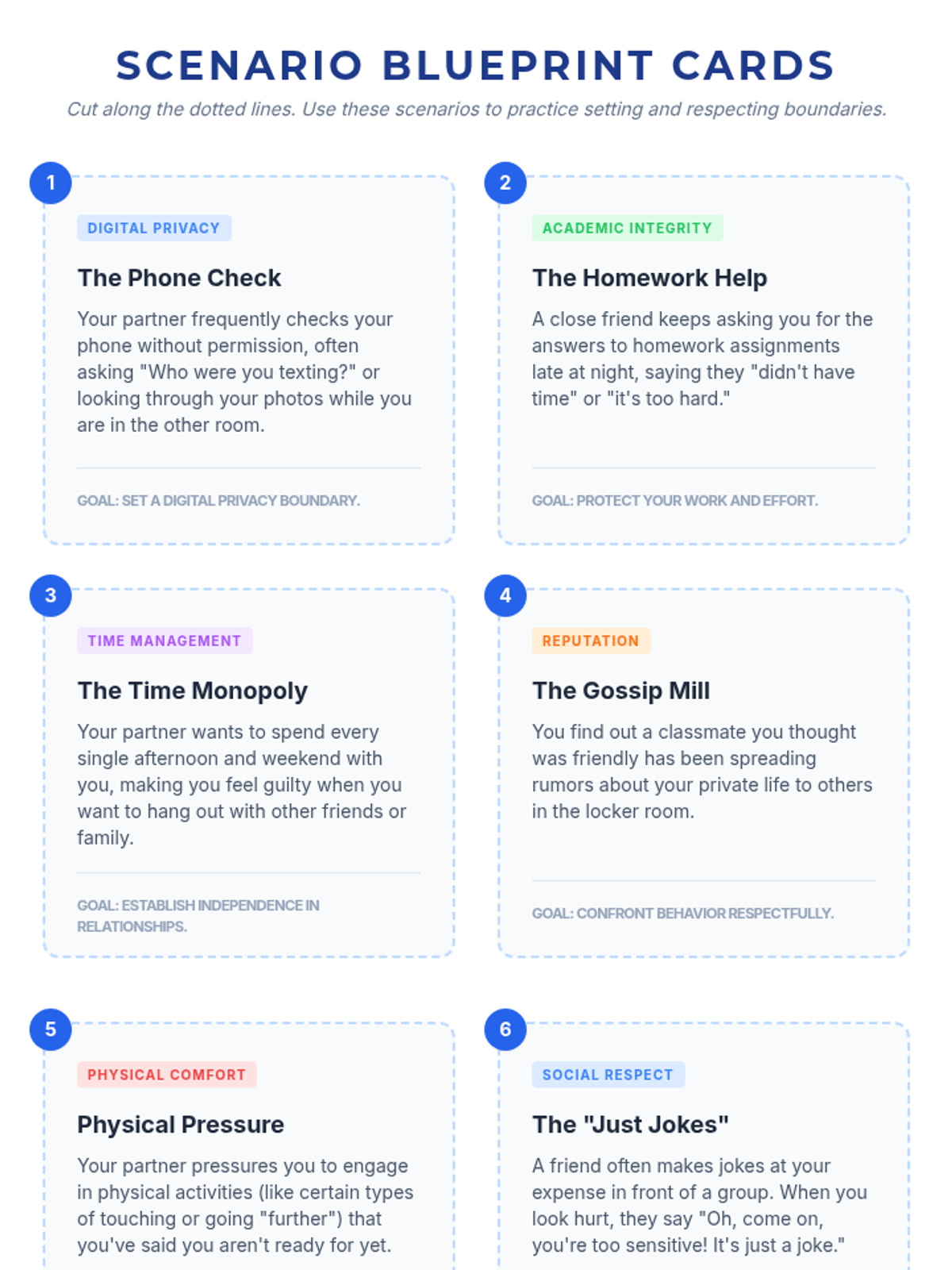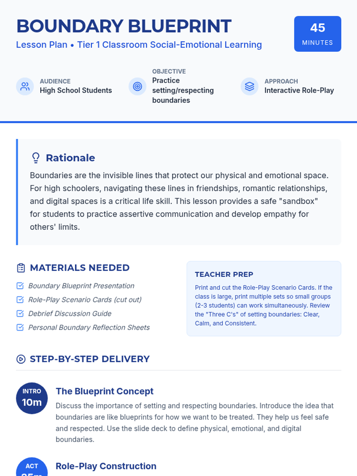 An interactive high school lesson where students role-play scenarios to practice setting and respecting boundaries in various relationships.