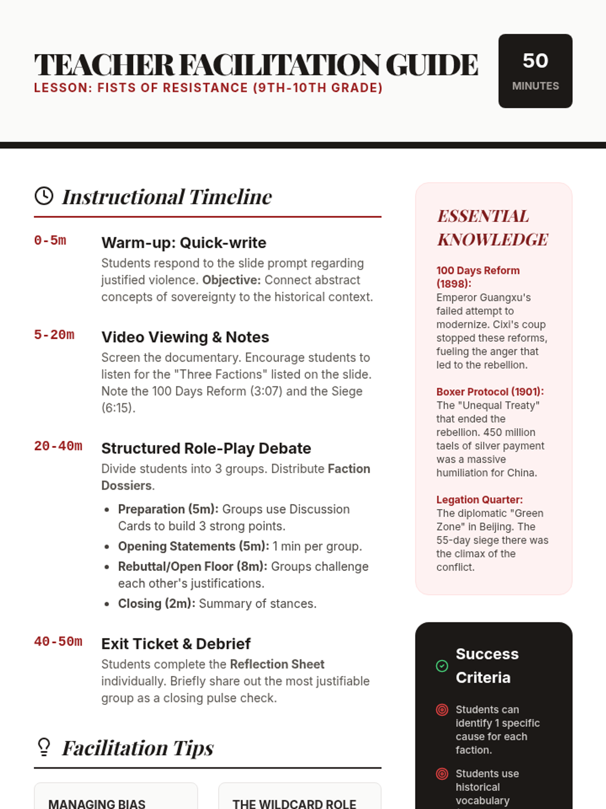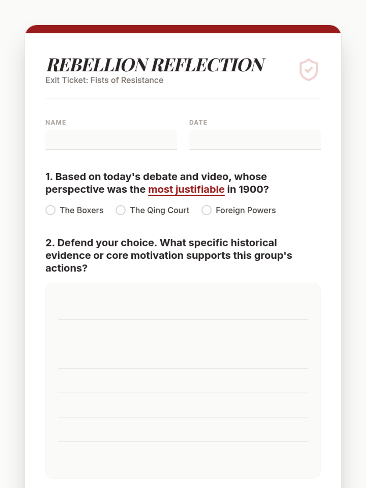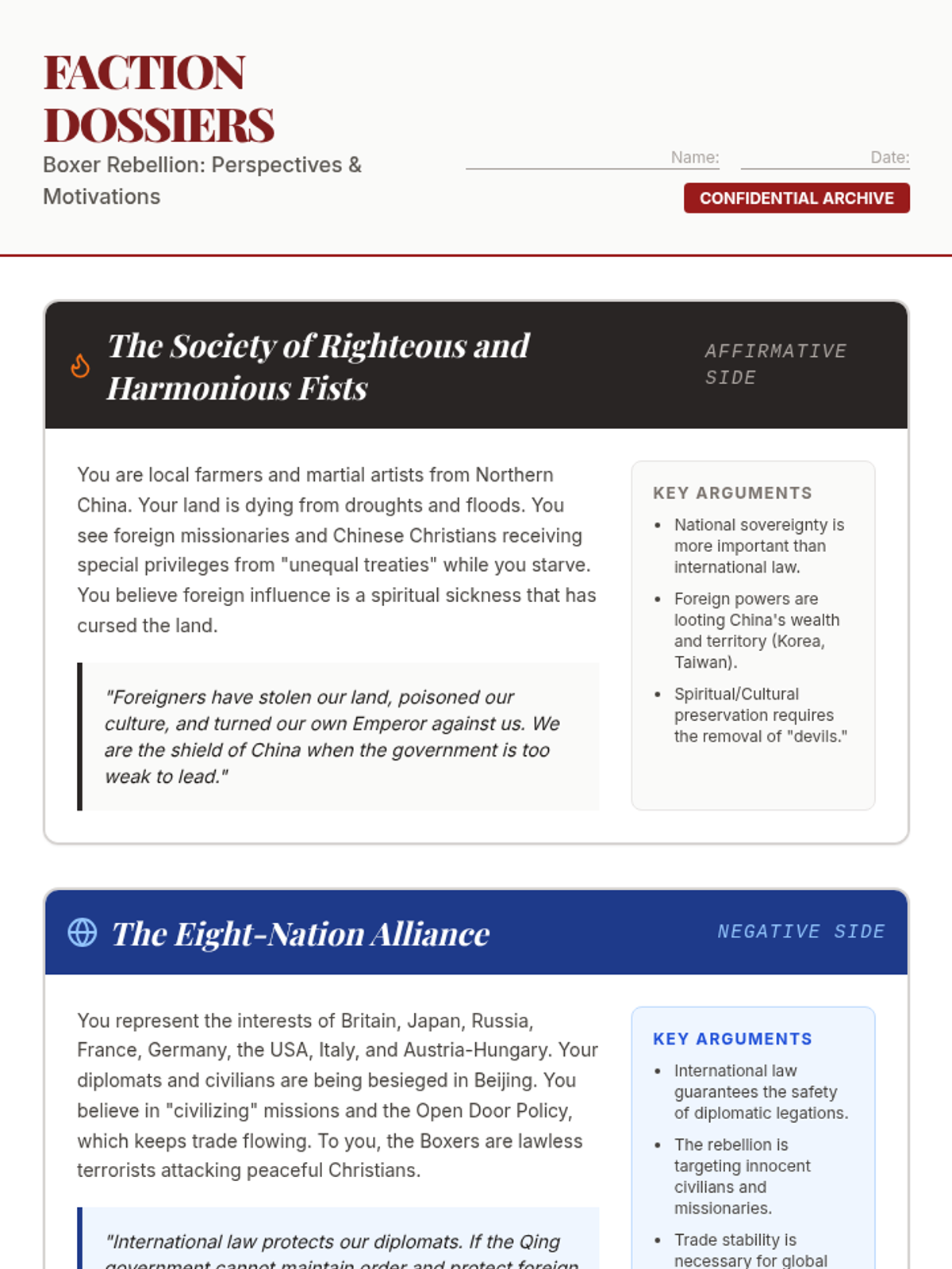 A high-stakes role-play lesson where students evaluate the complex motivations of the Boxers, the Qing Court, and the Eight-Nation Alliance during the 1900 uprising in China. Students analyze a detailed historical video before engaging in a structured debate regarding national sovereignty and foreign intervention.
