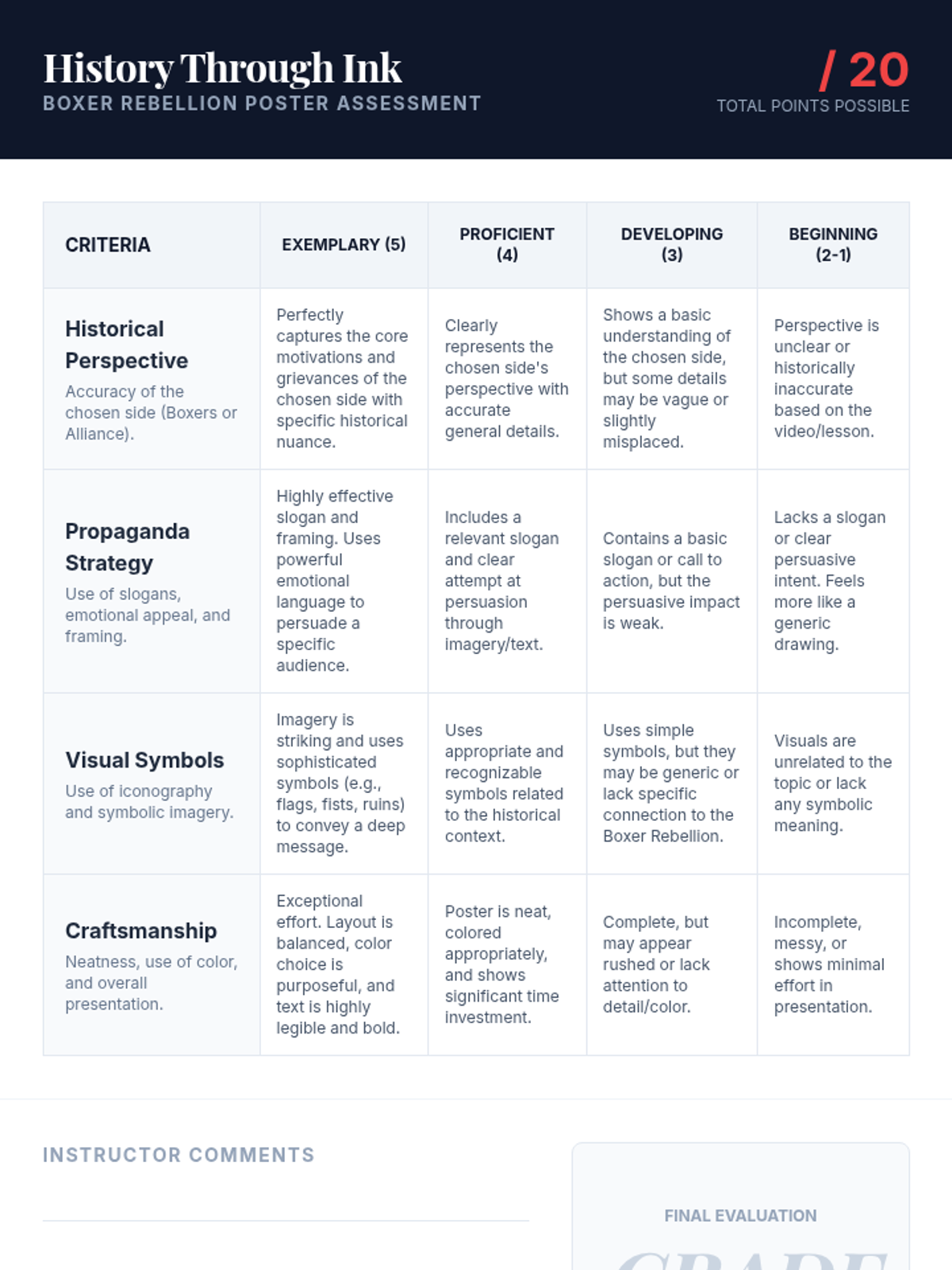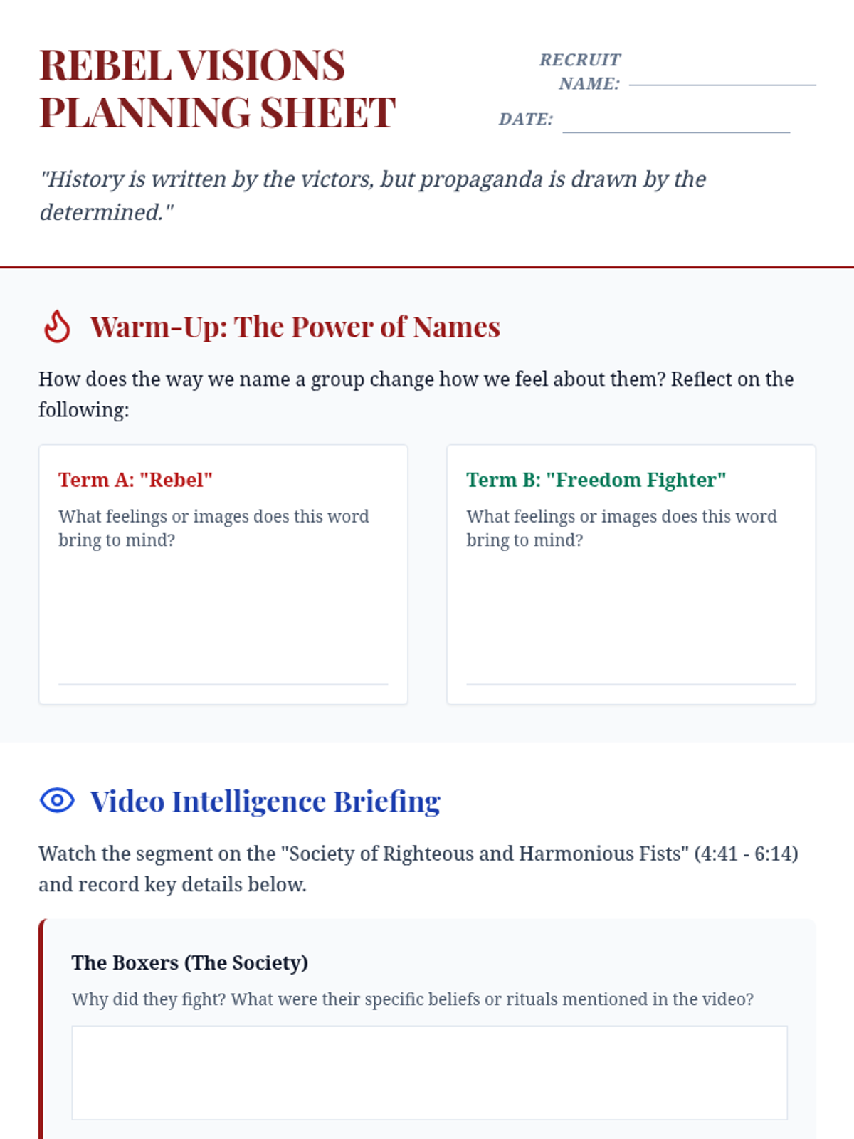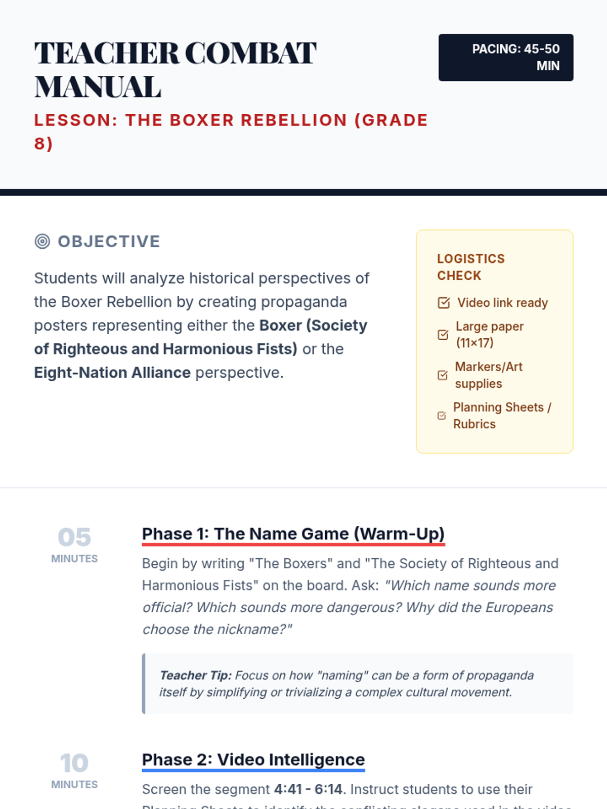 A high-engagement 8th-grade history lesson where students analyze the conflicting perspectives of the Boxer Rebellion through video analysis and the creation of historical propaganda posters. Students explore the power of naming and framing in history, comparing the 'Society of Righteous and Harmonious Fists' to the 'Eight-Nation Alliance.'