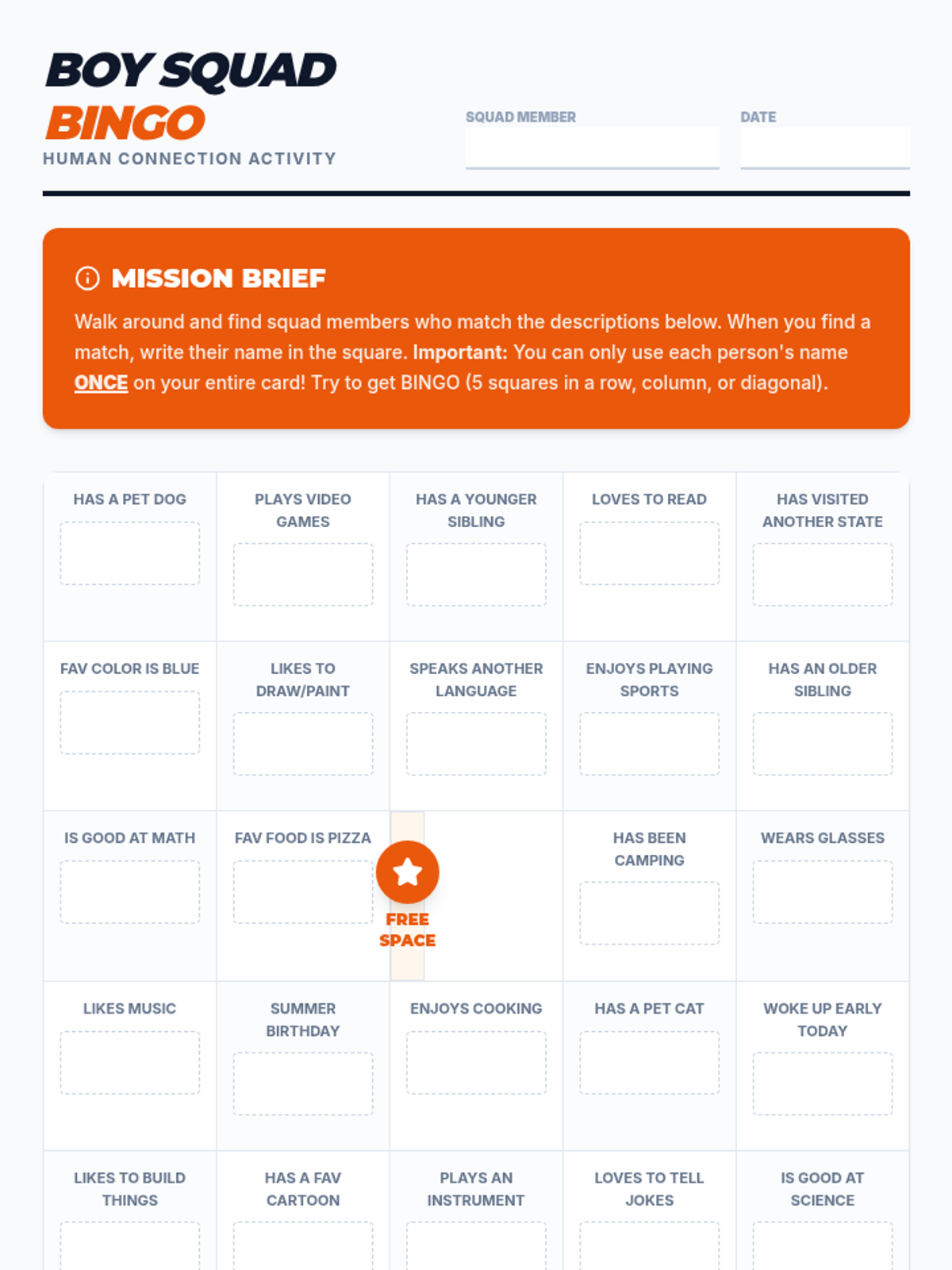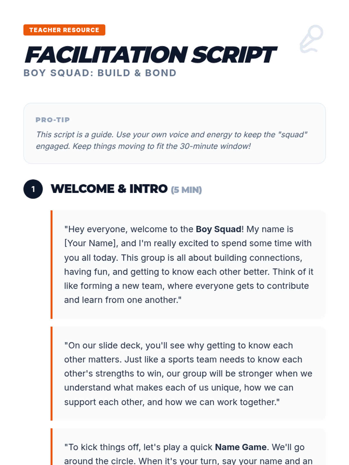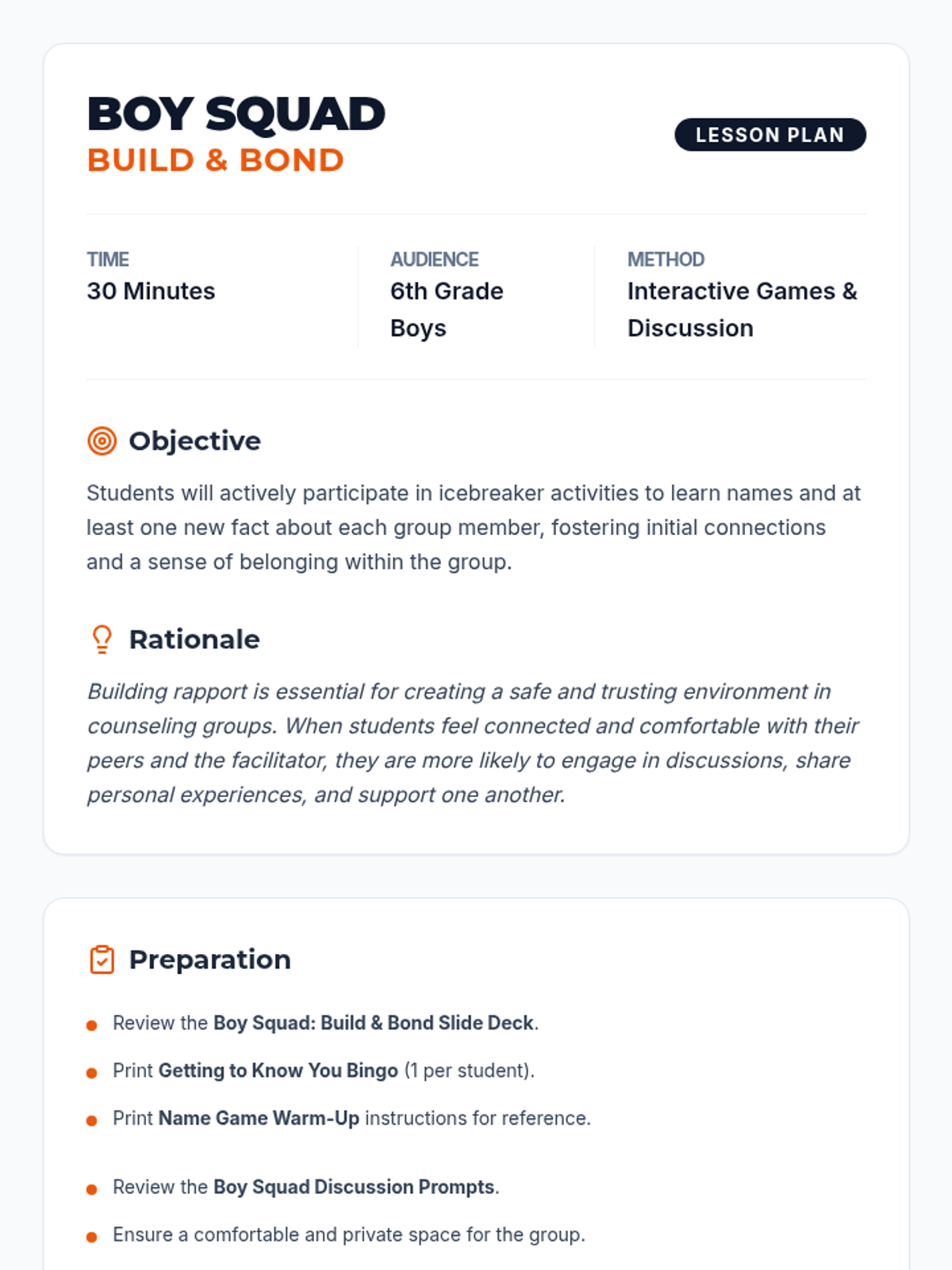 A 30-minute small group counseling lesson for 6th-grade boys focused on building rapport, establishing group dynamics, and fostering connections through interactive icebreakers.