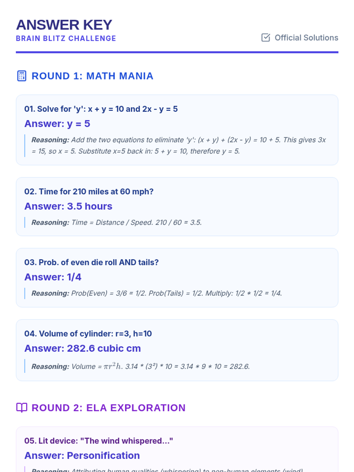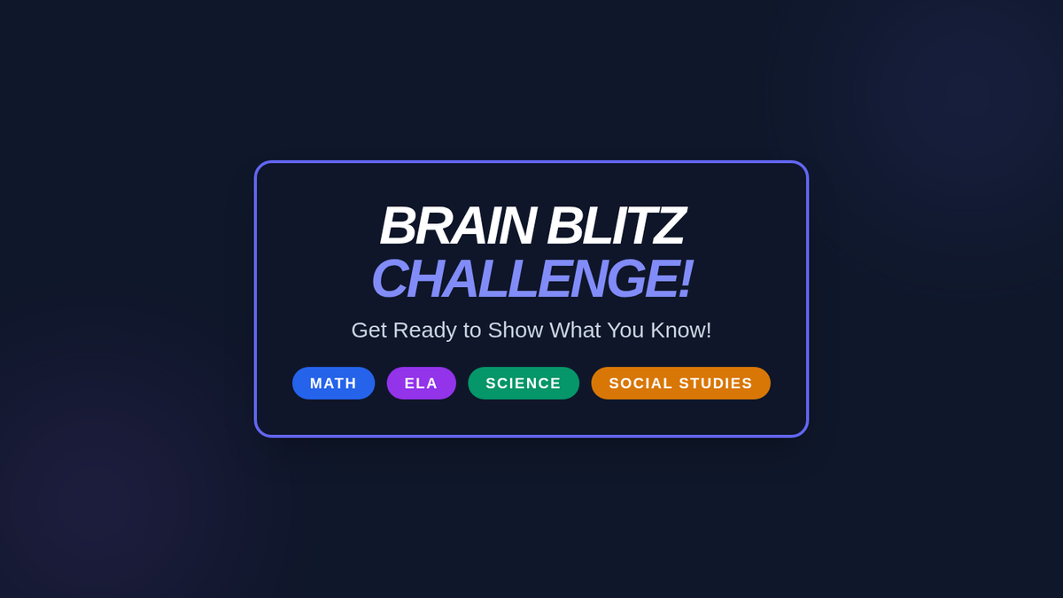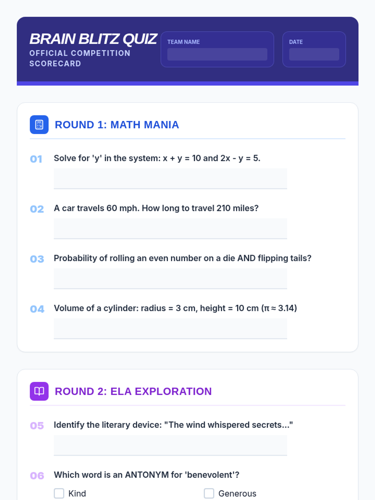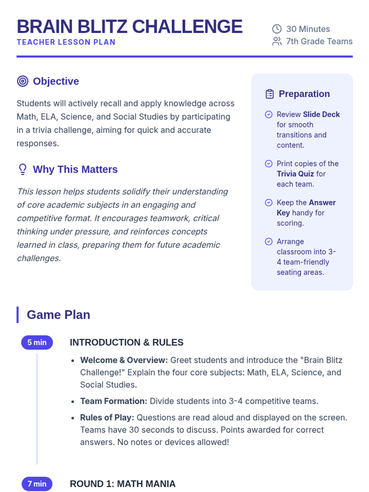 A high-energy, fast-paced trivia challenge for 7th-grade academic teams covering Math, ELA, Science, and Social Studies to review key concepts and practice quick recall.