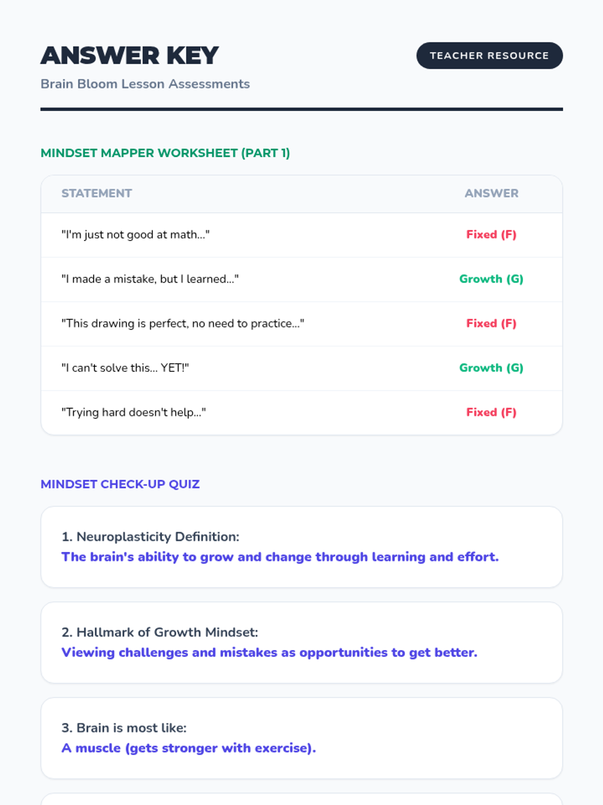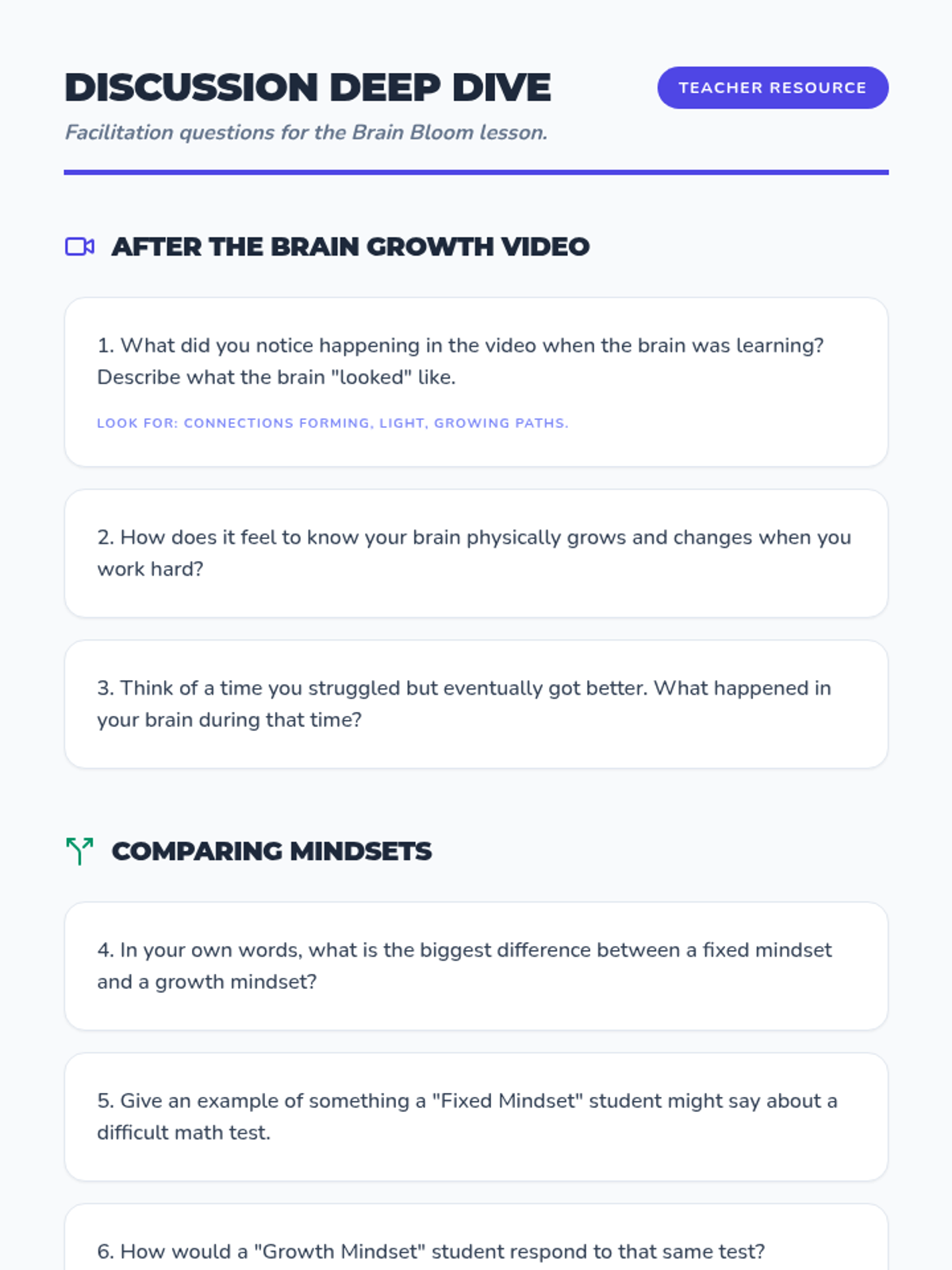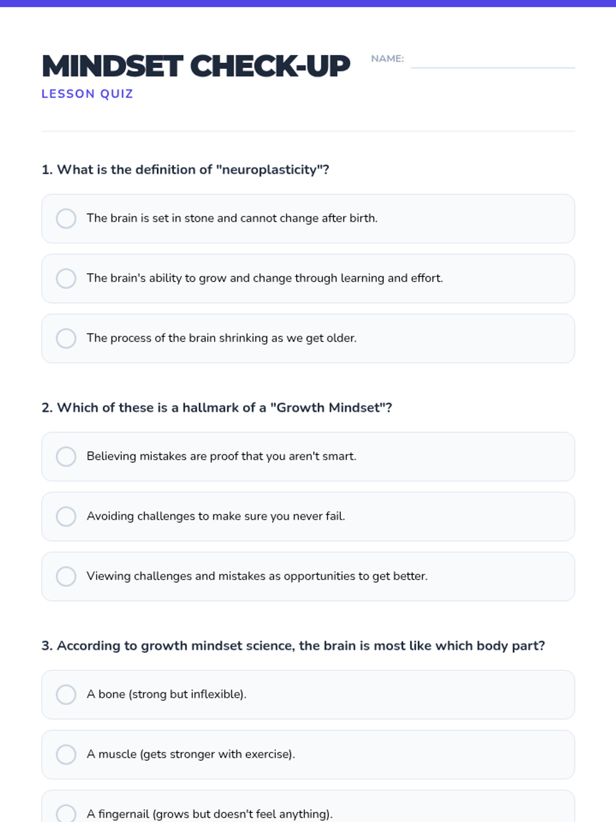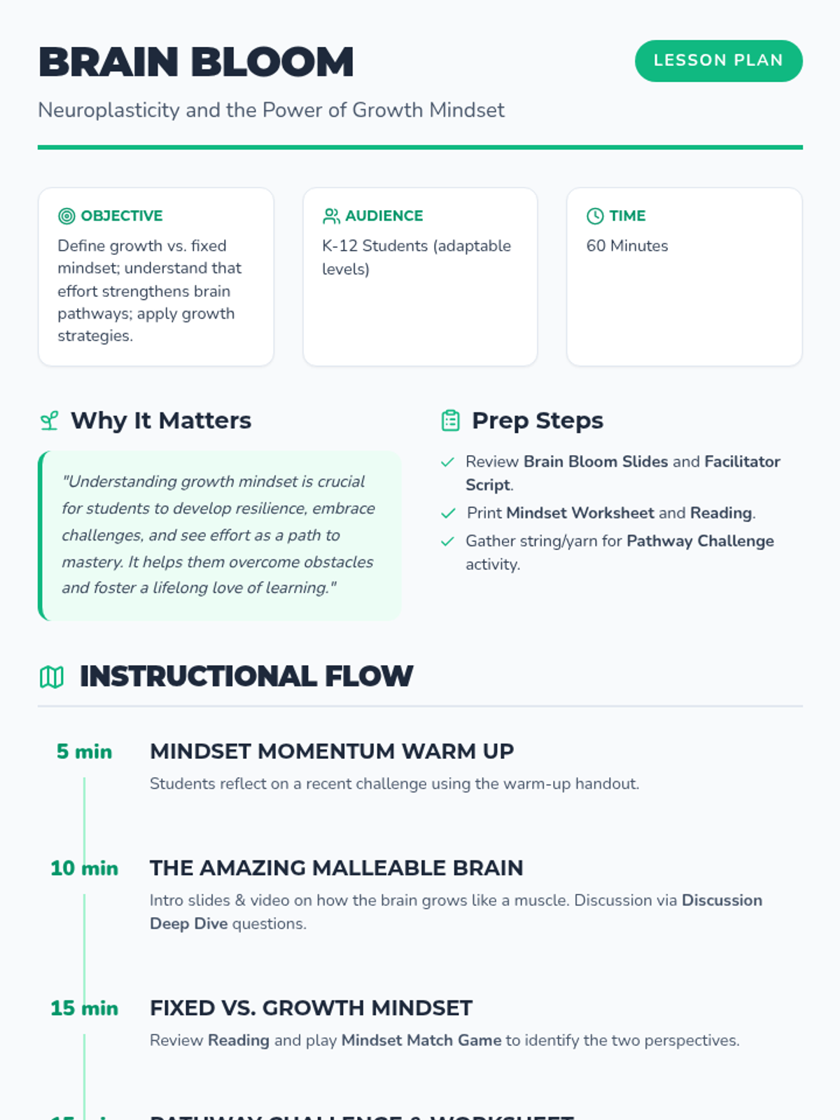 This lesson introduces students to the concept of a growth mindset, explaining the science of neuroplasticity and how effort and learning from mistakes can literally grow the brain. Students will apply these concepts to their own academic and personal challenges.