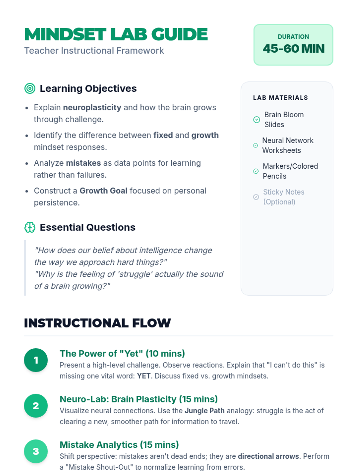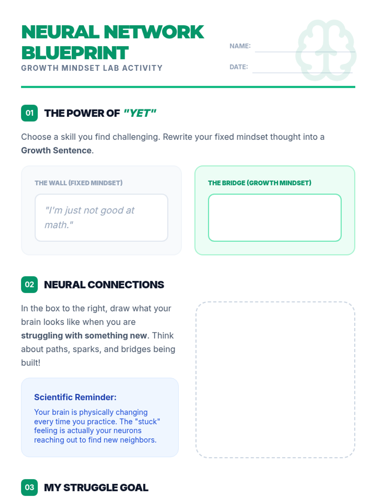 A comprehensive mini-lesson exploring the science of brain plasticity, the power of persistence, and the value of learning from mistakes. Students will develop a growth mindset by setting achievable goals and understanding how effort reshapes the brain.
