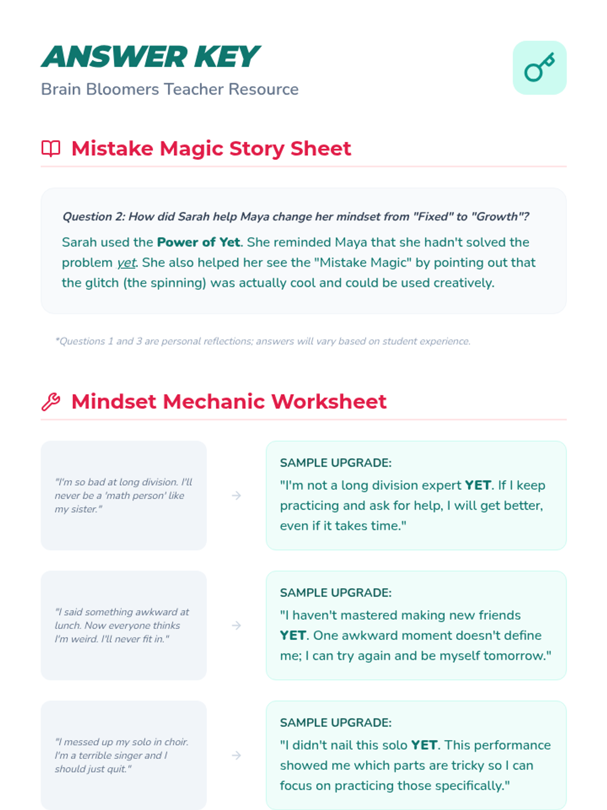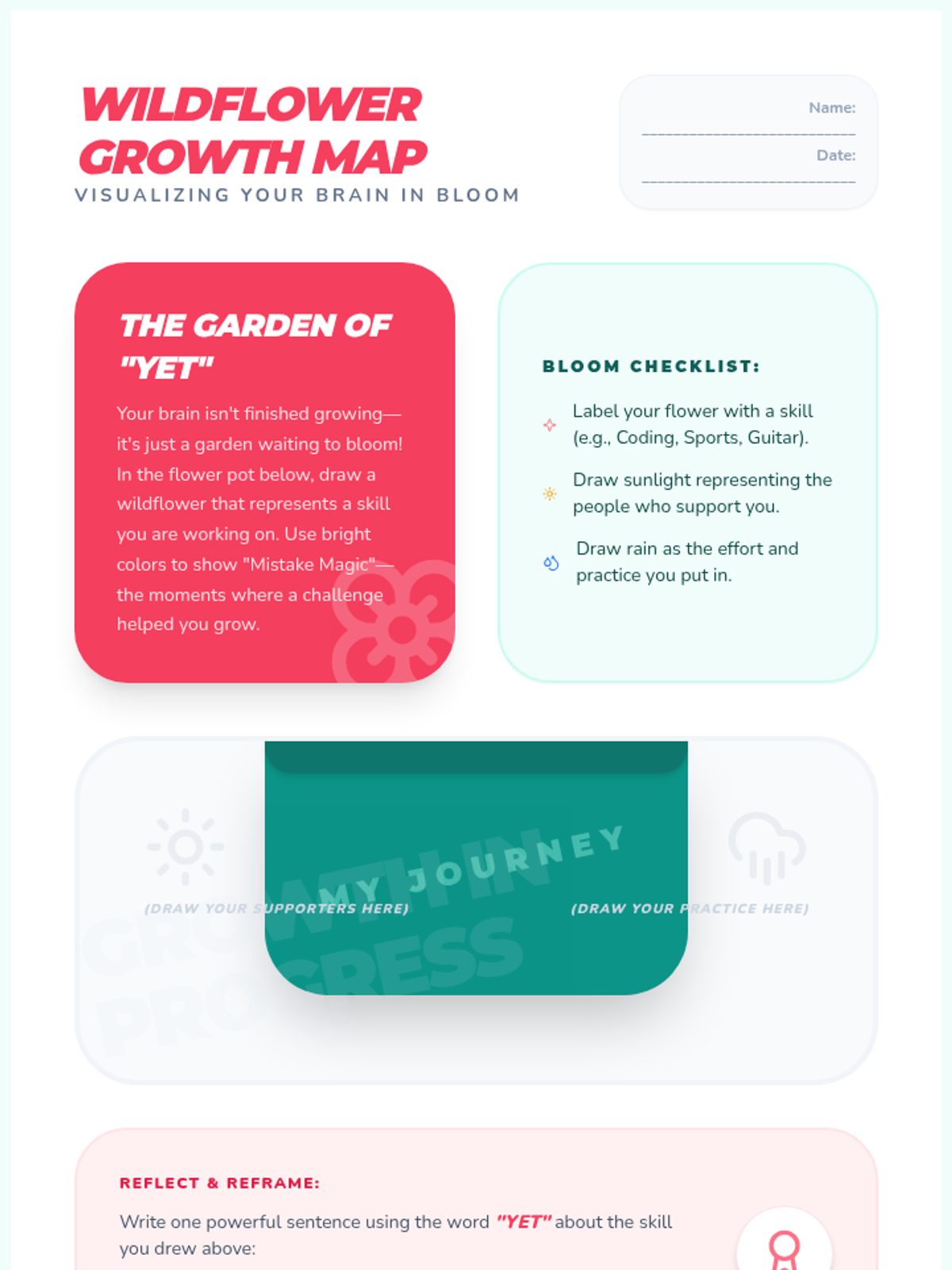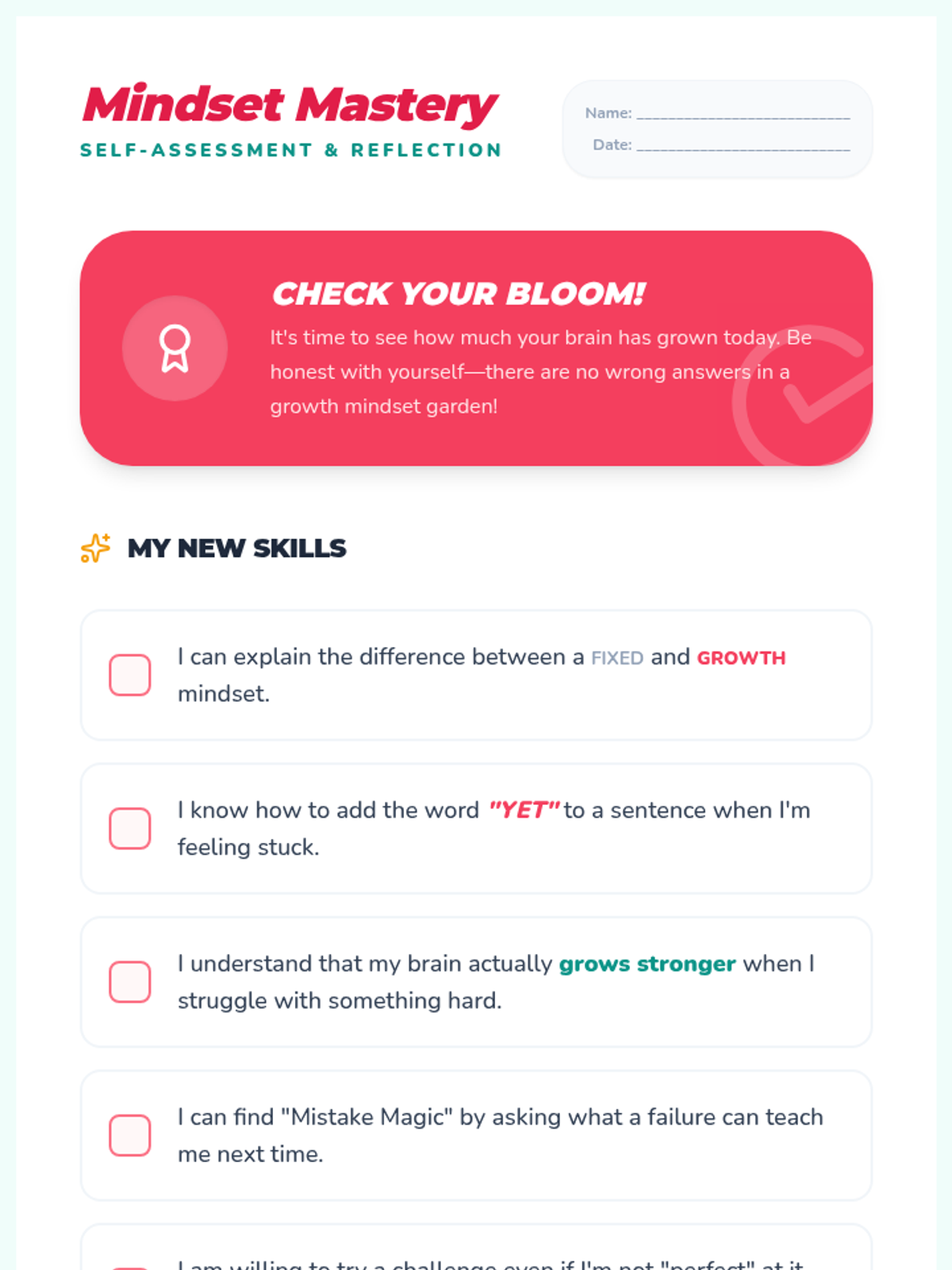 A comprehensive lesson on developing a growth mindset, focusing on the power of 'yet', embracing challenges, and learning from mistakes through storytelling, art, and role-play.