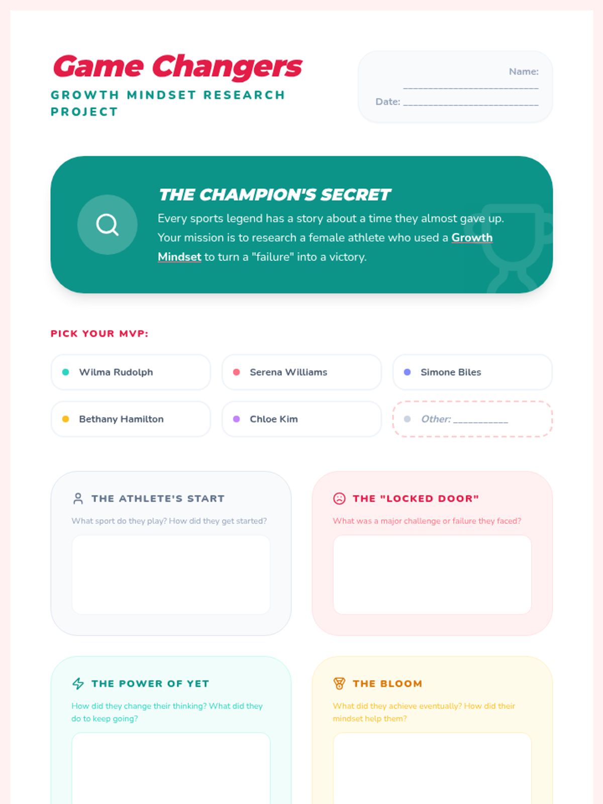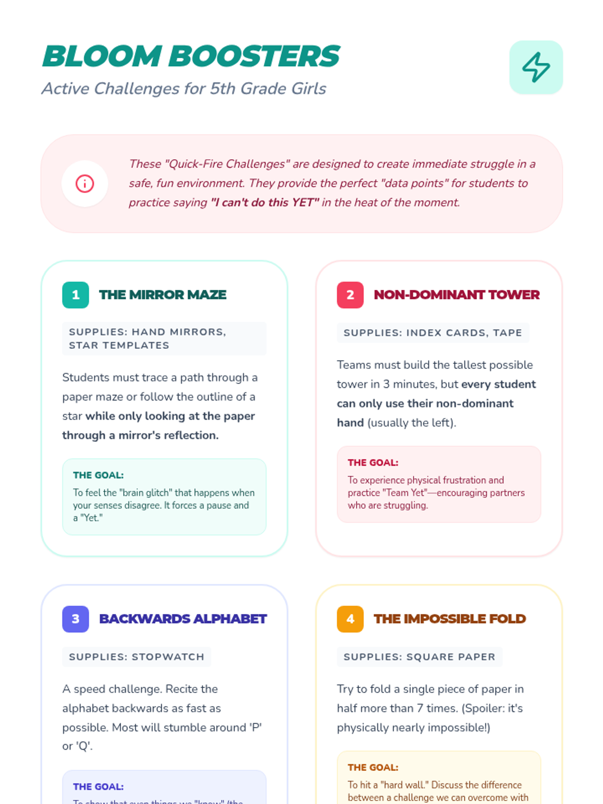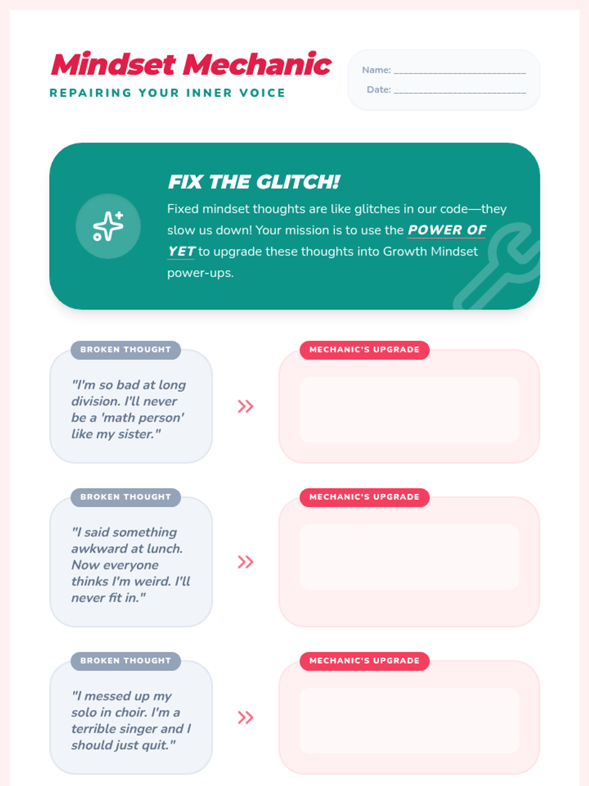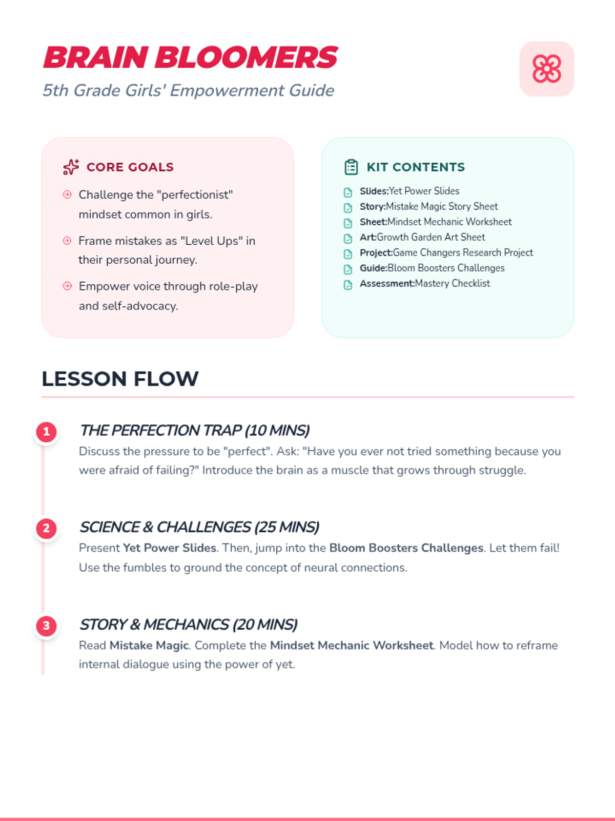 A comprehensive lesson on developing a growth mindset, focusing on the power of 'yet', embracing challenges, and learning from mistakes through storytelling, art, and role-play.