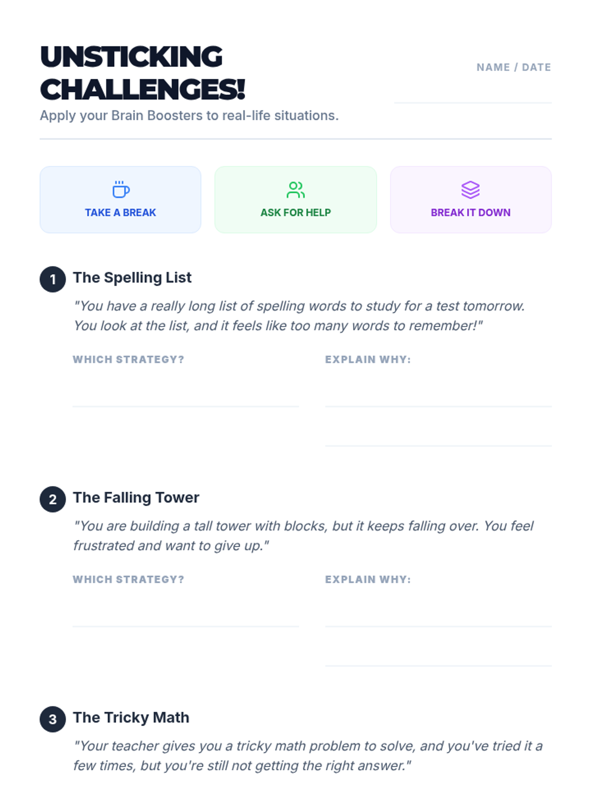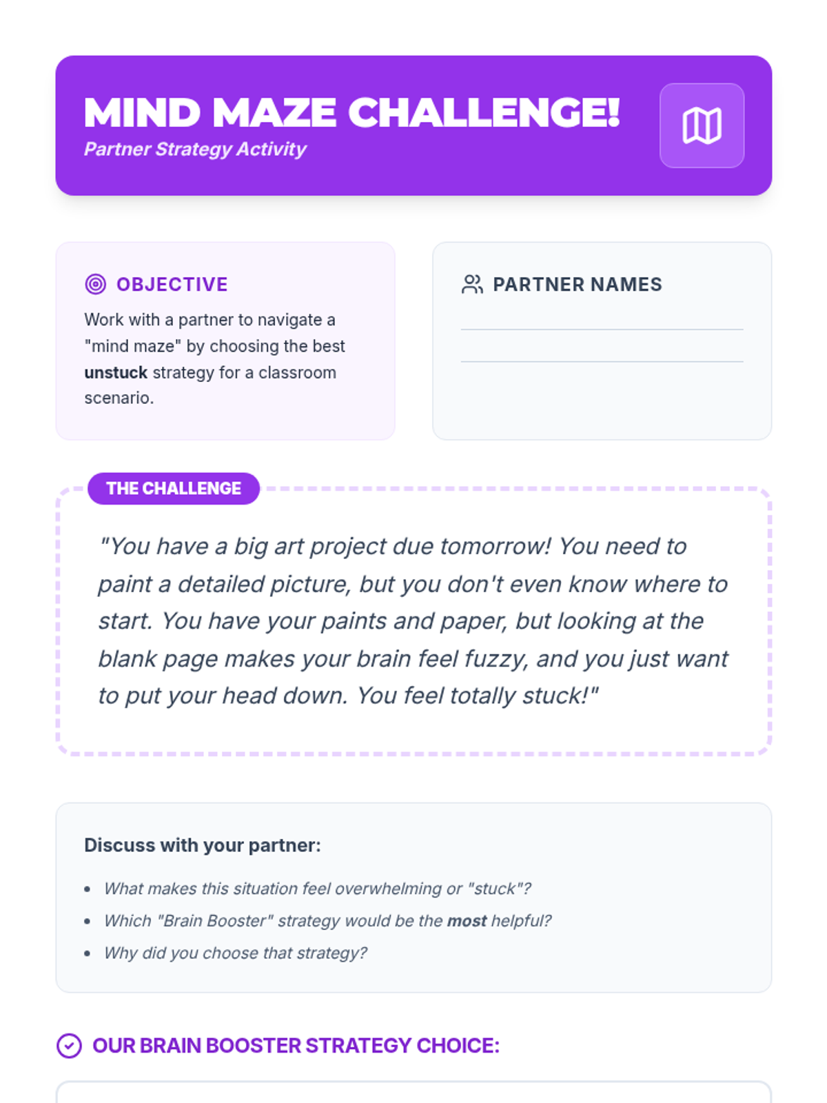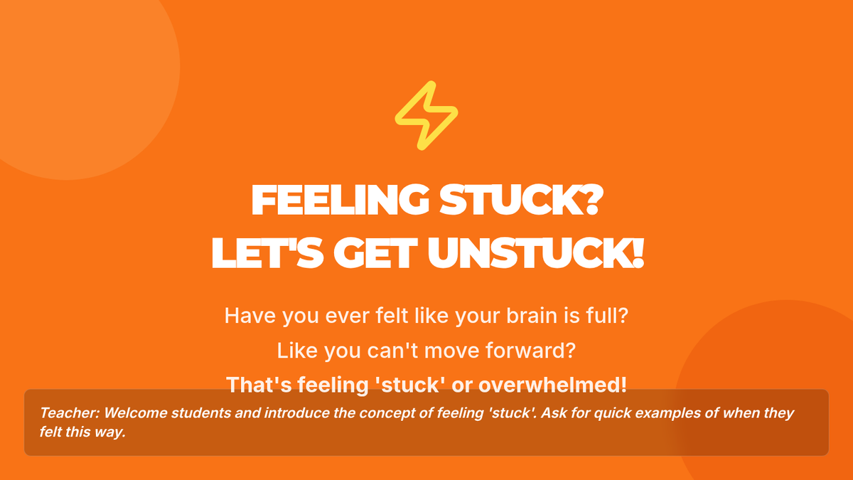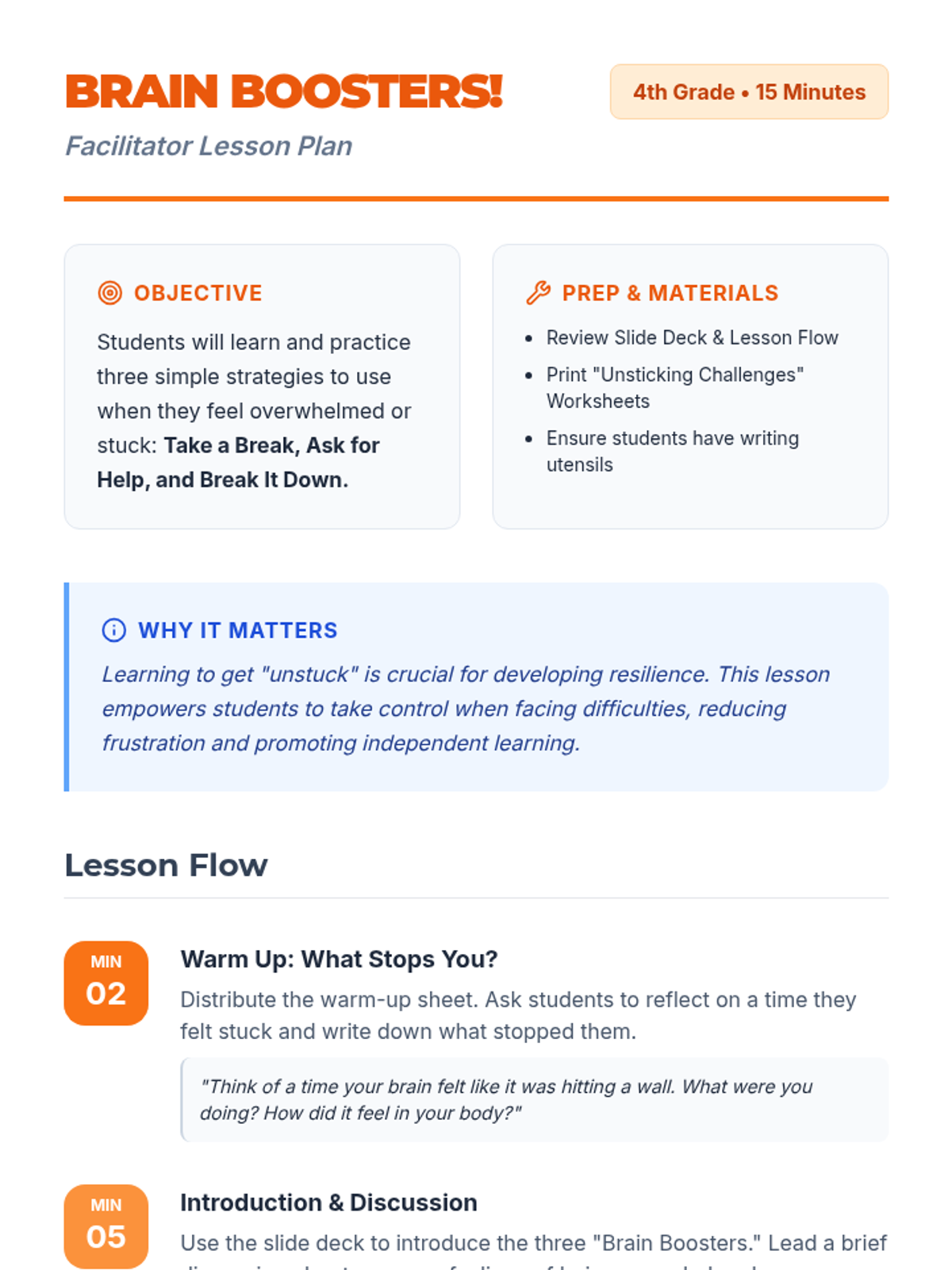 A 15-minute lesson for 4th graders on strategies to overcome feeling overwhelmed and 'stuck' using 'Brain Booster' techniques.
