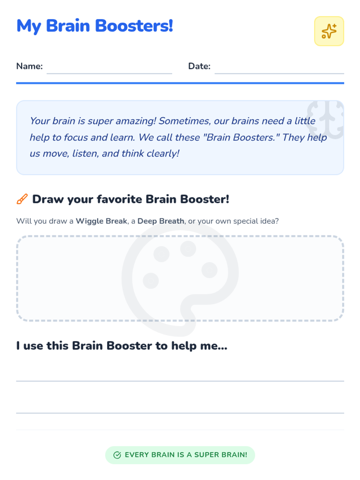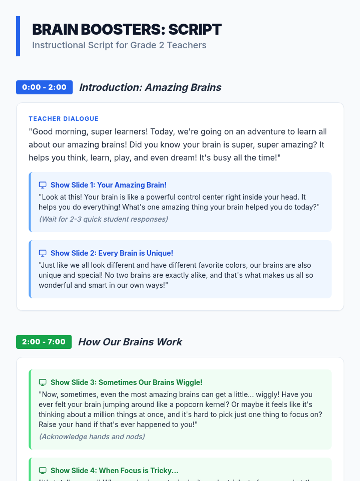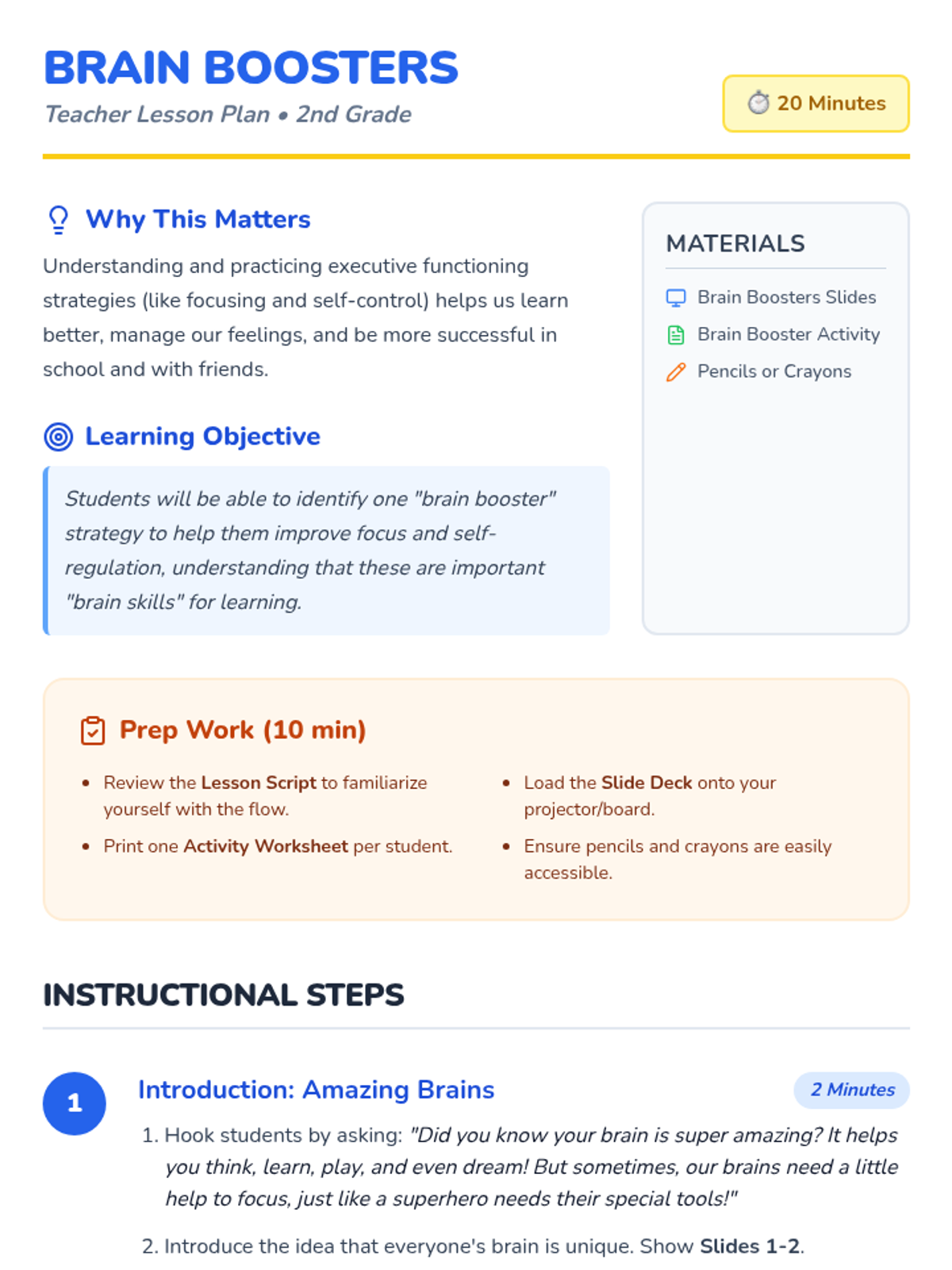 A 20-minute lesson for 2nd graders introducing executive functioning strategies through the concept of 'Brain Boosters' to help students understand unique learning needs and improve focus.