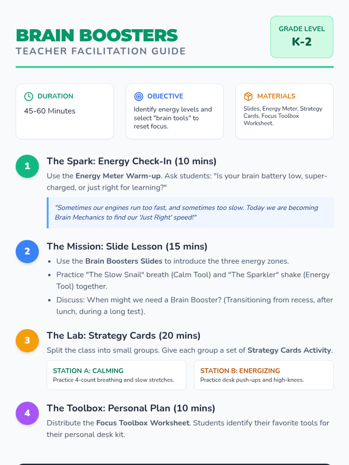 A lesson designed for K-2 students to learn and practice self-regulation techniques. It focuses on recognizing body energy levels and using specific tools—like breathing and movement—to stay focused and ready to learn.