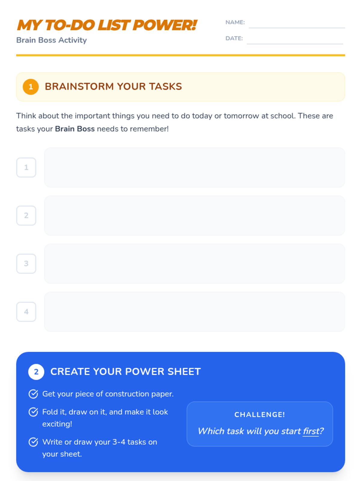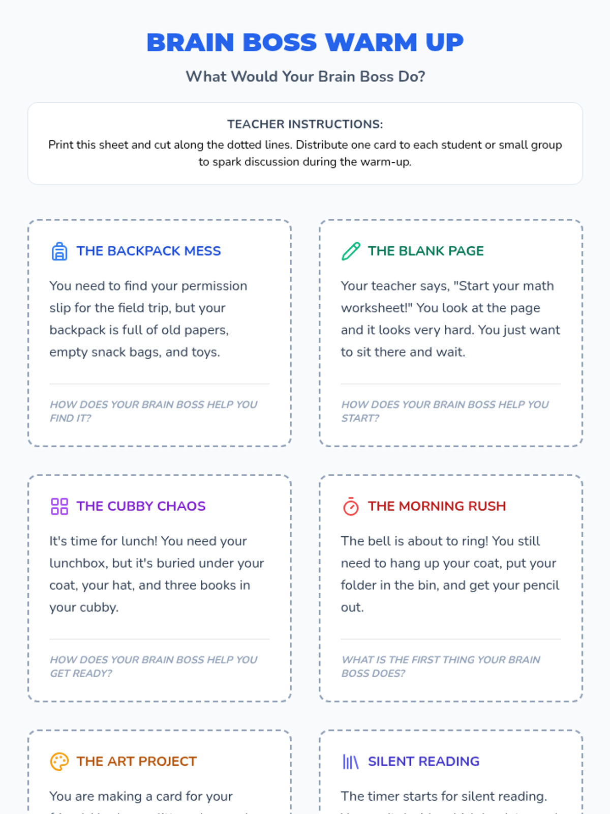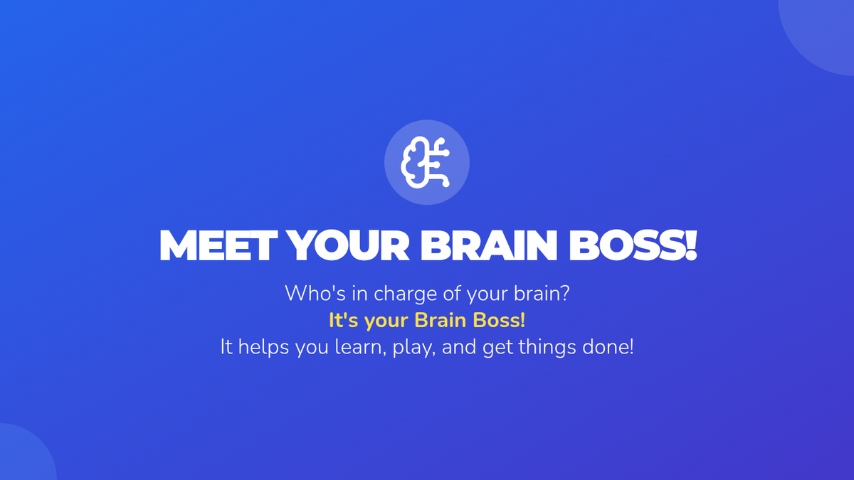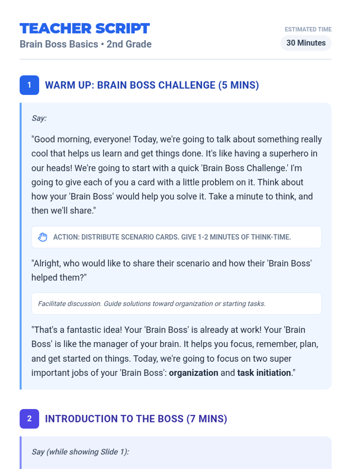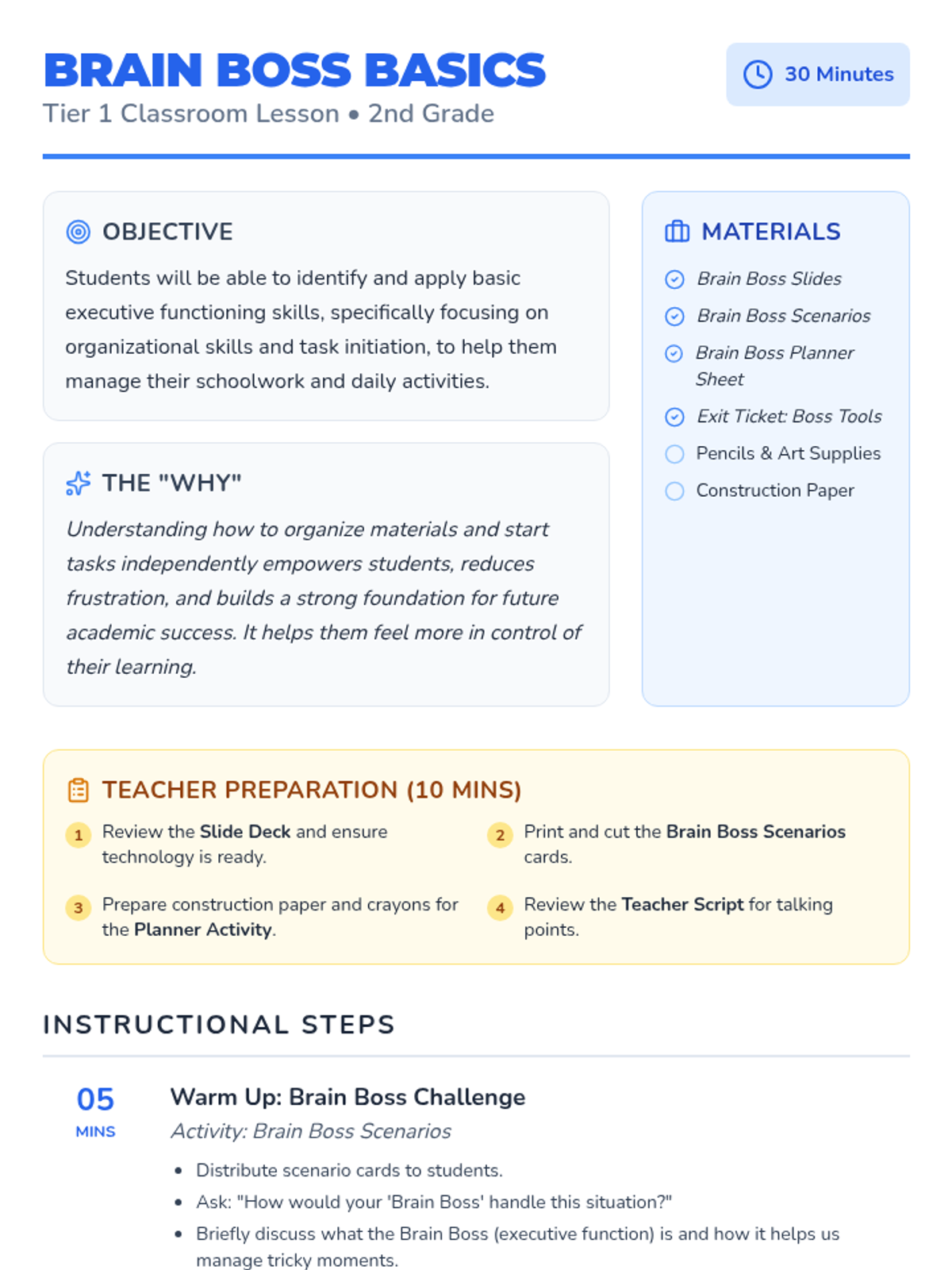 A 30-minute lesson for 2nd graders introducing the 'Brain Boss' (executive functioning), focusing on organization and task initiation through interactive scenarios and to-do list creation.