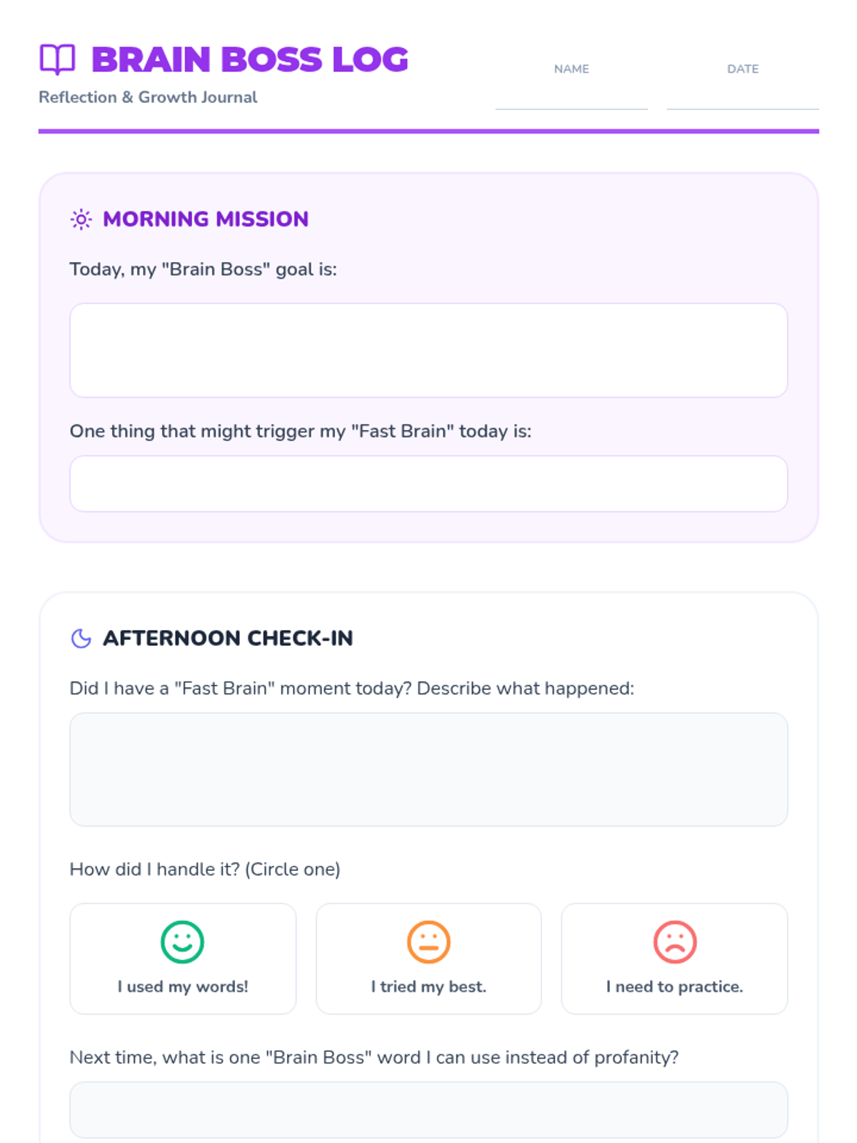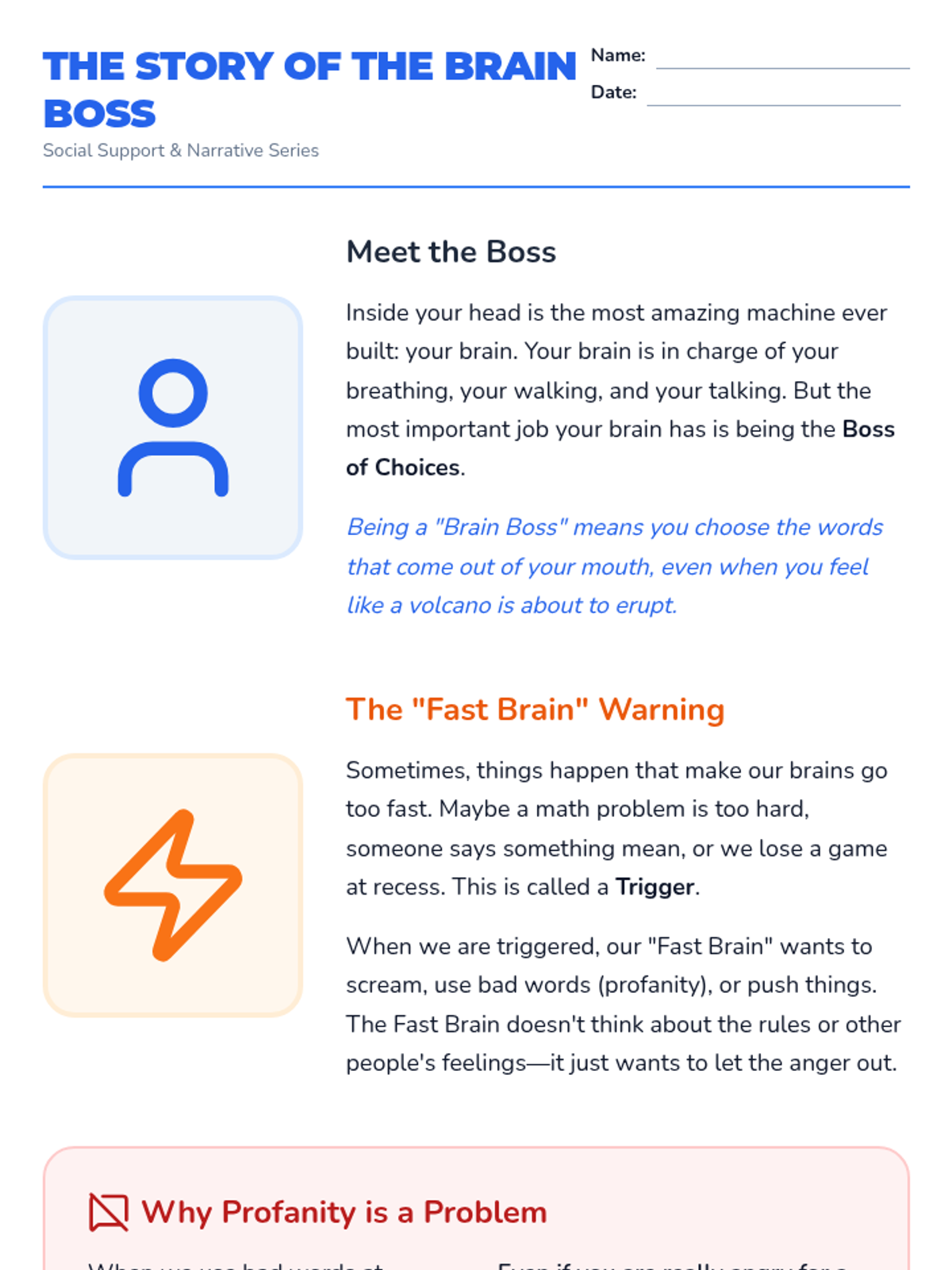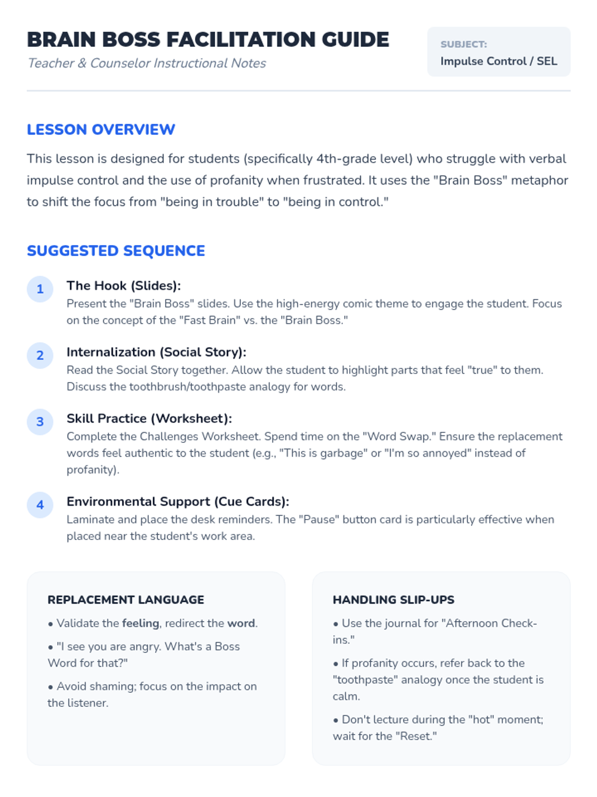 A comprehensive social-emotional learning lesson designed for 4th-grade students to manage impulse control and replace profanity with appropriate school-based language. The lesson focuses on identifying triggers, understanding social impact, and practicing self-regulation strategies.