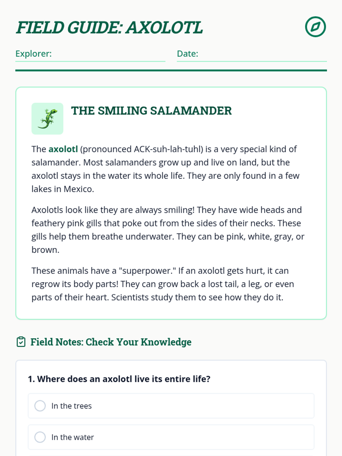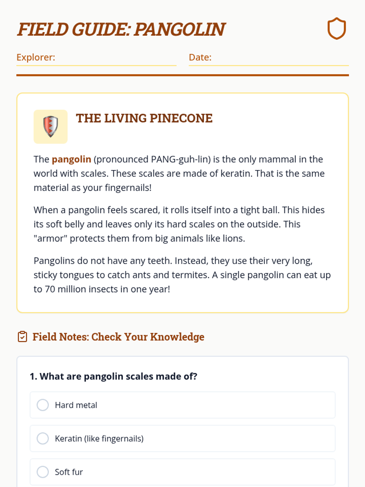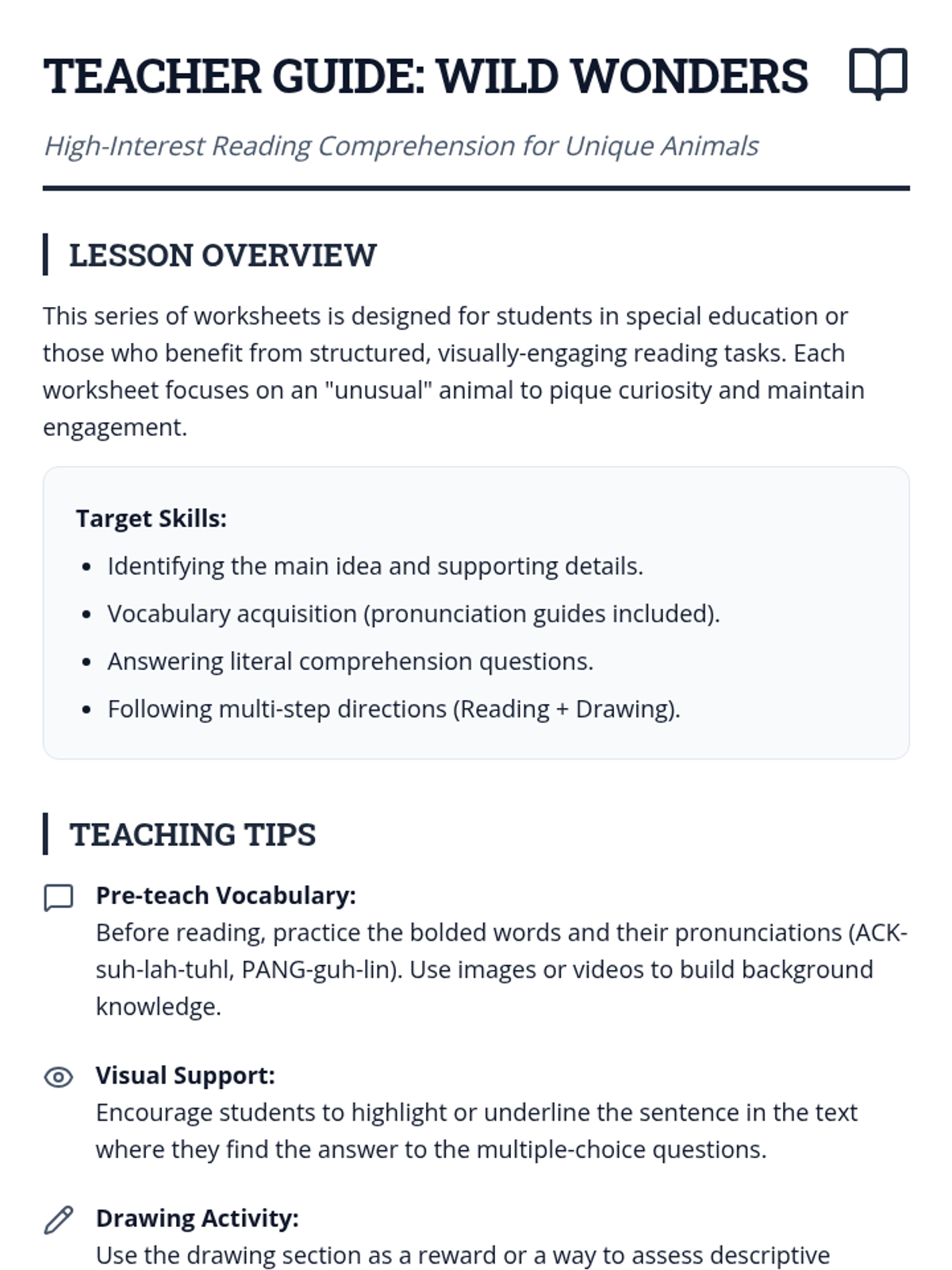 A collection of high-interest reading comprehension worksheets featuring unique animals, designed for accessibility and engagement. Each worksheet includes a short non-fiction passage and multiple-choice questions.