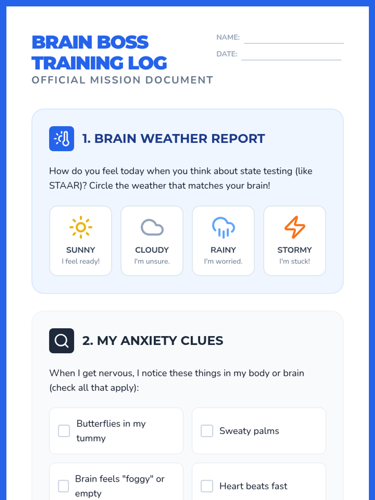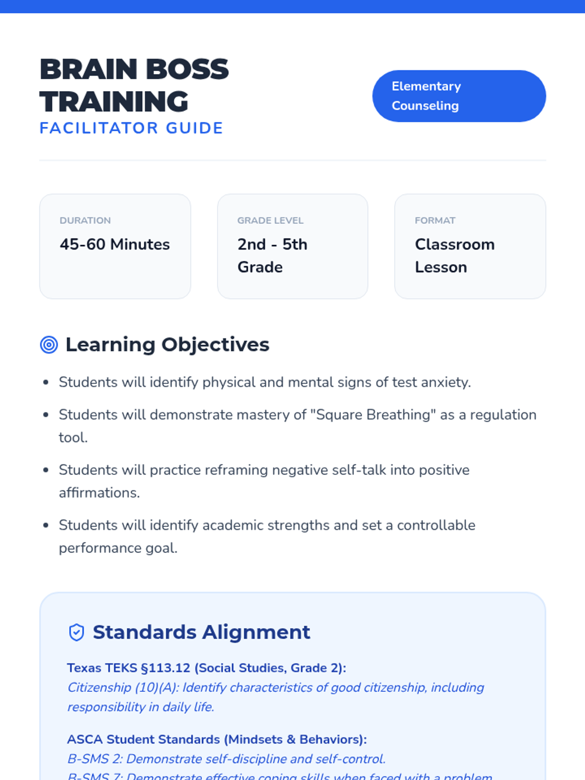 This lesson empowers elementary students to manage test anxiety through social-emotional learning strategies like breathing techniques, positive self-talk, and goal setting. It aligns with Texas standards for citizenship and personal responsibility, helping students feel confident and prepared for state assessments.