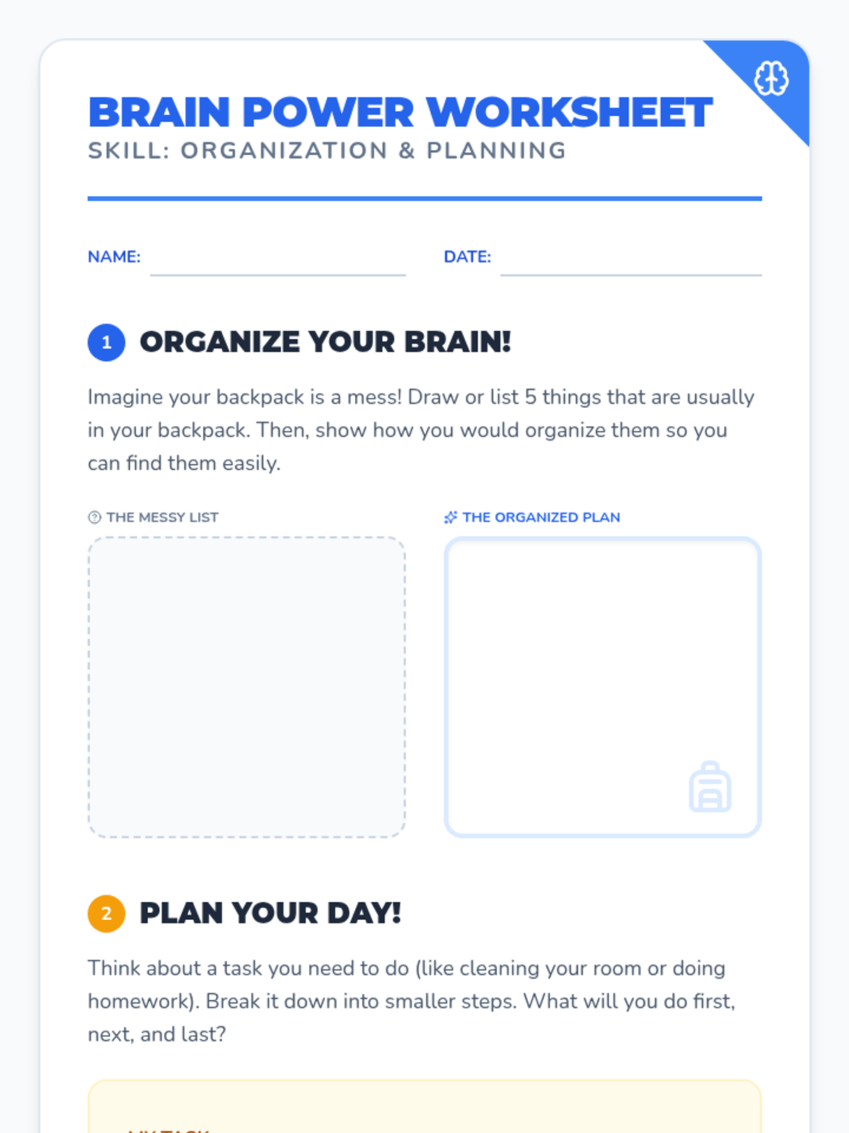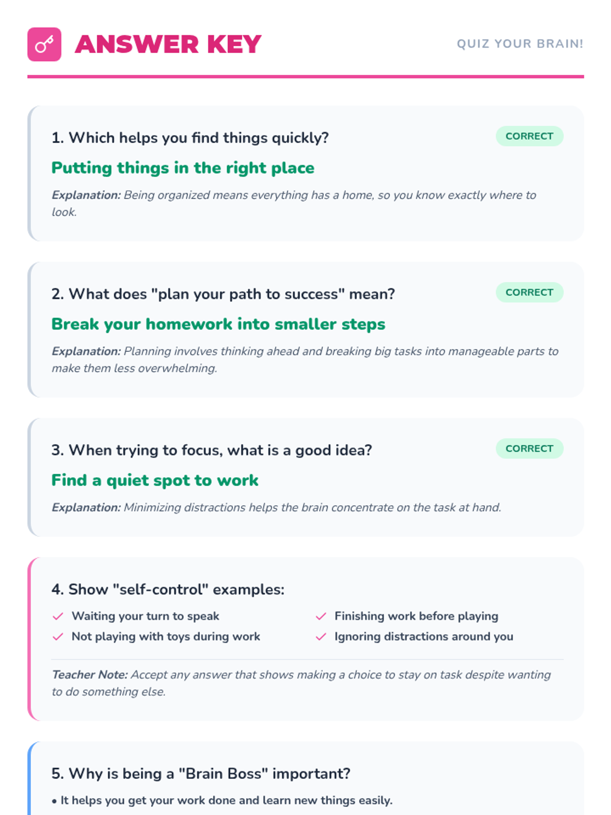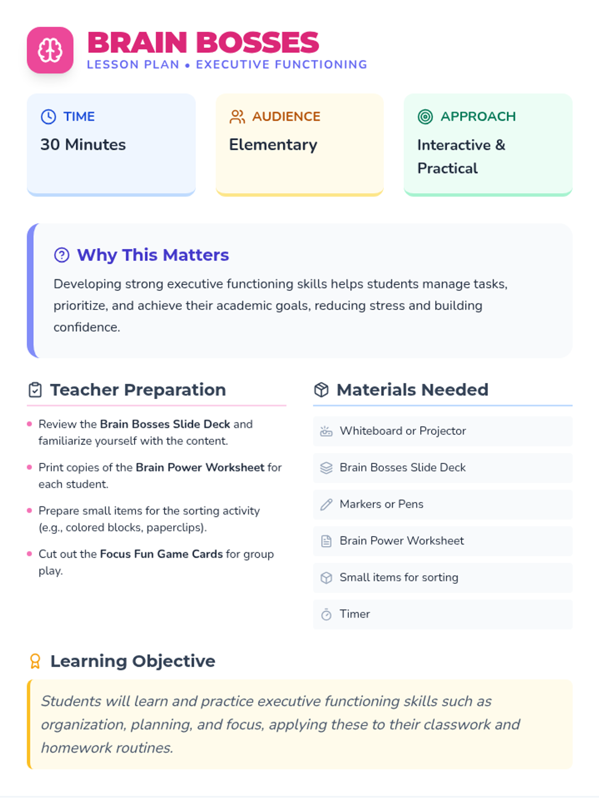 A 30-minute lesson for elementary students to develop executive functioning skills like organization, planning, and focus through interactive activities and practical strategies.