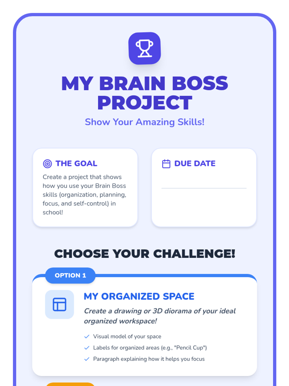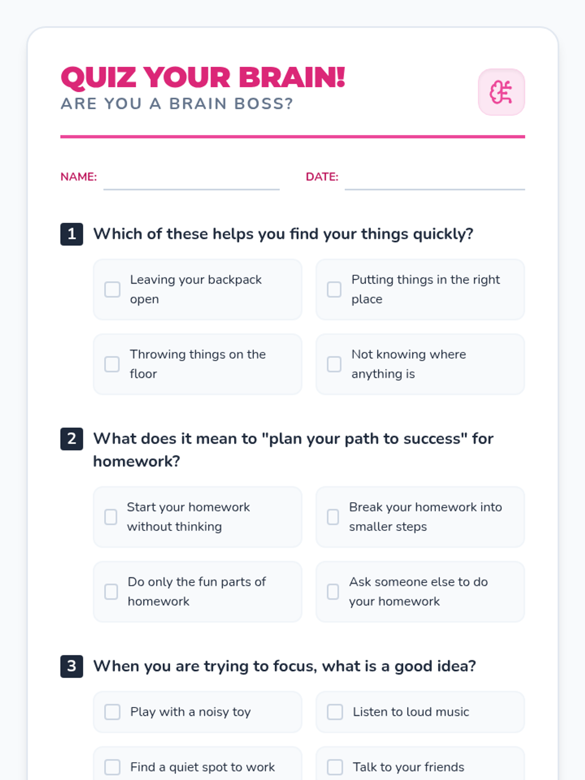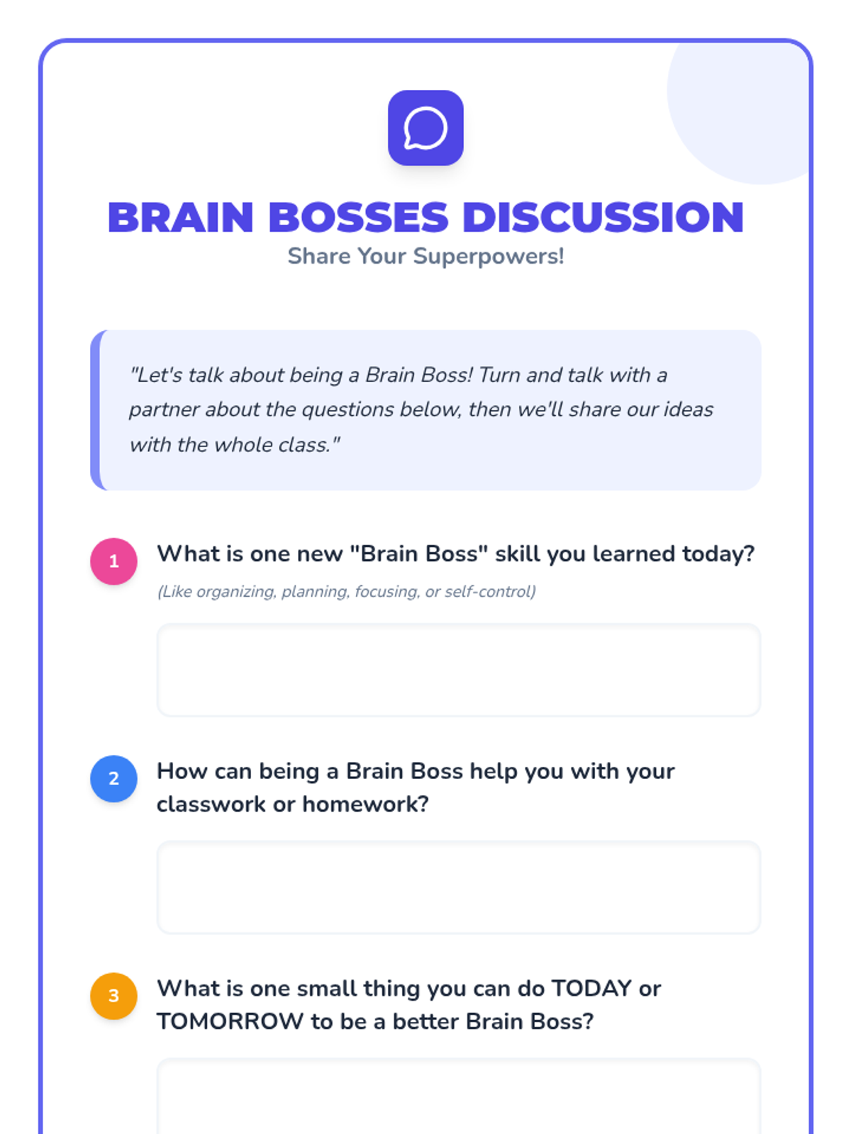 A 30-minute lesson for elementary students to develop executive functioning skills like organization, planning, and focus through interactive activities and practical strategies.