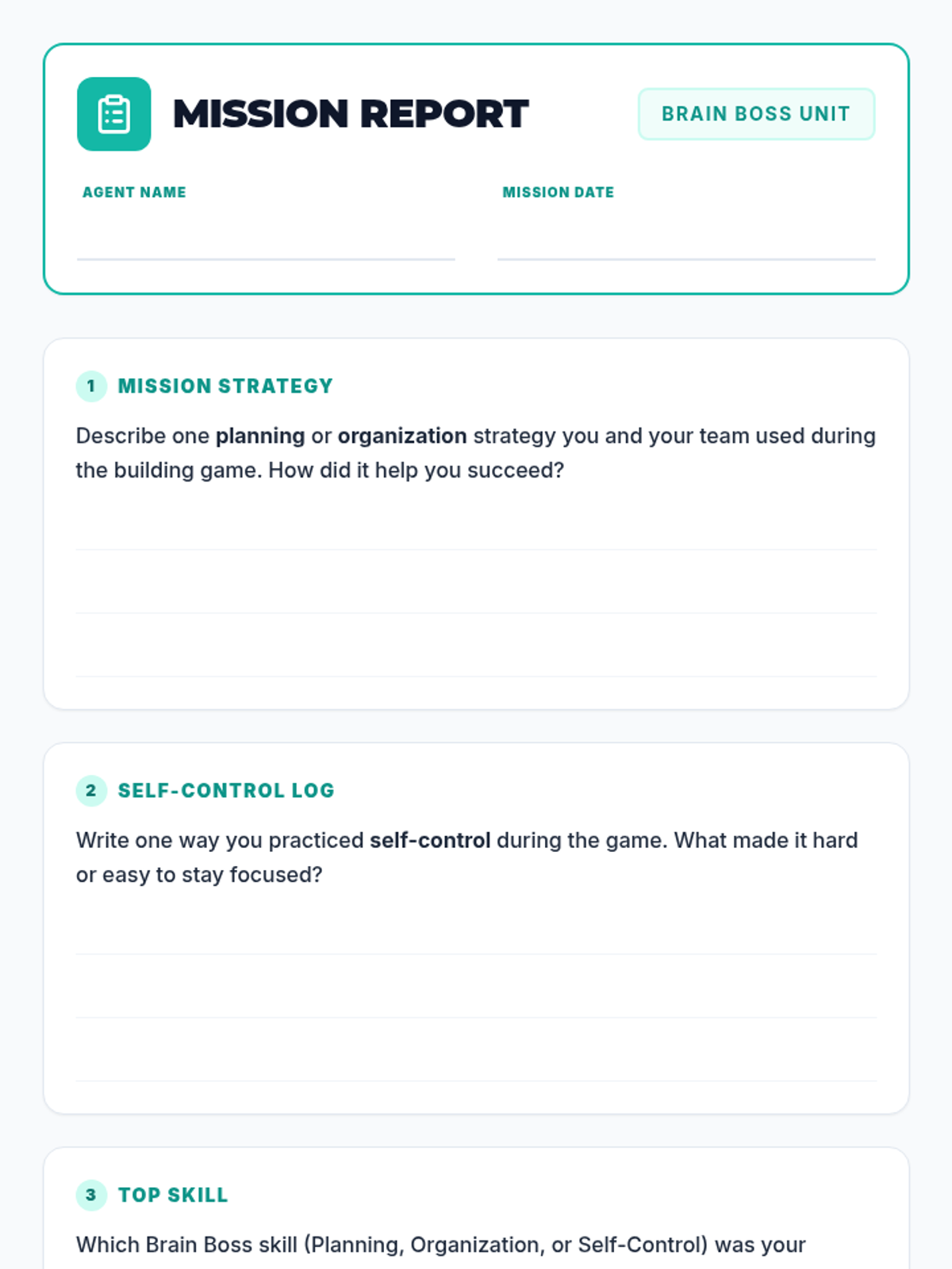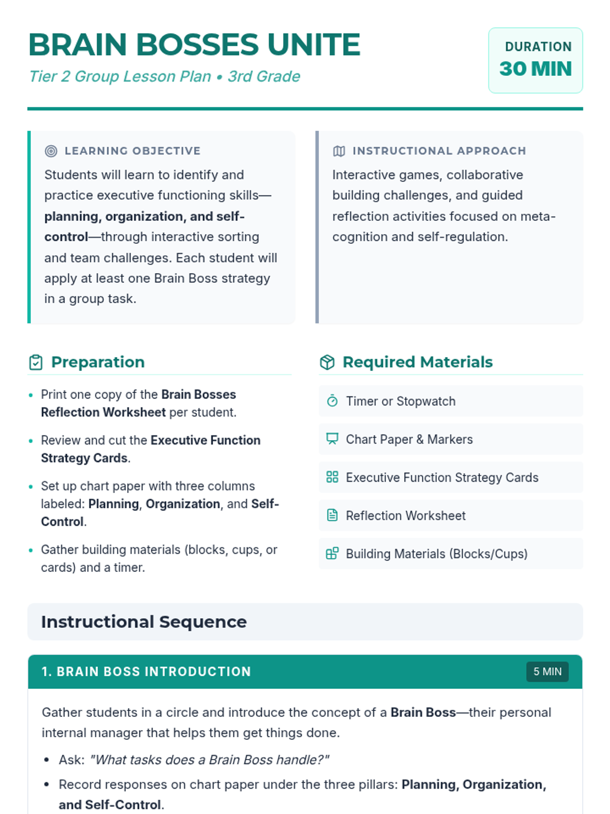 A 30-minute Tier 2 group session for 3rd graders to explore and strengthen executive functioning skills like planning, organization, and self-control through games and reflection.
