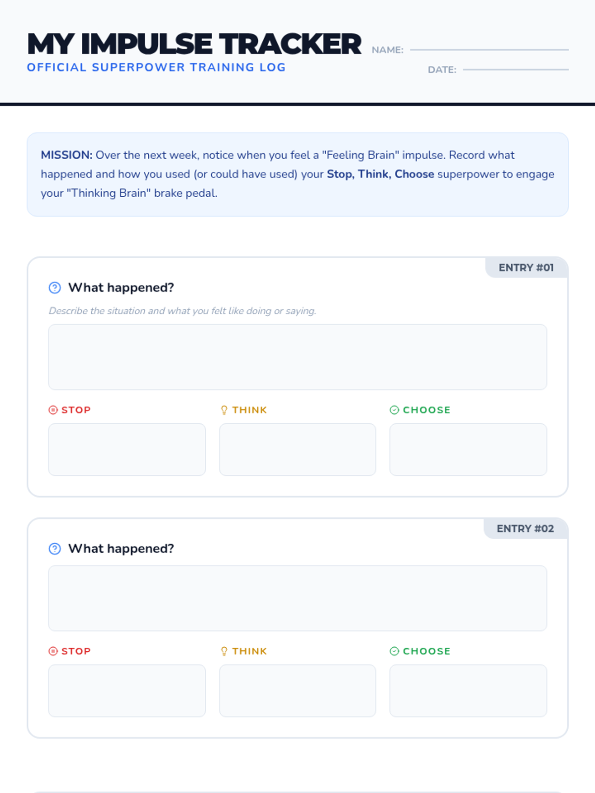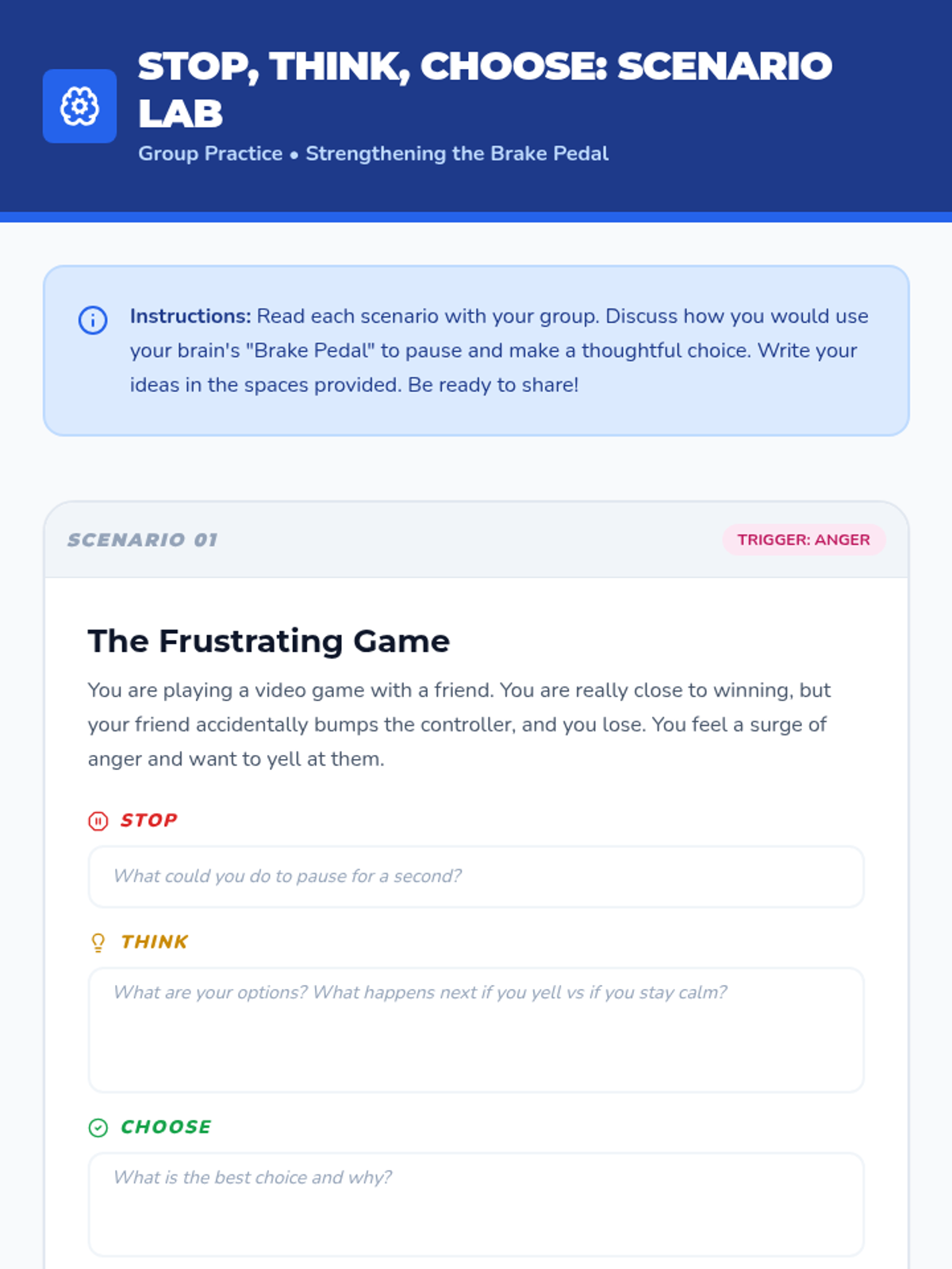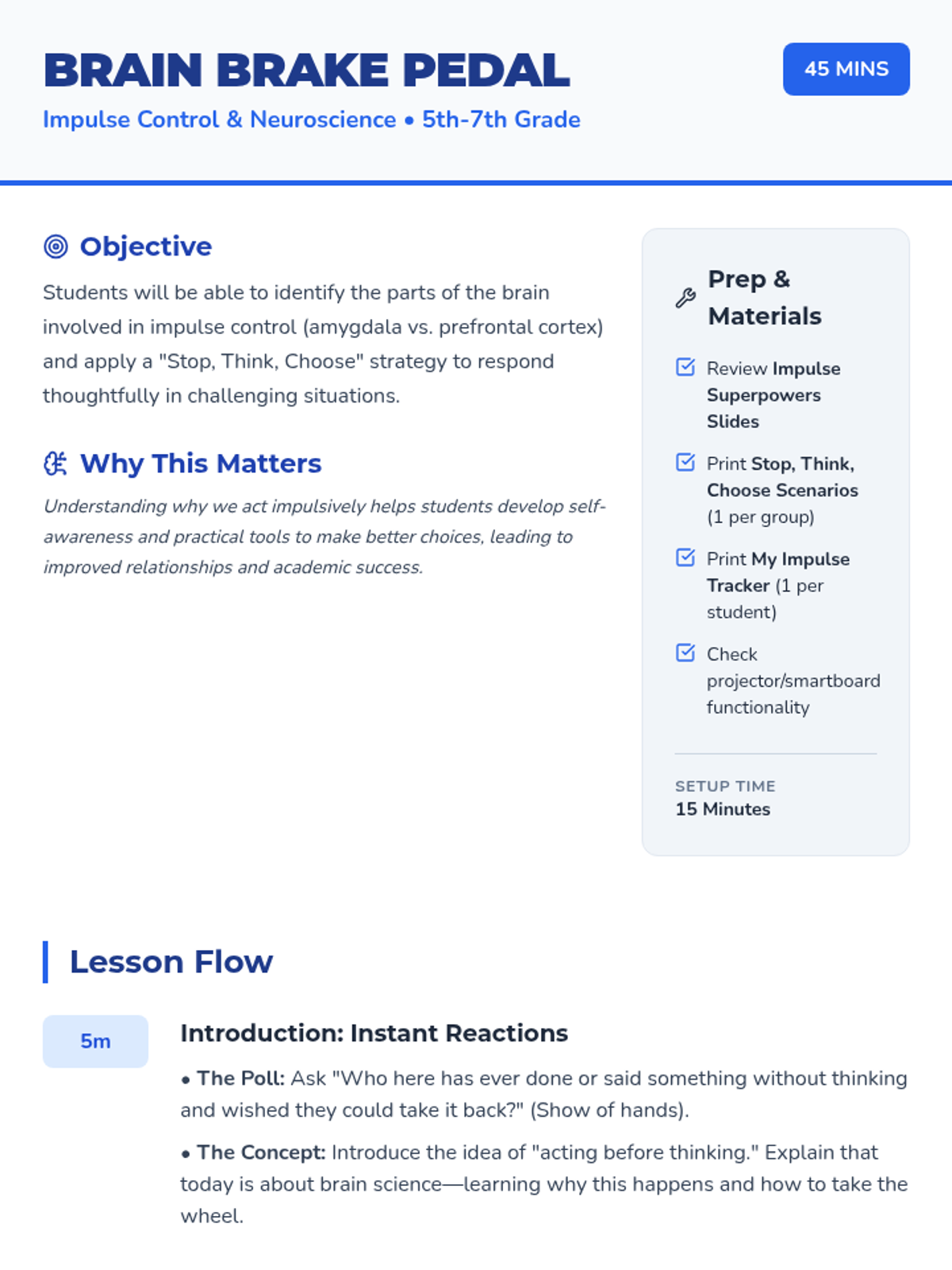 A 45-minute lesson for 5th-7th graders exploring the neuroscience of impulse control through the 'Thinking Brain' and 'Feeling Brain' analogy. Students learn the 'Stop, Think, Choose' strategy to manage impulsive reactions.