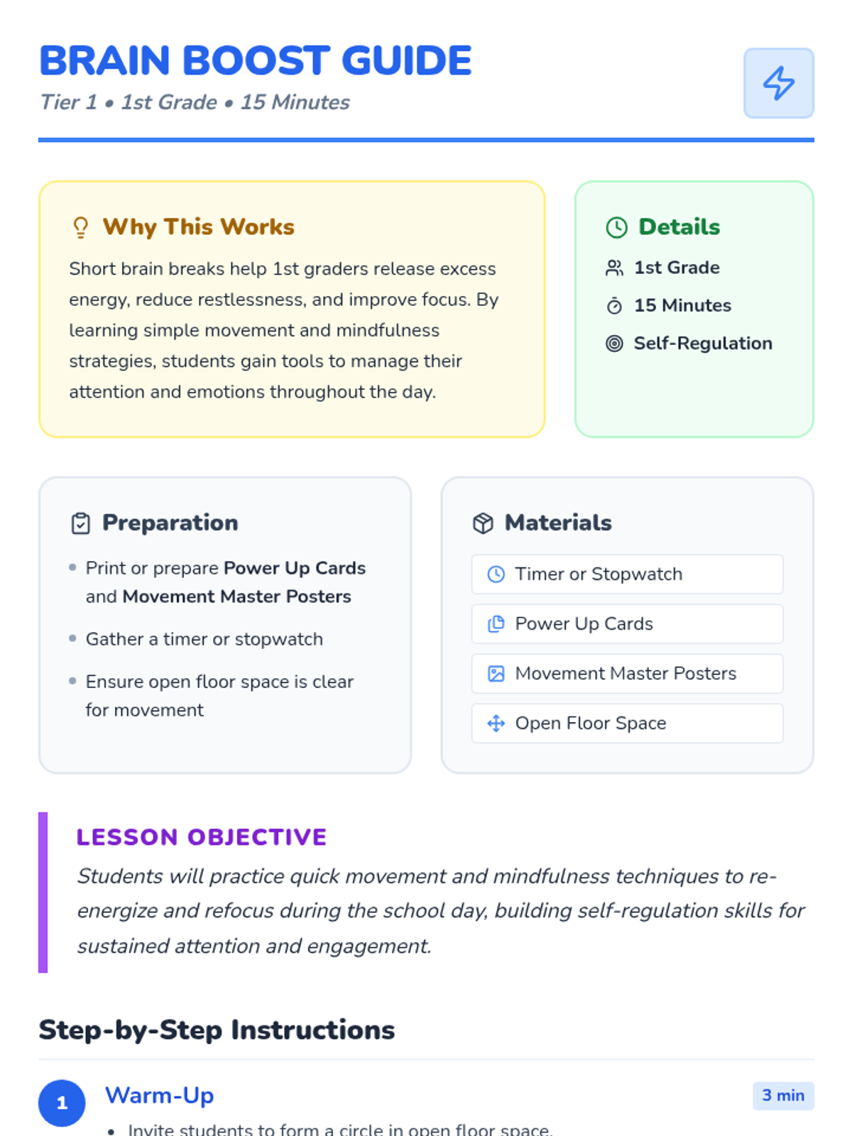 A fun, 15-minute Tier 1 lesson for 1st graders to boost focus and self-regulation through quick movement and mindfulness exercises.