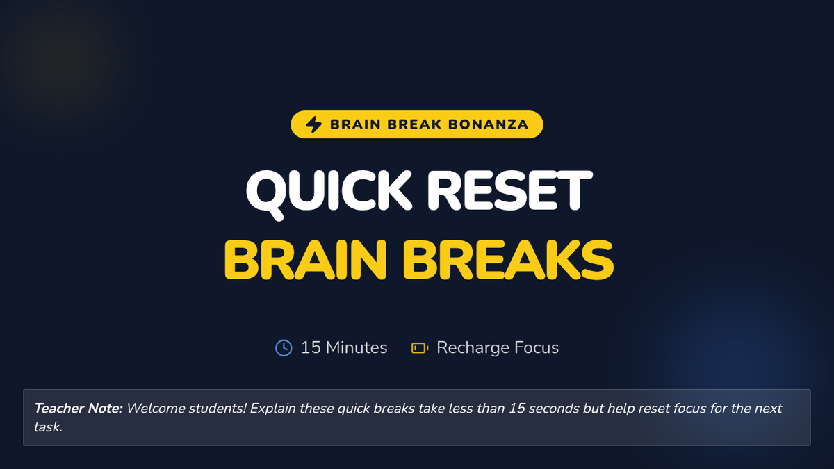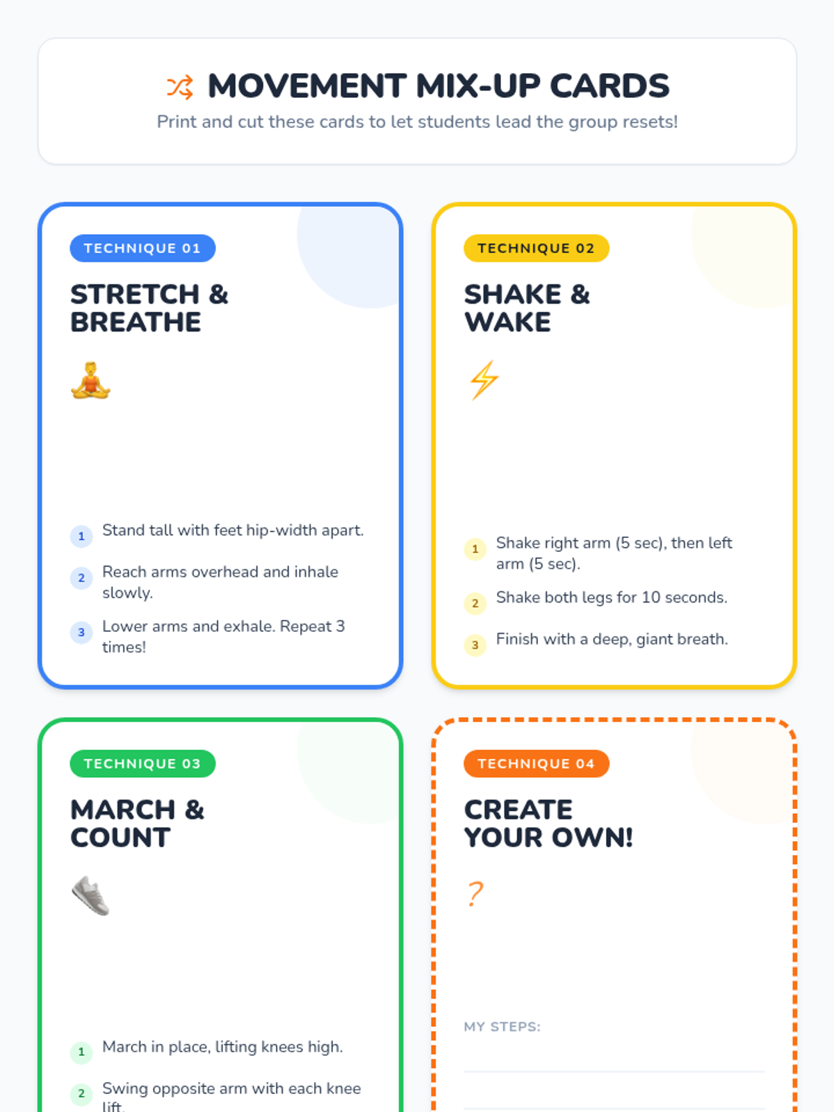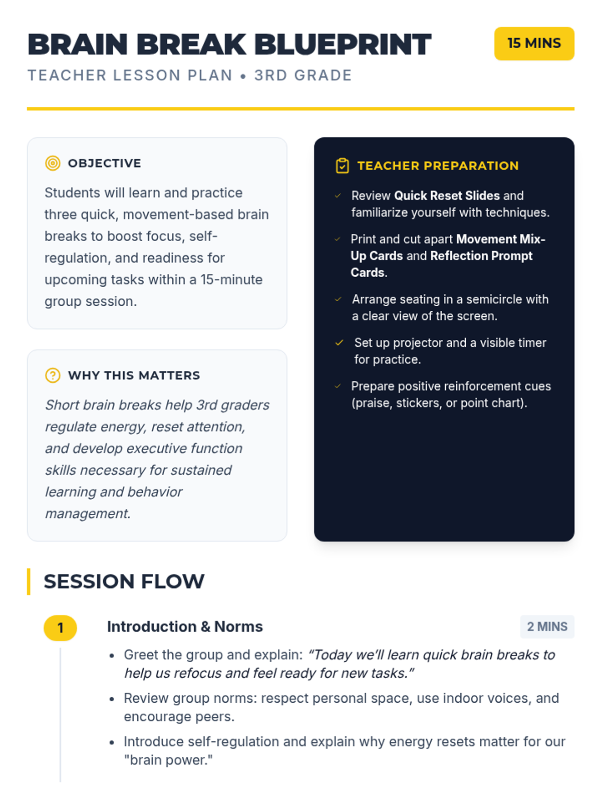 A quick 15-minute small-group session for 3rd graders focused on learning and practicing movement-based brain breaks to improve focus and self-regulation.