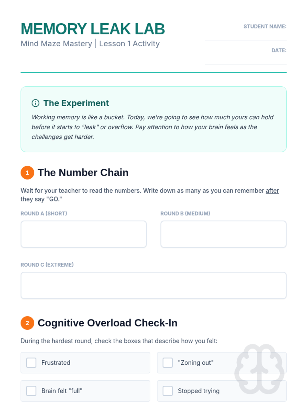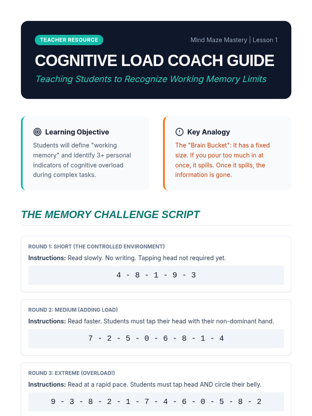Students explore the concept of working memory through the 'brain bucket' analogy, identifying personal limits when processing information. Through interactive challenges, they experience cognitive overload firsthand and learn to recognize their own internal signs of saturation.