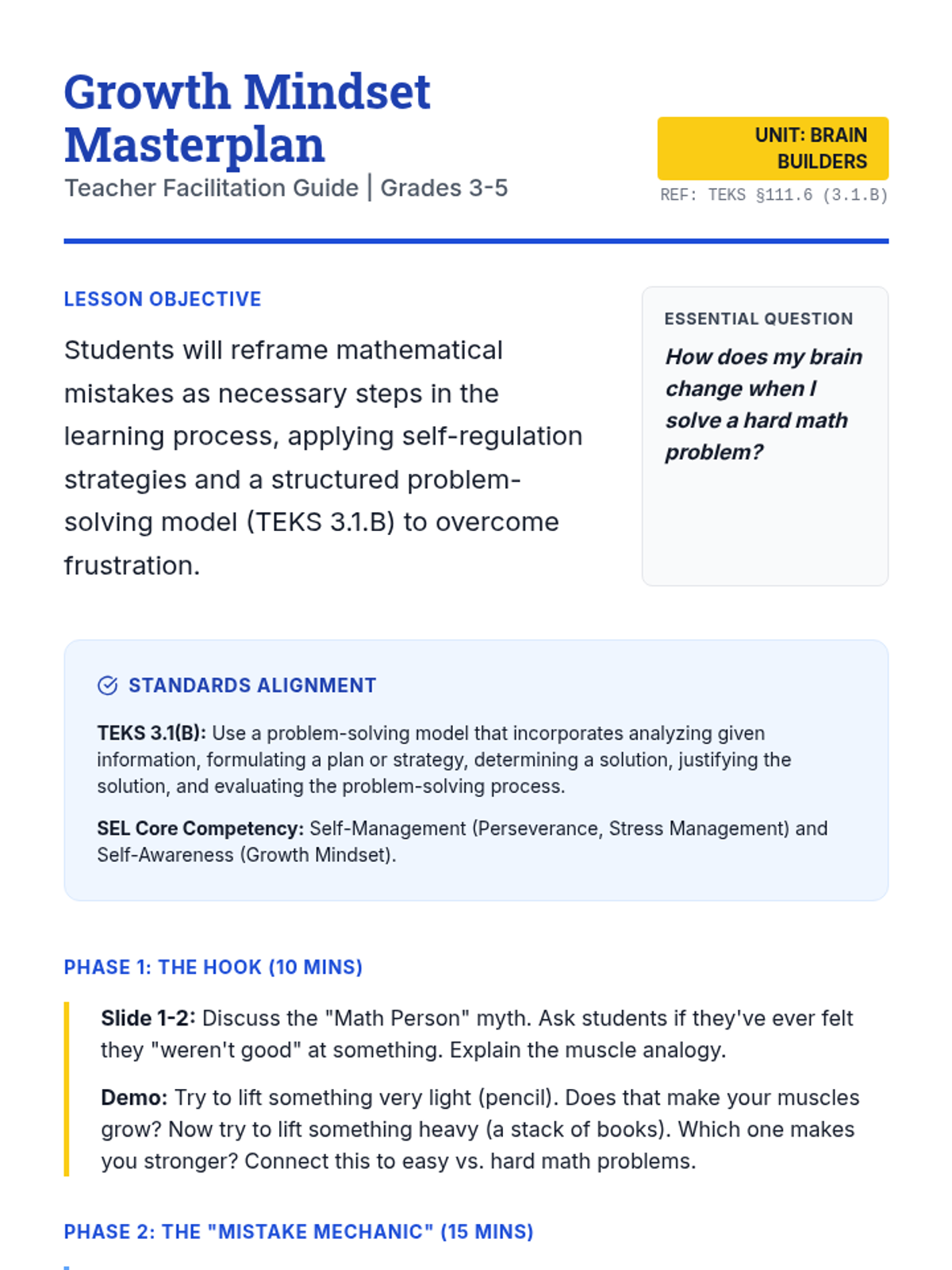 A growth mindset lesson for grades 3-5 focused on reframing mistakes as learning opportunities in mathematics, aligned with TEKS 111.6 problem-solving standards.