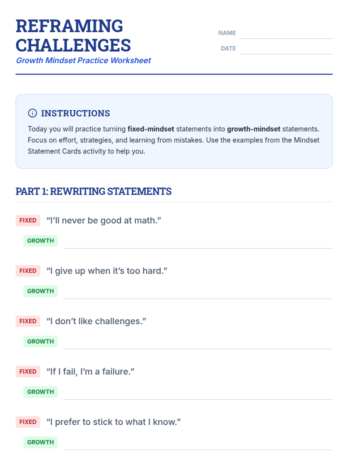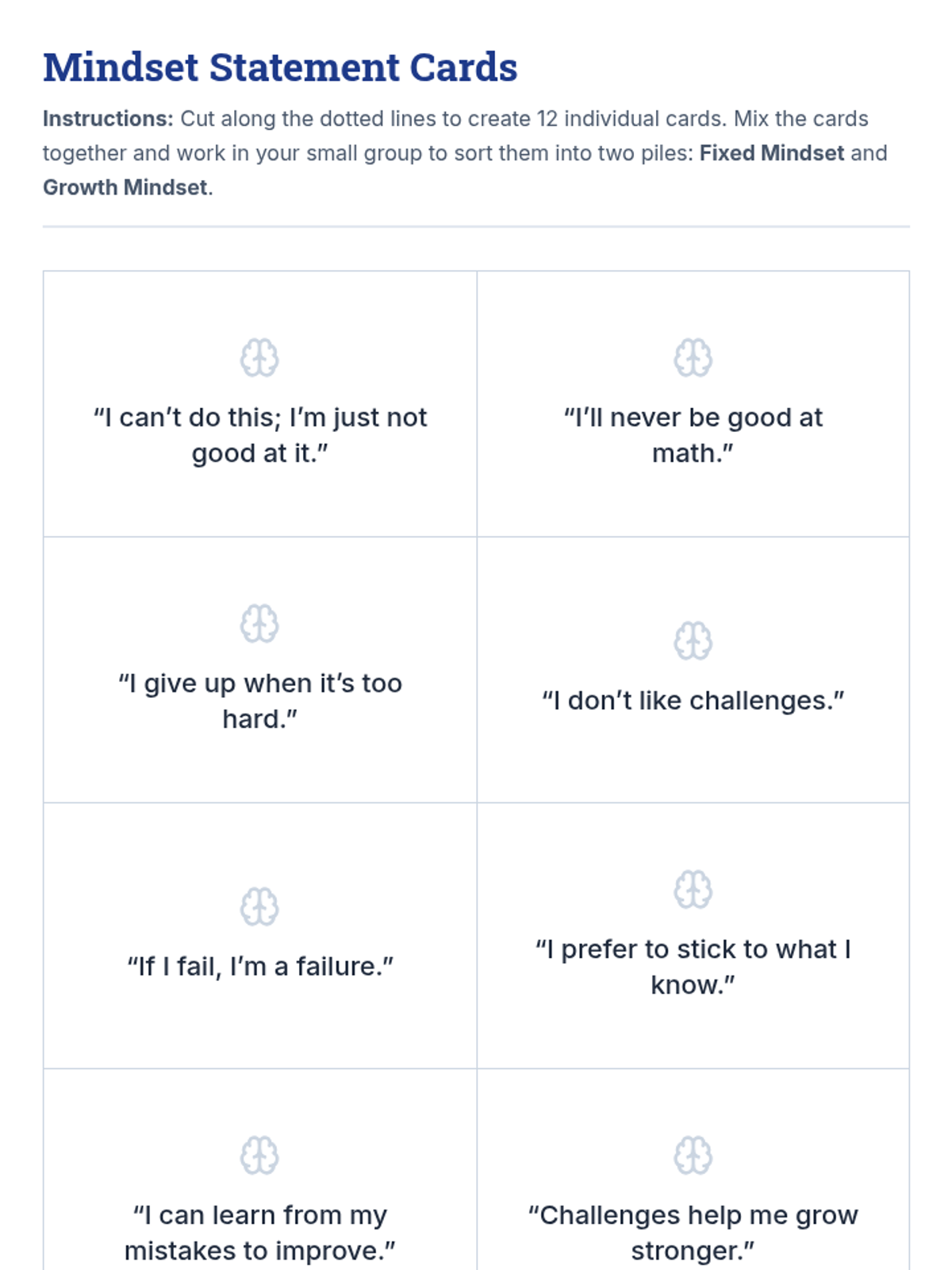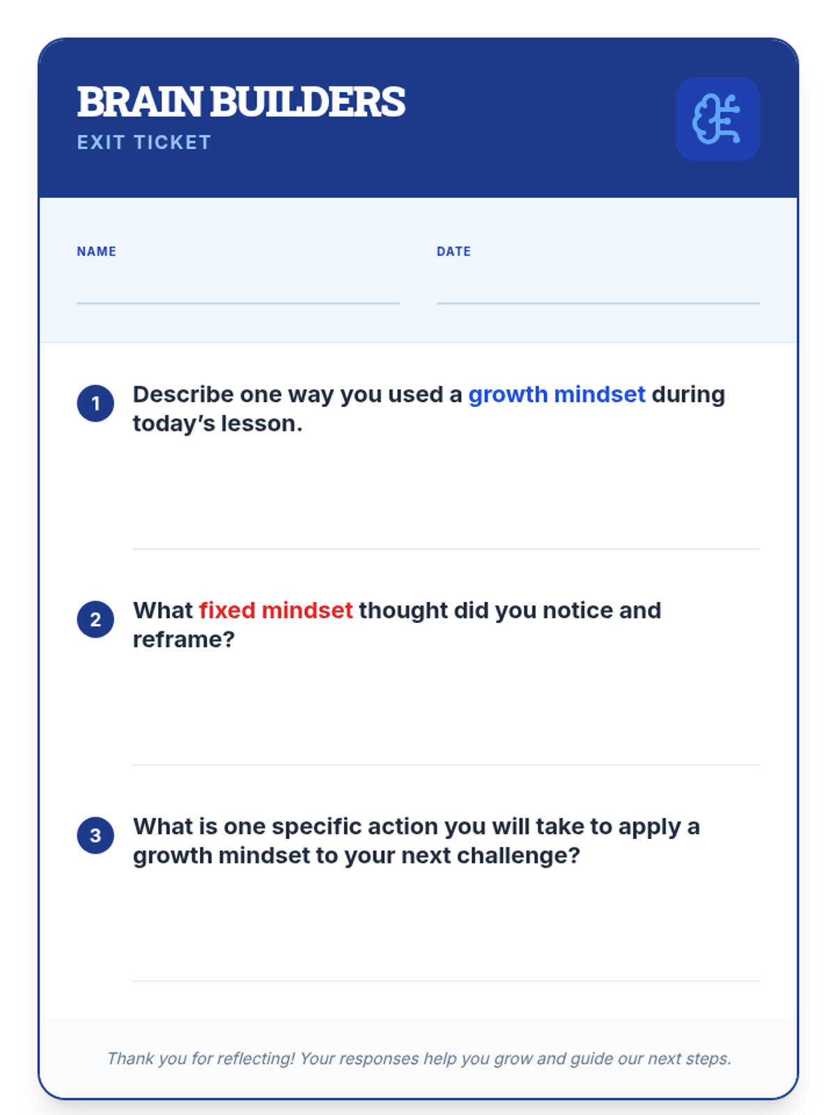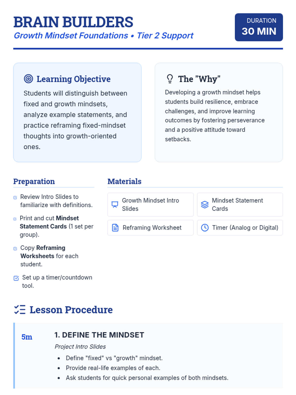 A 30-minute Tier 2 lesson for 8th graders focusing on the difference between fixed and growth mindsets. Students will practice reframing internal narratives to build resilience and perseverance in their academic and personal lives.