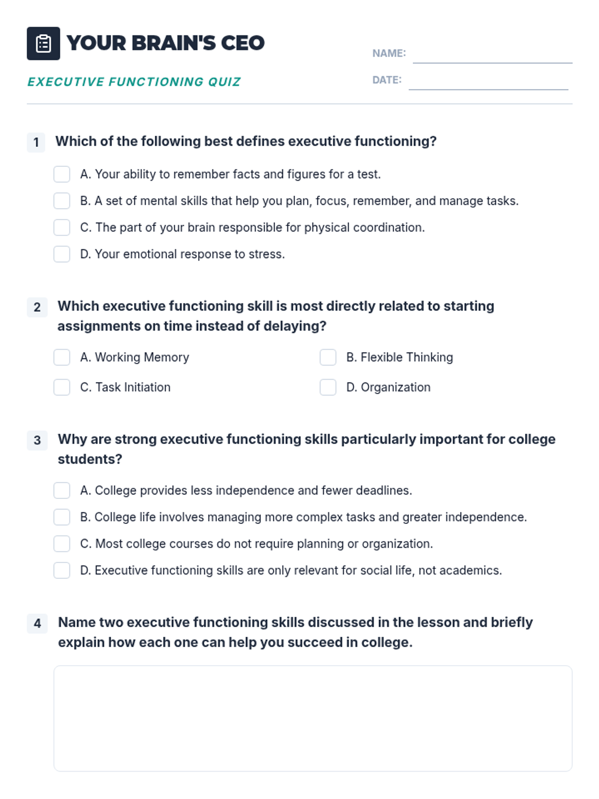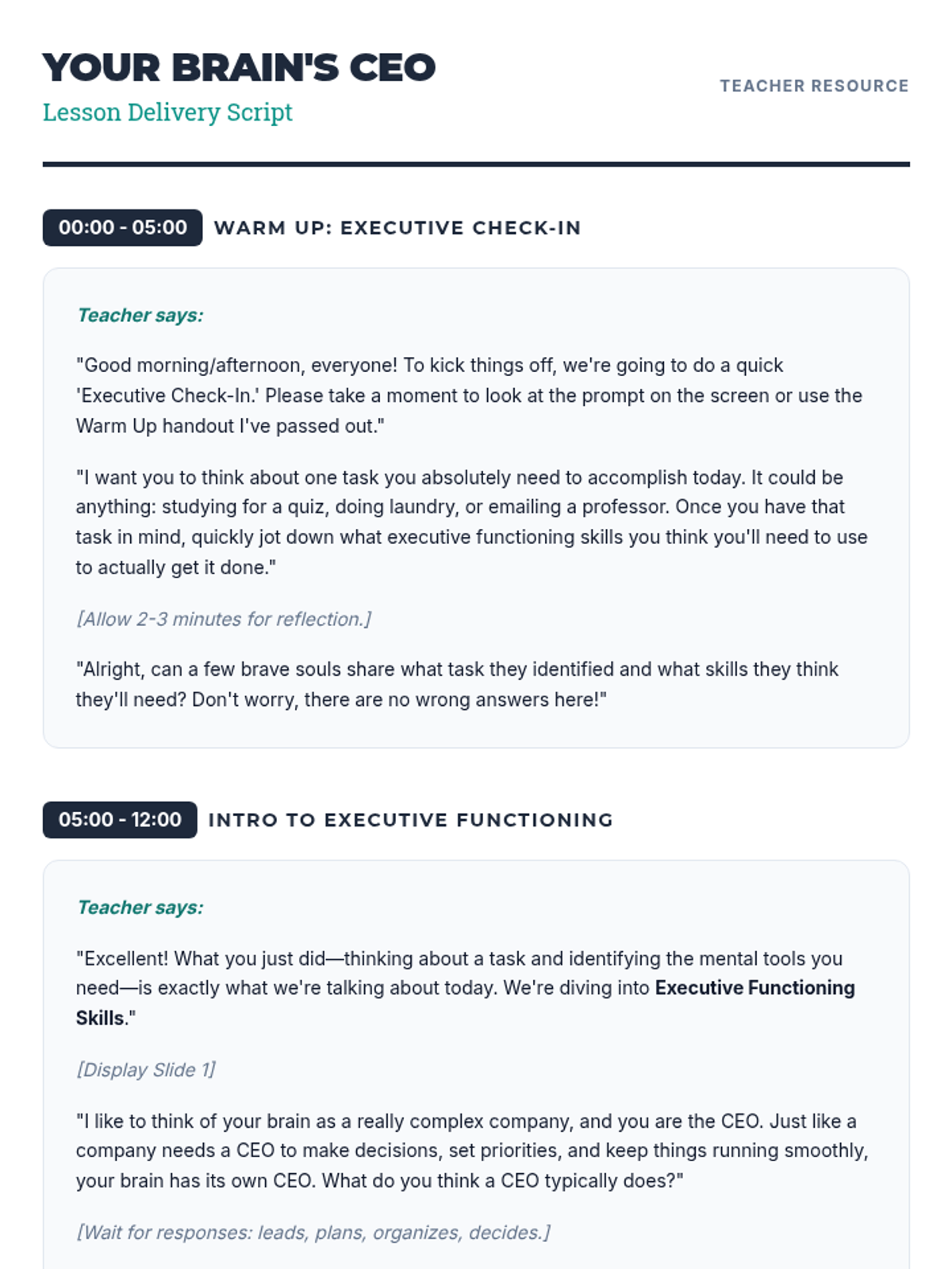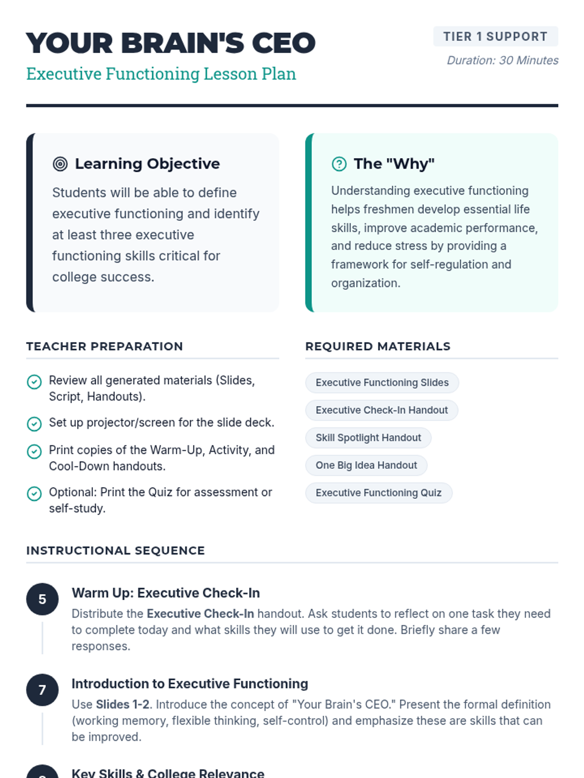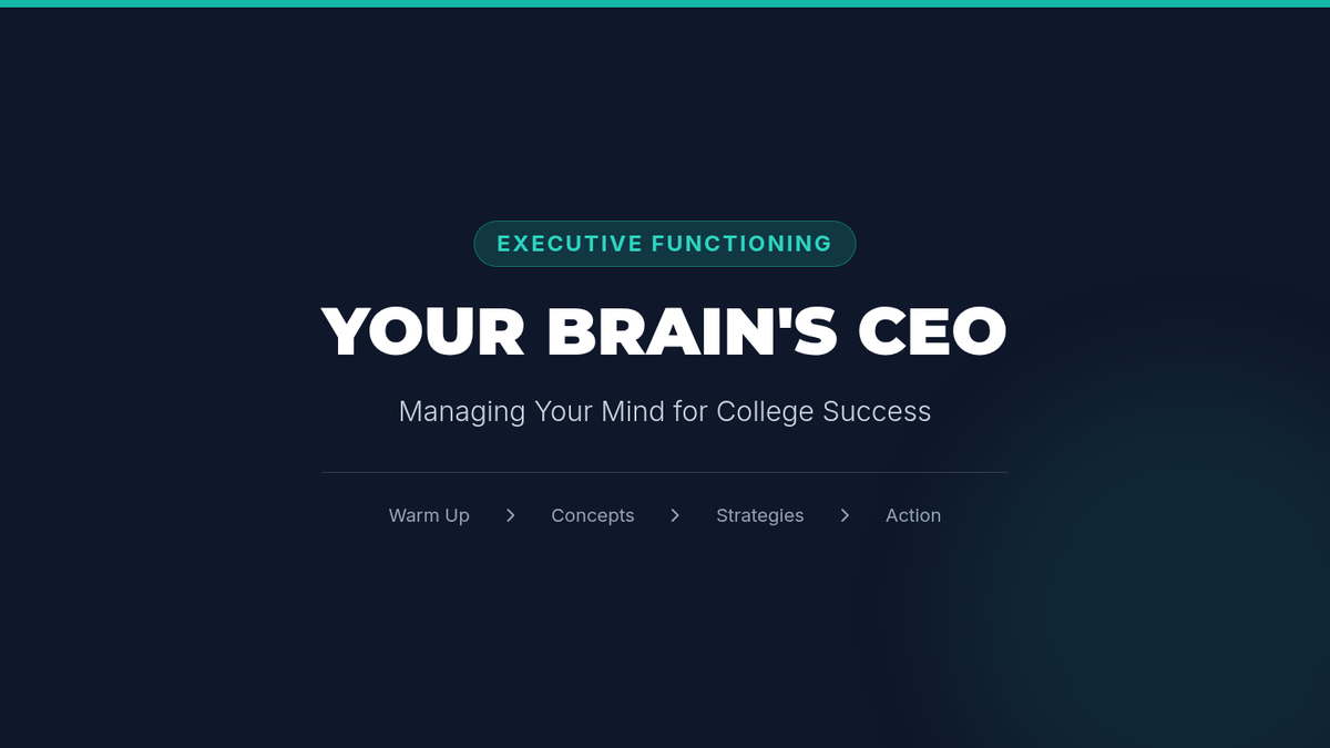 A 30-minute introductory lesson for college freshmen on executive functioning skills, using the 'Brain CEO' analogy to explain self-regulation, time management, and organization.