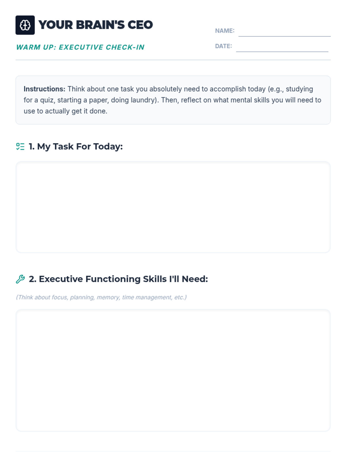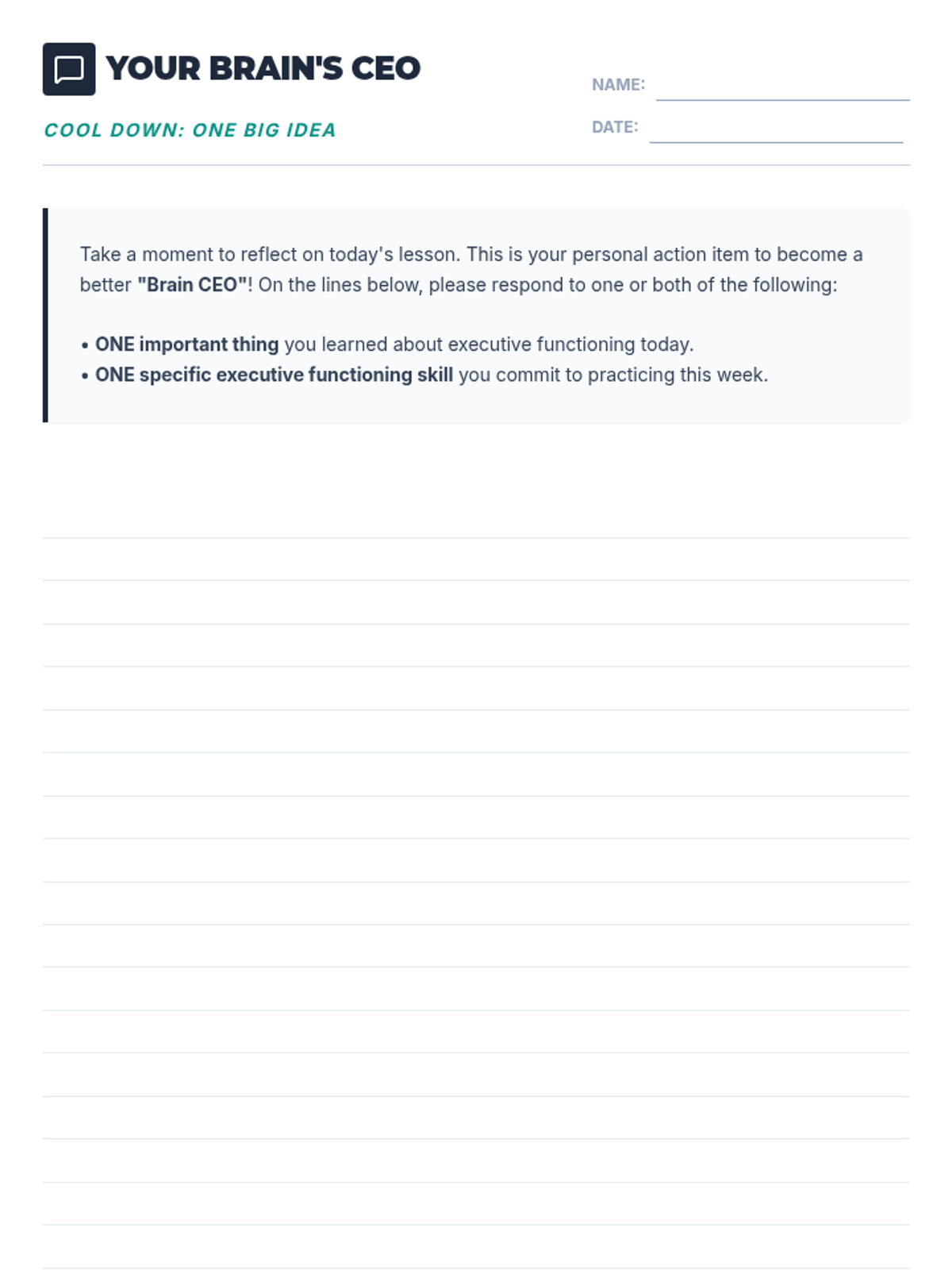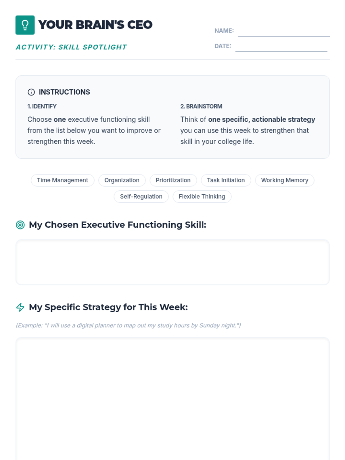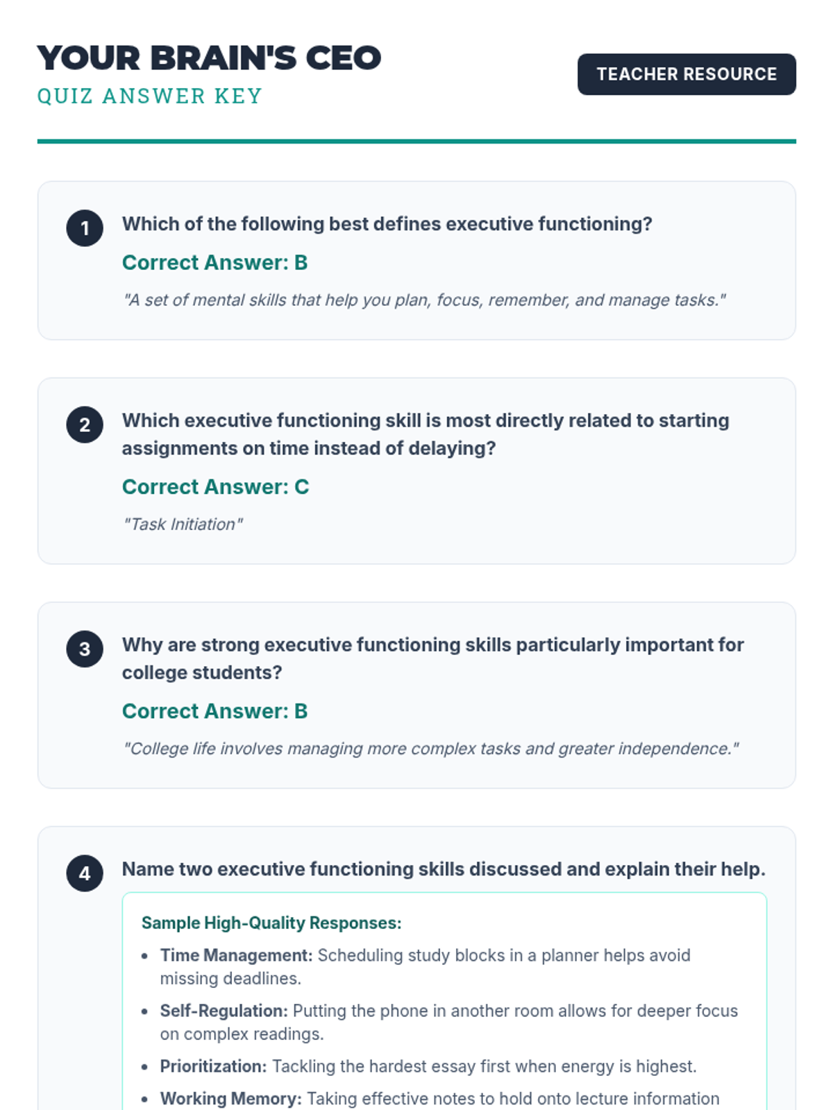 A 30-minute introductory lesson for college freshmen on executive functioning skills, using the 'Brain CEO' analogy to explain self-regulation, time management, and organization.