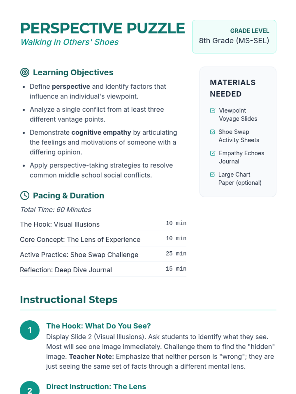 A social-emotional learning lesson for 8th graders focused on developing empathy by analyzing situations through multiple lenses. Students practice shifting viewpoints to resolve conflicts and build a more inclusive community.