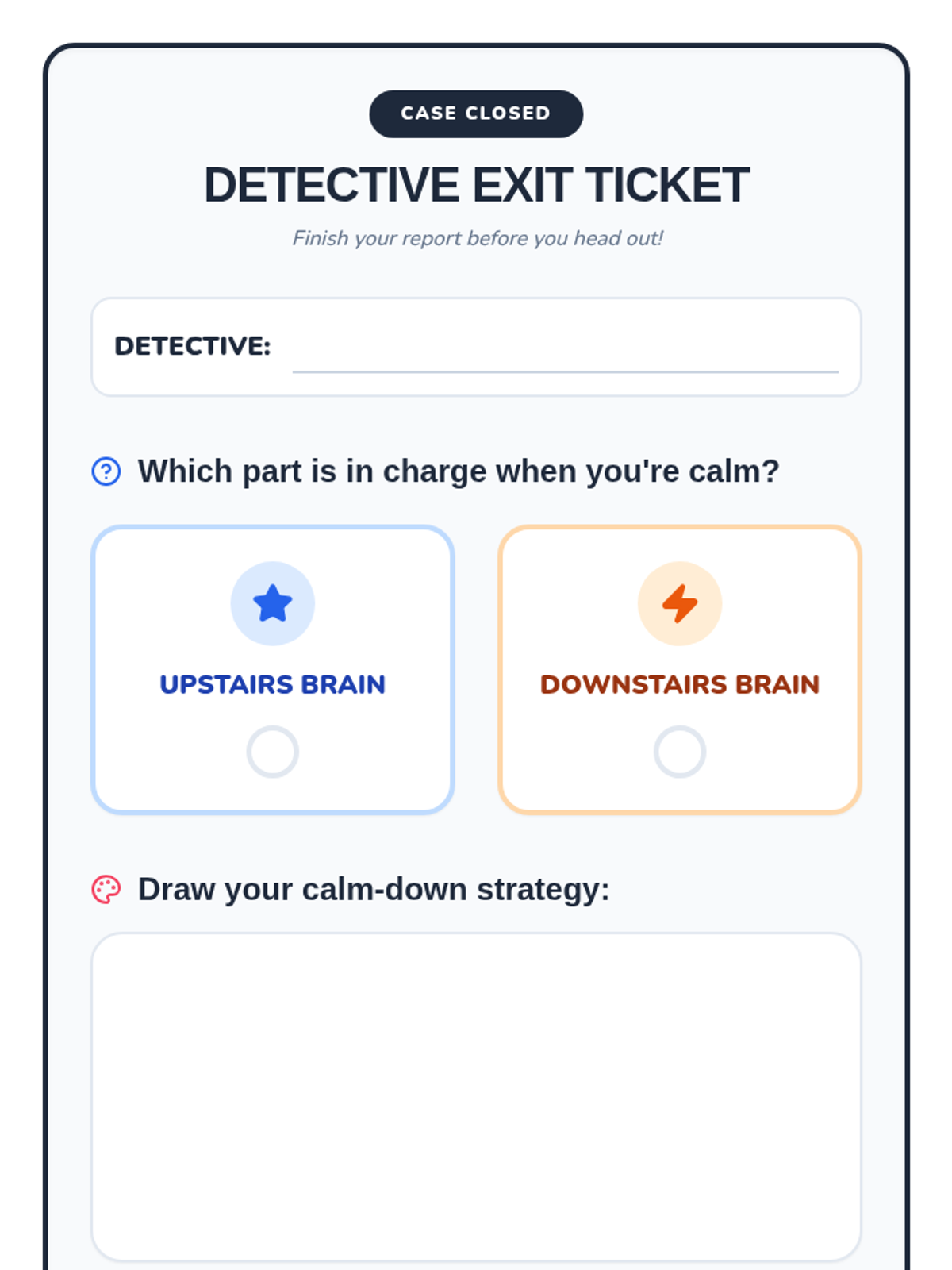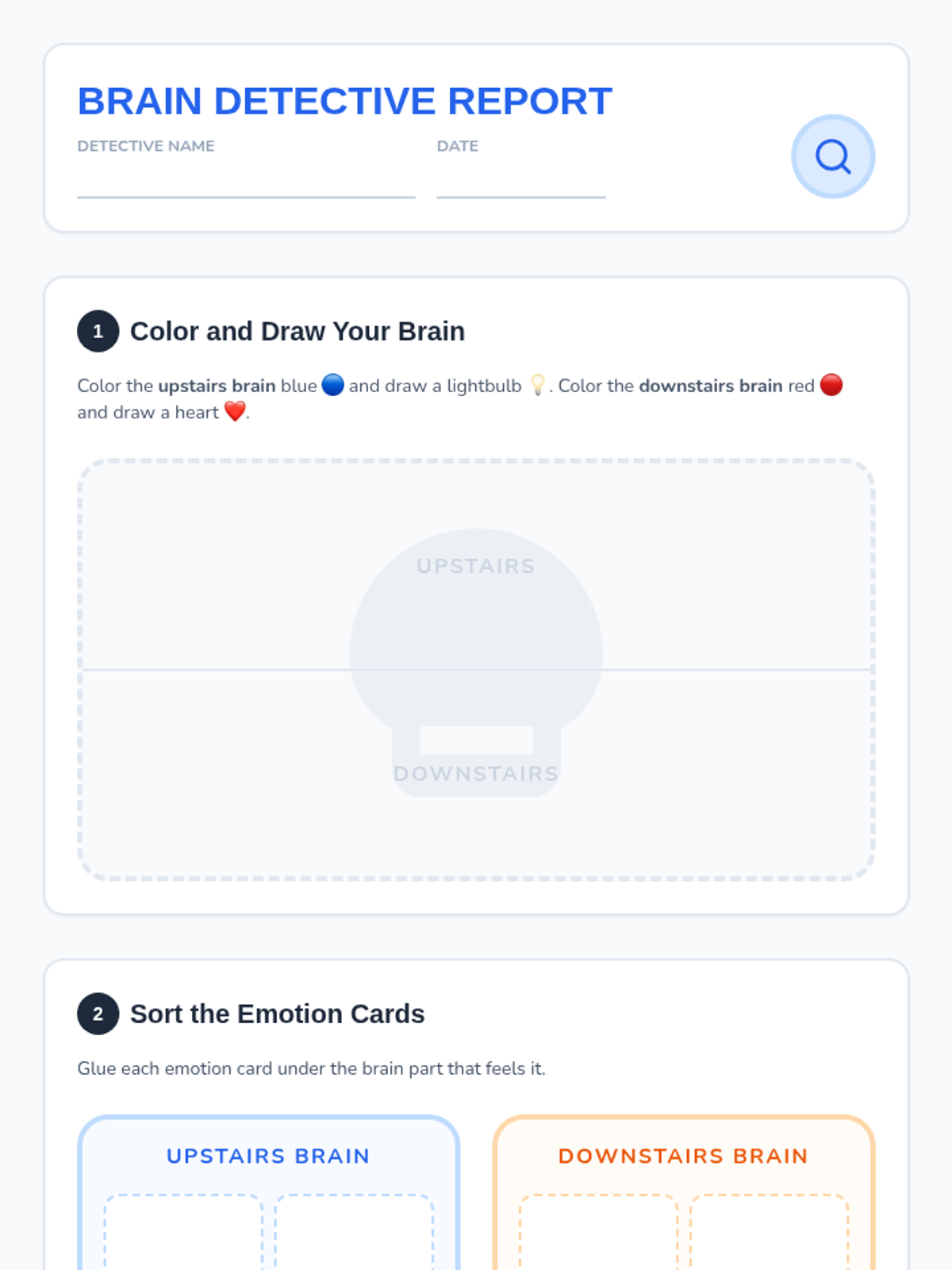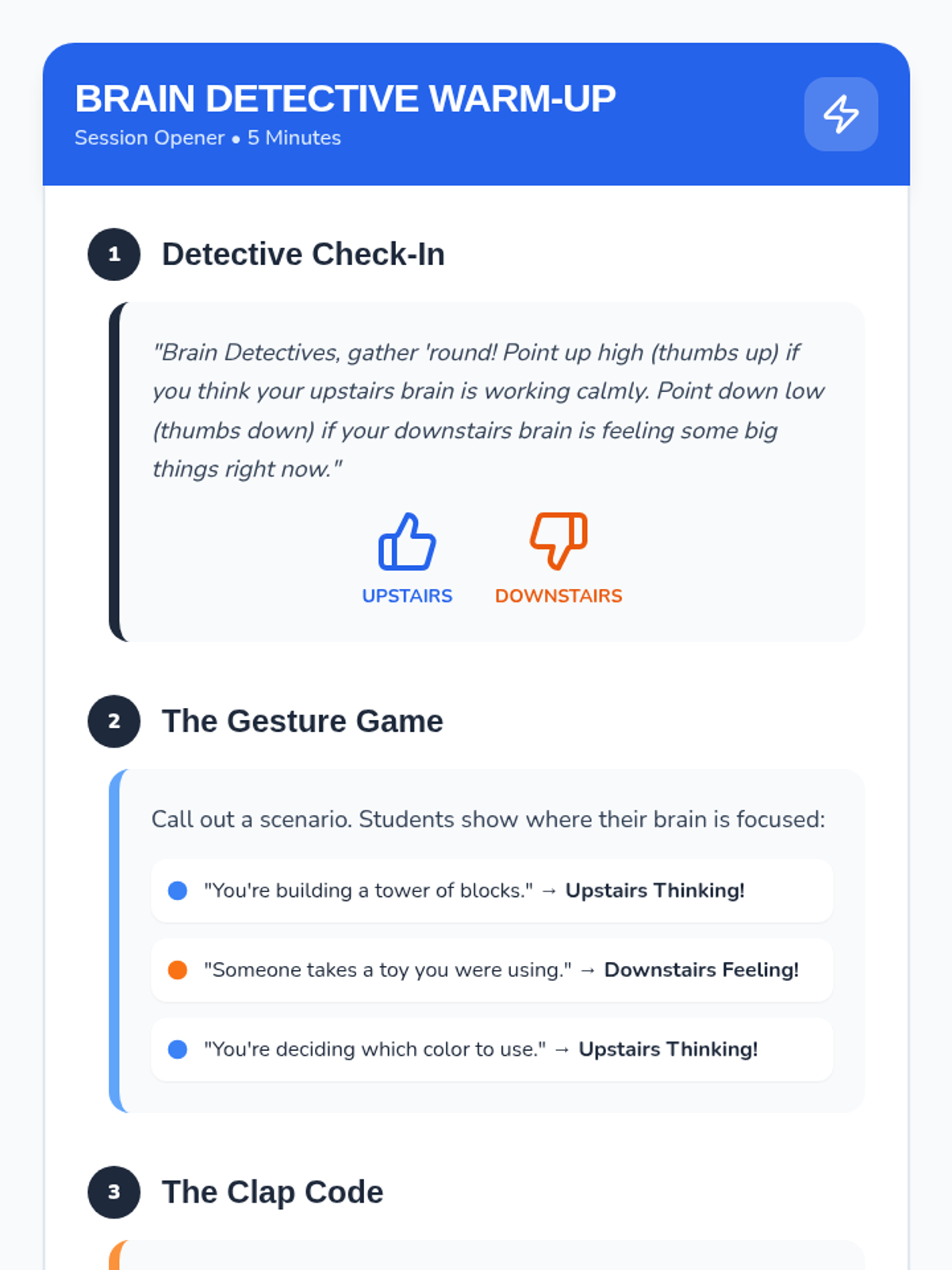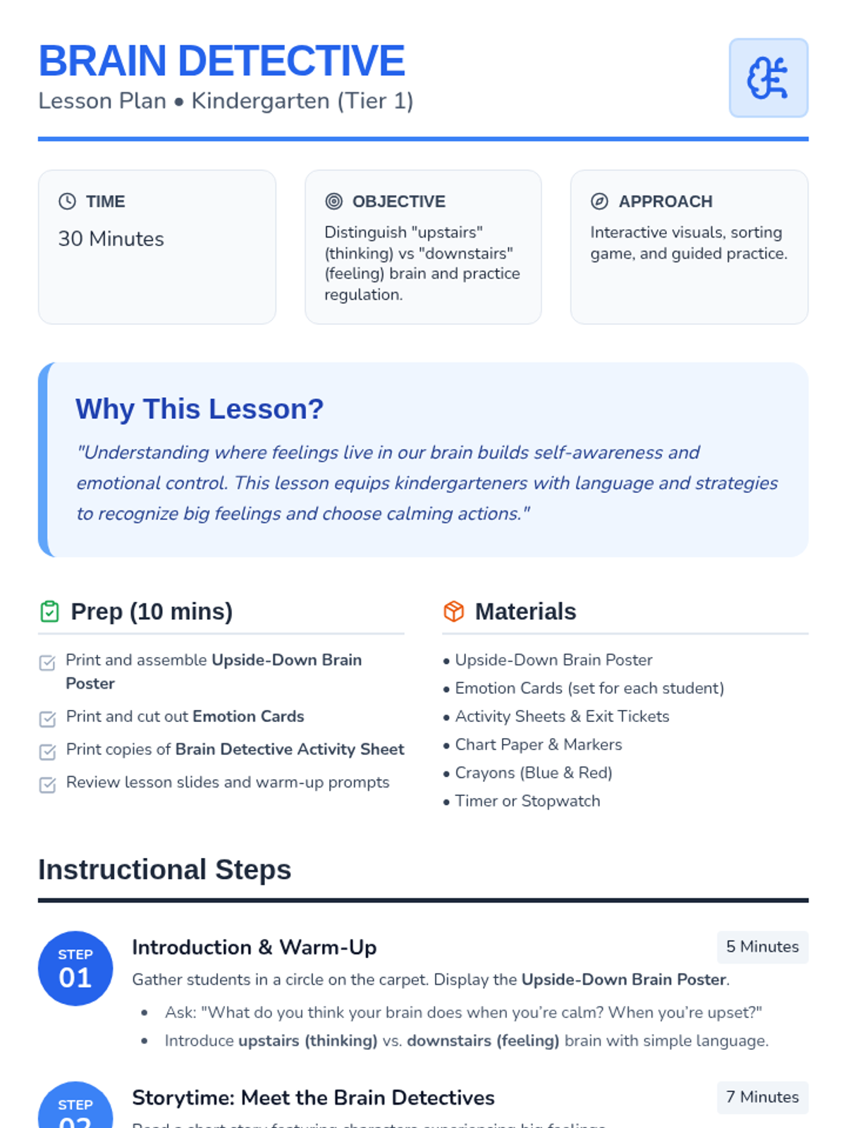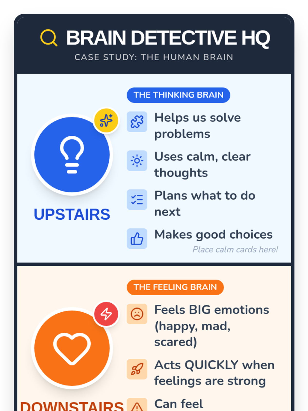 A 30-minute kindergarten lesson introducing the 'upstairs' thinking brain and 'downstairs' feeling brain to help students navigate big emotions and practice self-regulation.