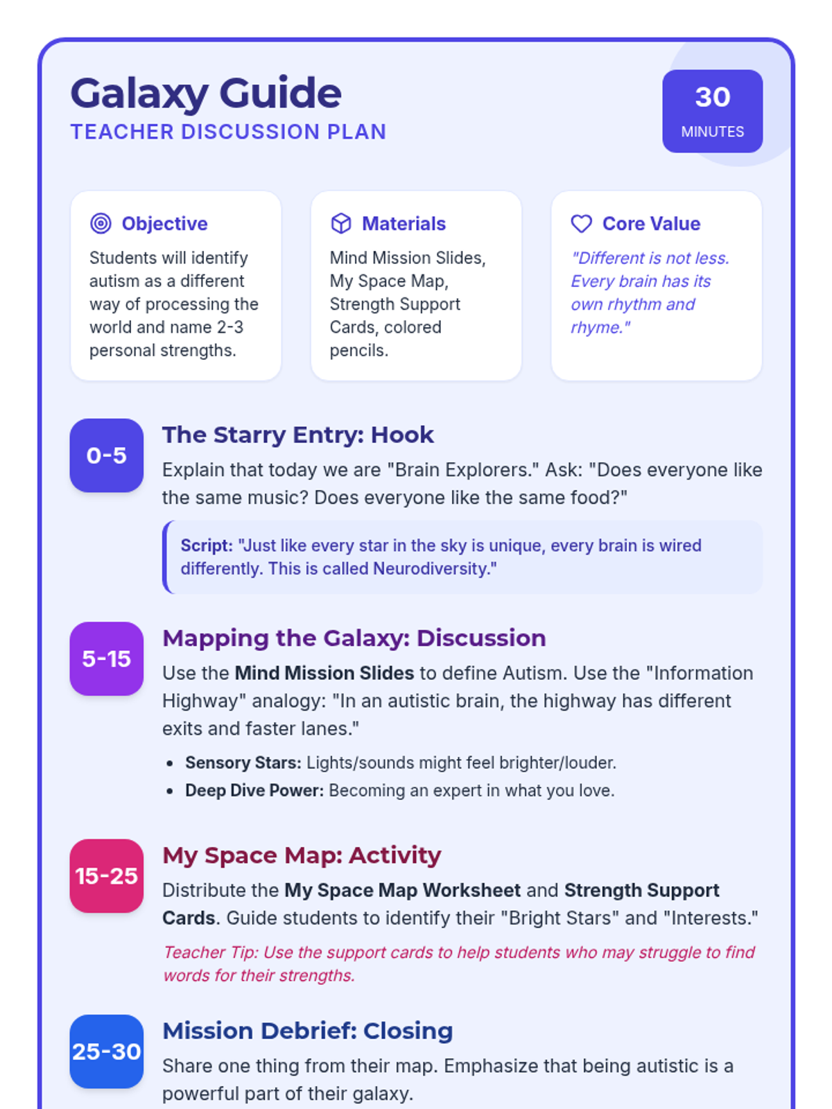 A 30-minute SEL lesson designed to help children with autism understand their unique way of thinking, focusing on self-awareness, strengths, and common autistic traits in a positive, empowering way.