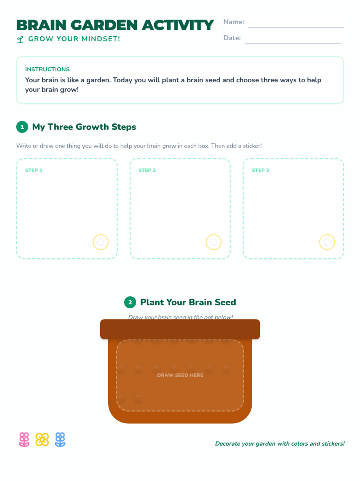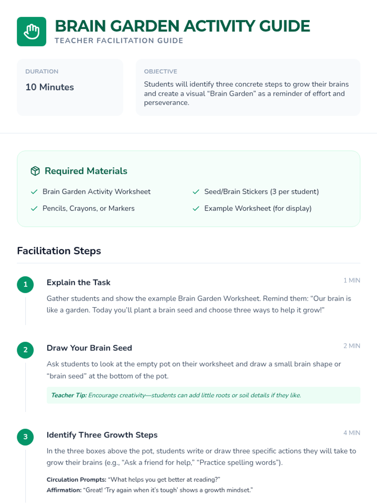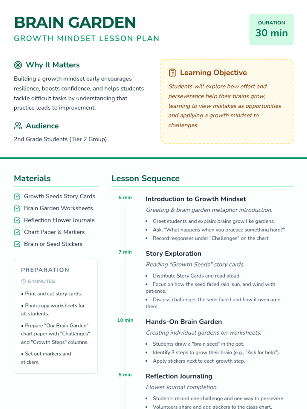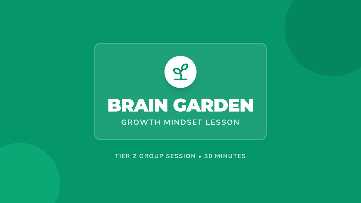A 30-minute Tier 2 lesson for 2nd graders exploring growth mindset through the metaphor of a brain garden, featuring hands-on activities and reflection.