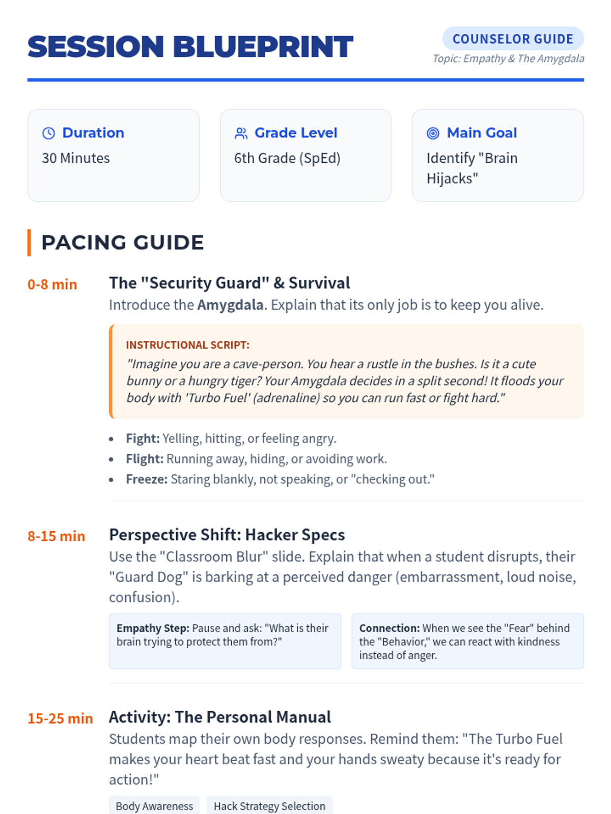 A 30-minute social-emotional learning session for 6th-grade students focused on understanding the amygdala's 'fight or flight' response, practicing perspective-taking, and building empathy through classroom scenarios.