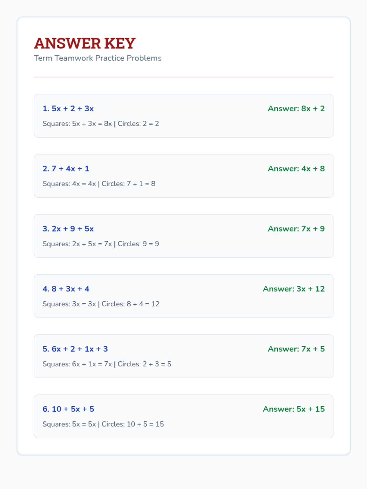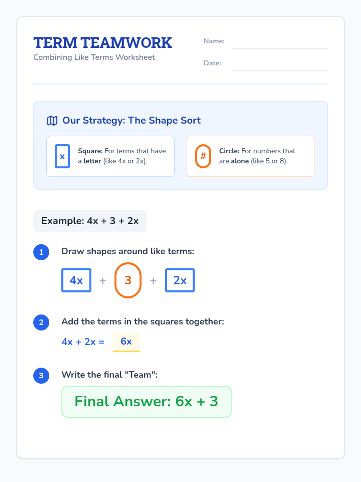An introductory lesson on combining like terms designed for special education students, focusing on visual coding, shape-sorting strategies, and step-by-step guided practice.