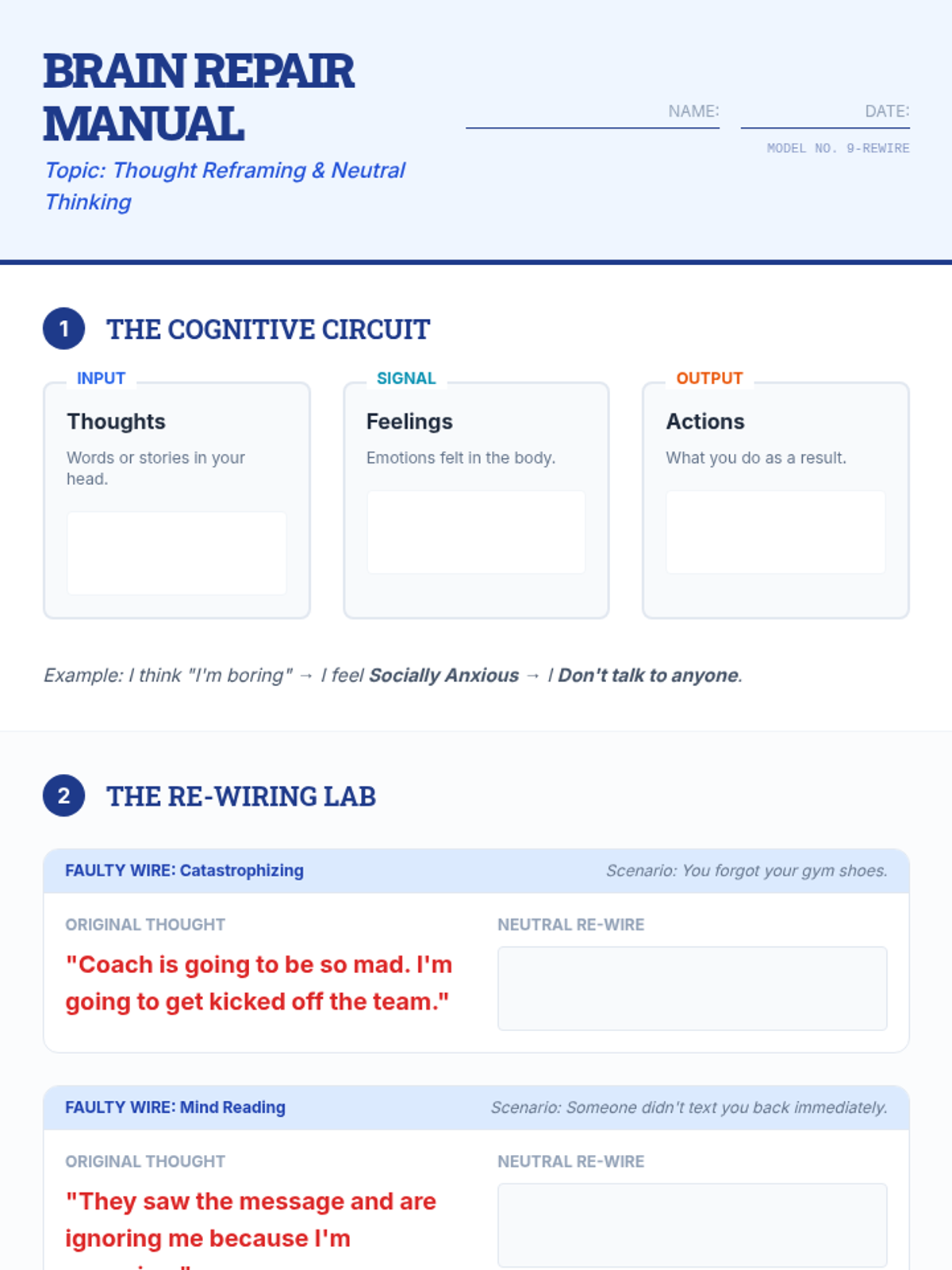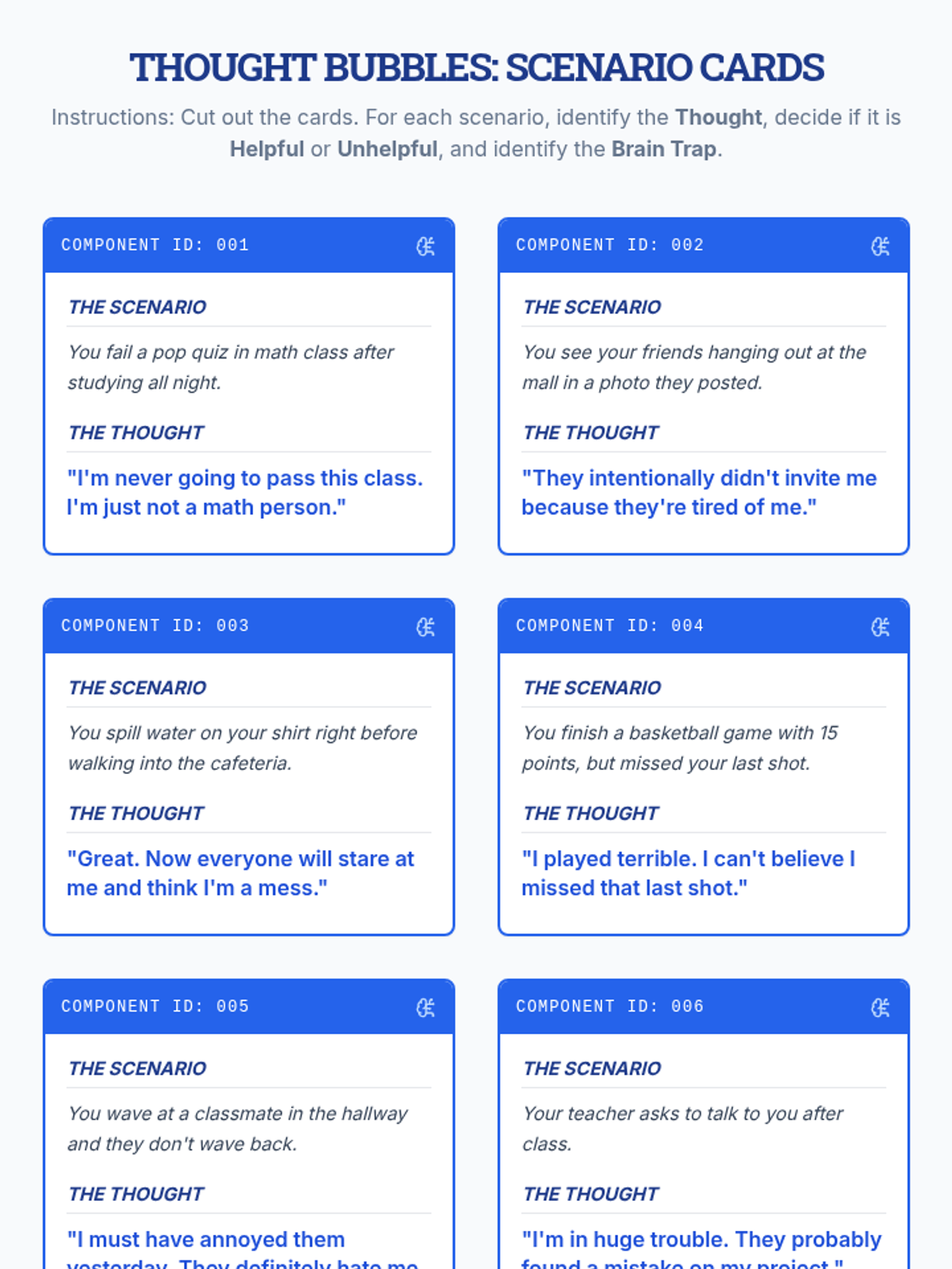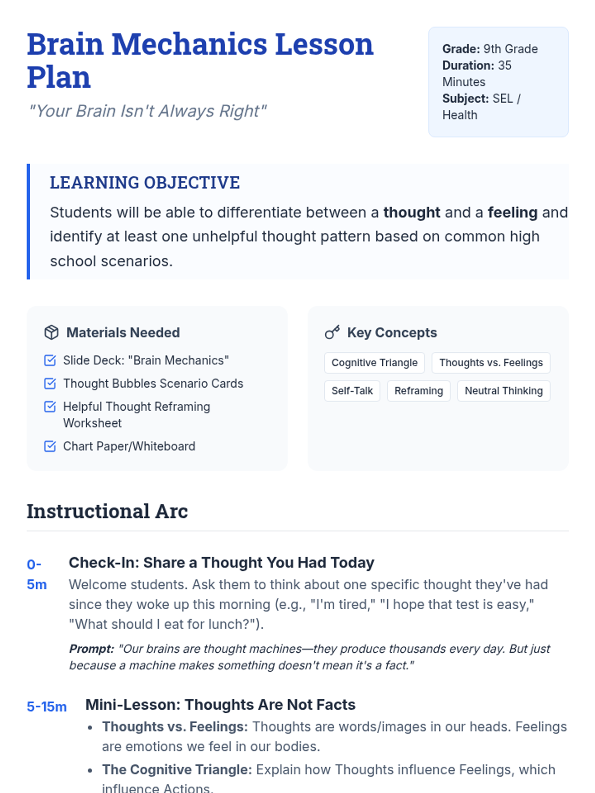 A 35-minute lesson for 9th graders to differentiate between thoughts and feelings and identify unhelpful thought patterns using high school scenarios.
