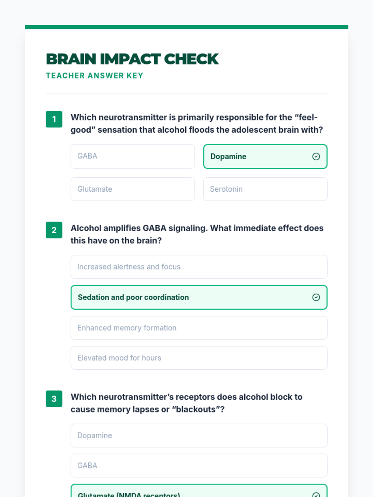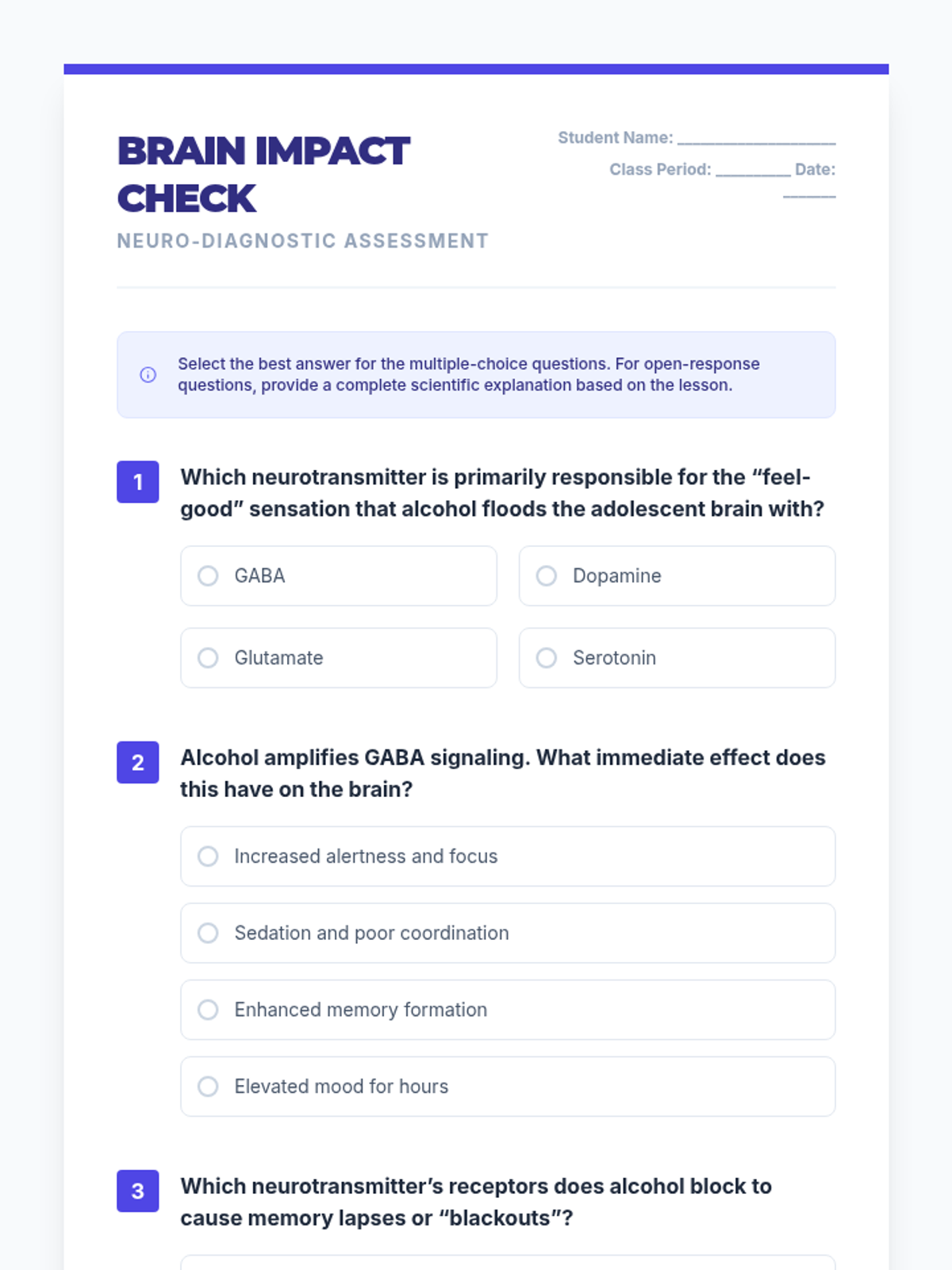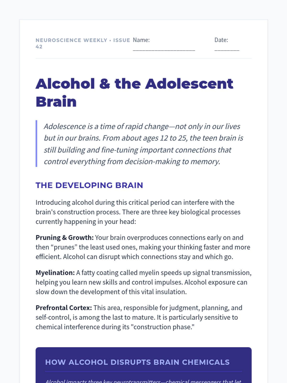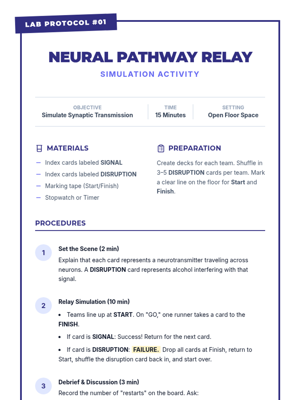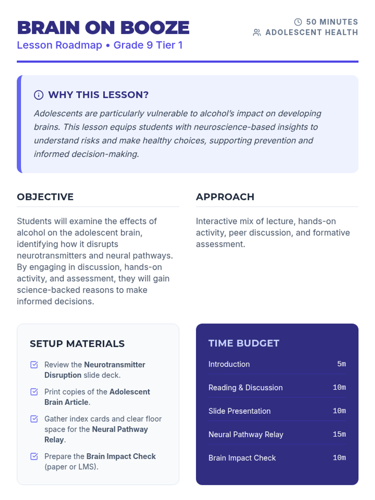 A Tier 1 science-based lesson for 9th graders exploring the neurological impacts of alcohol on the developing adolescent brain. Students will learn about neurotransmitter disruption through a reading, presentation, and hands-on relay activity.