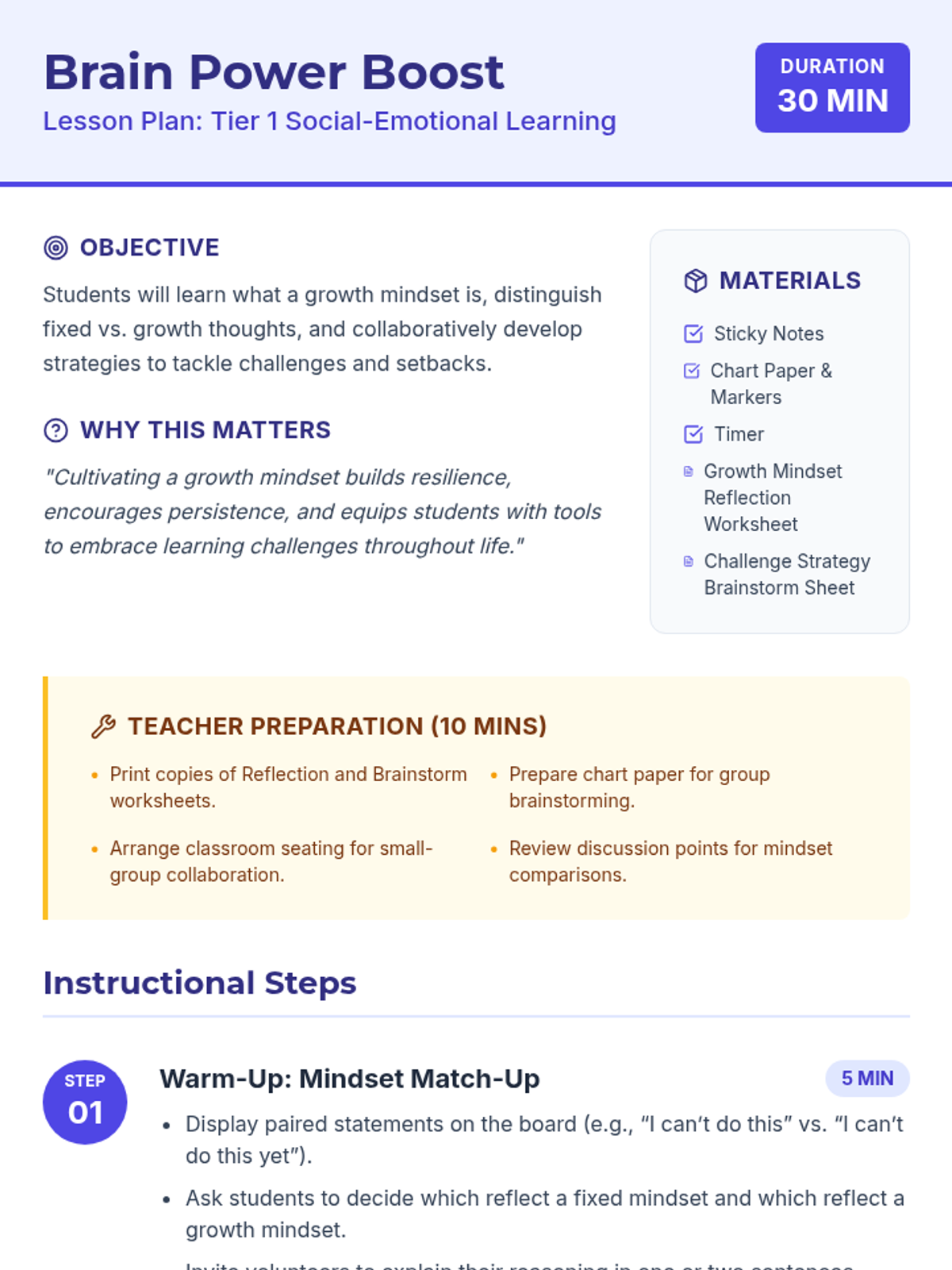 In this engaging 30-minute lesson, 7th graders explore the concept of a growth mindset and learn strategies to embrace challenges and overcome setbacks. This Tier 1 classroom lesson empowers students to shift from fixed to growth thinking, boosting their resilience and lifelong learning skills.