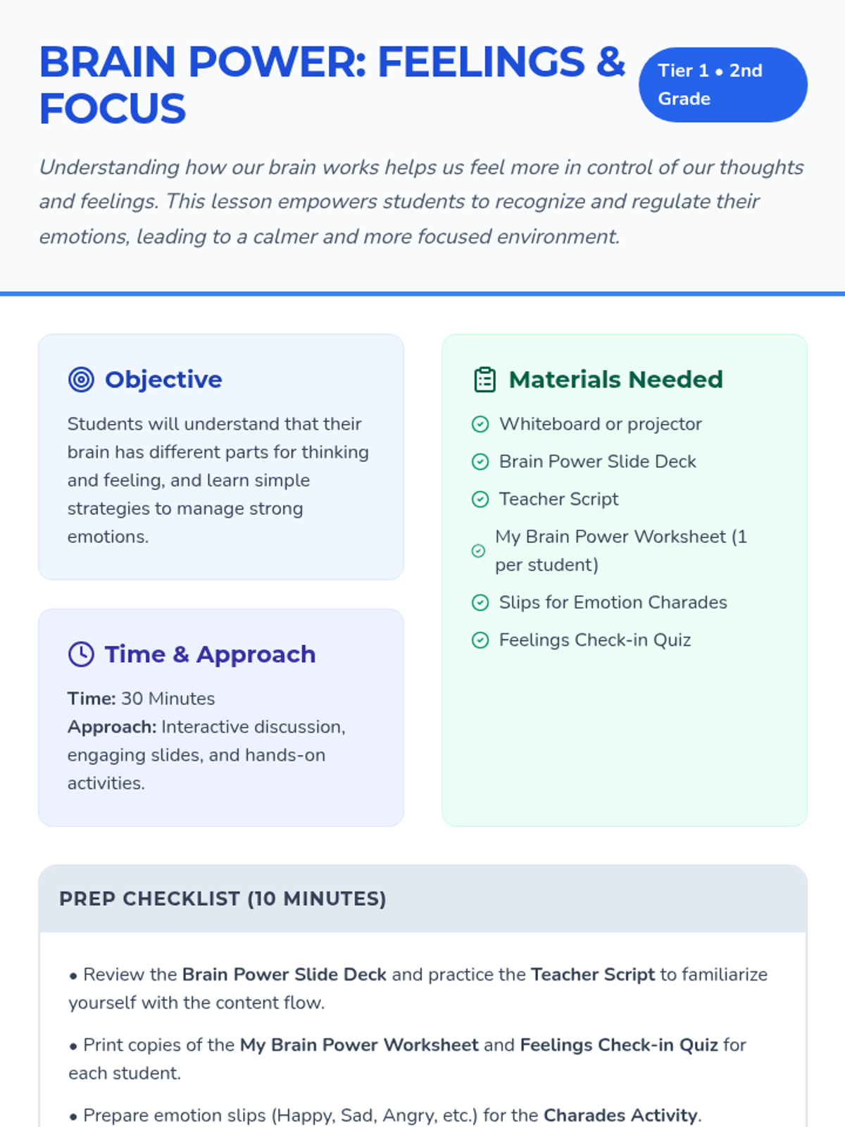 A 30-minute Tier 1 lesson for 2nd graders exploring the 'Thinking Brain' and 'Feeling Brain' with strategies for emotional regulation. Students learn to use deep breathing, counting, and talking to manage big feelings.