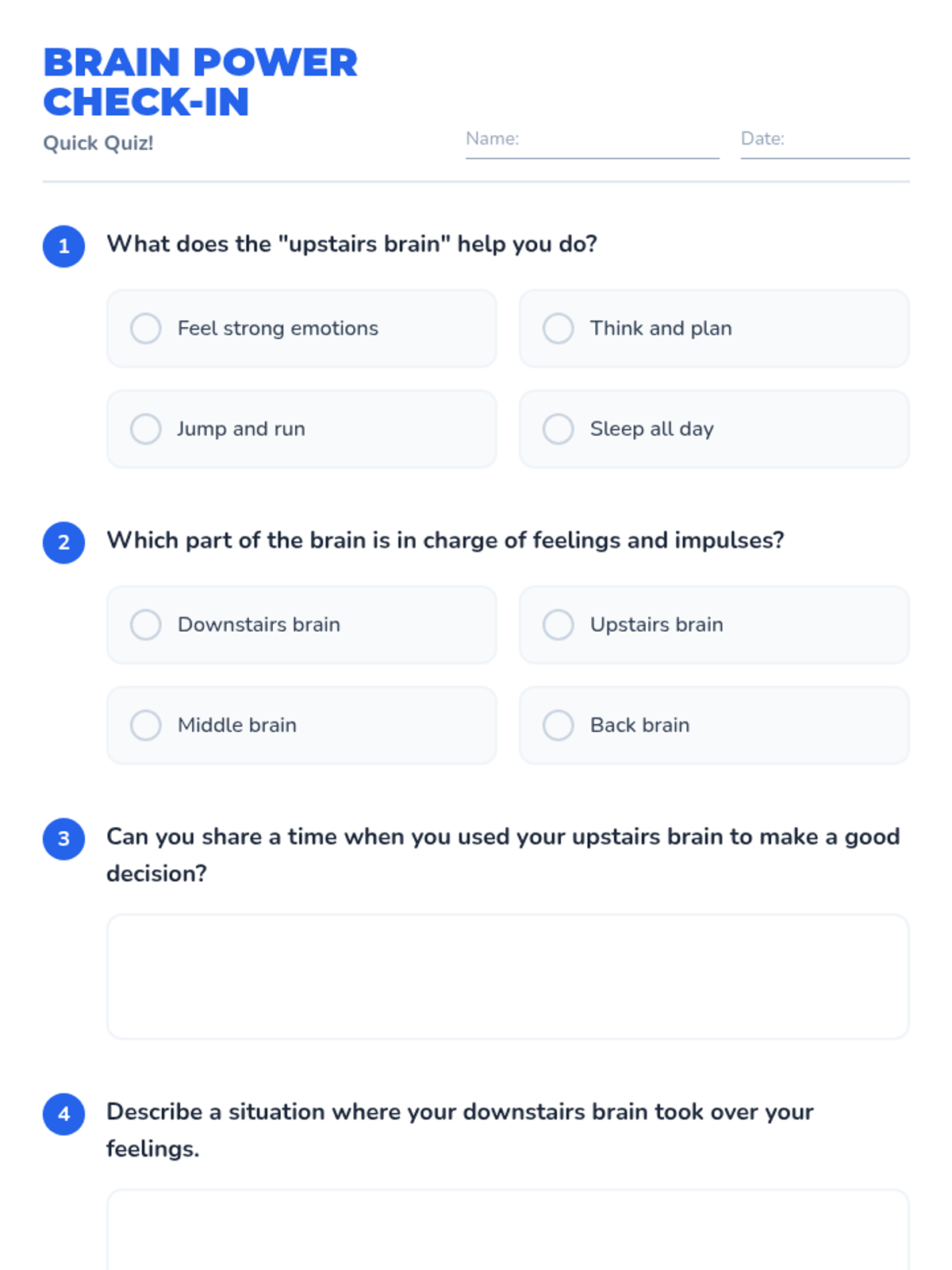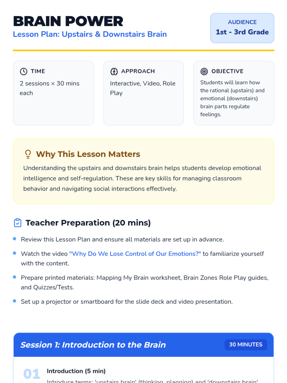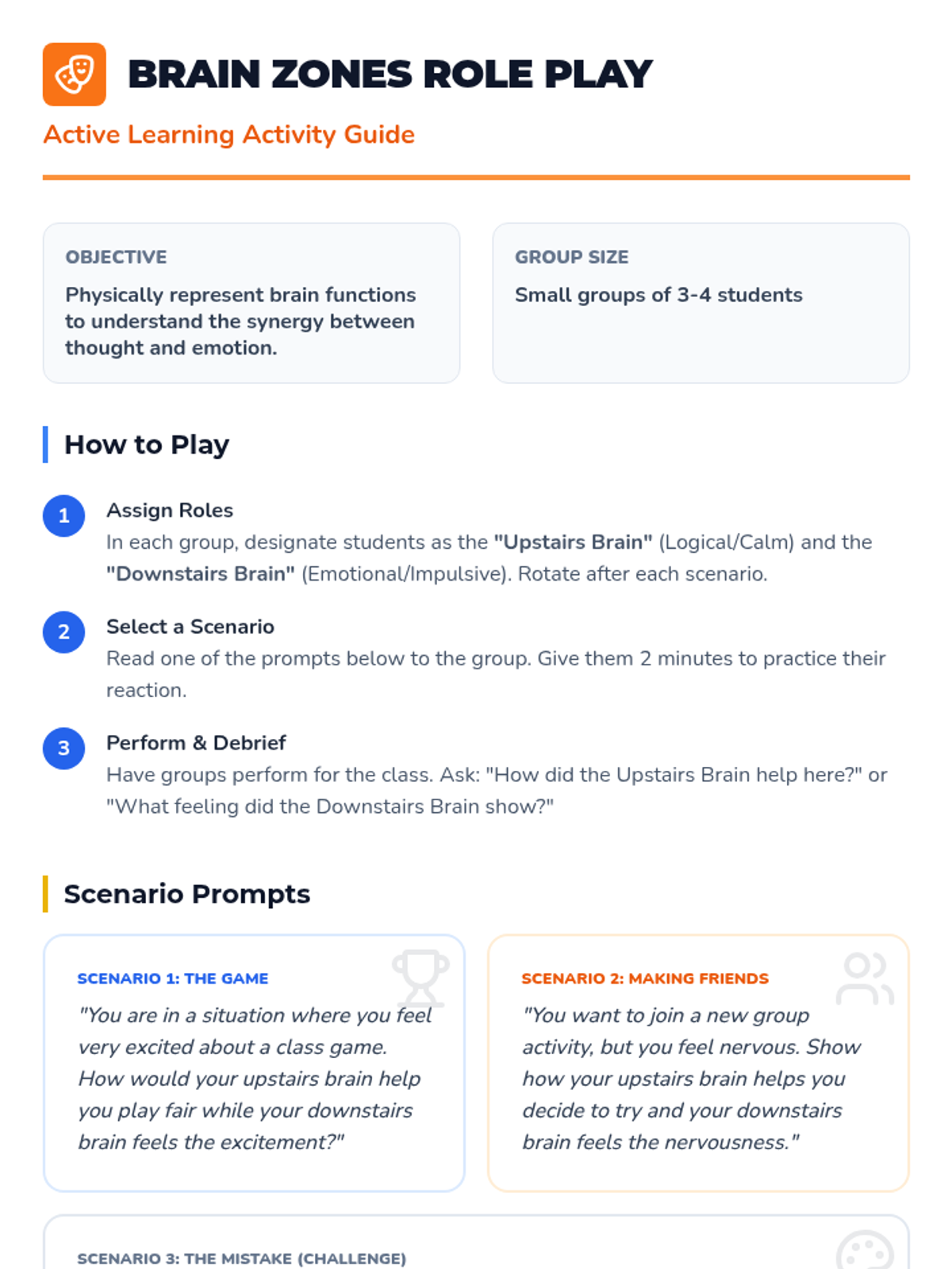 Students learn the difference between the rational 'upstairs brain' and the emotional 'downstairs brain' and how they work together.