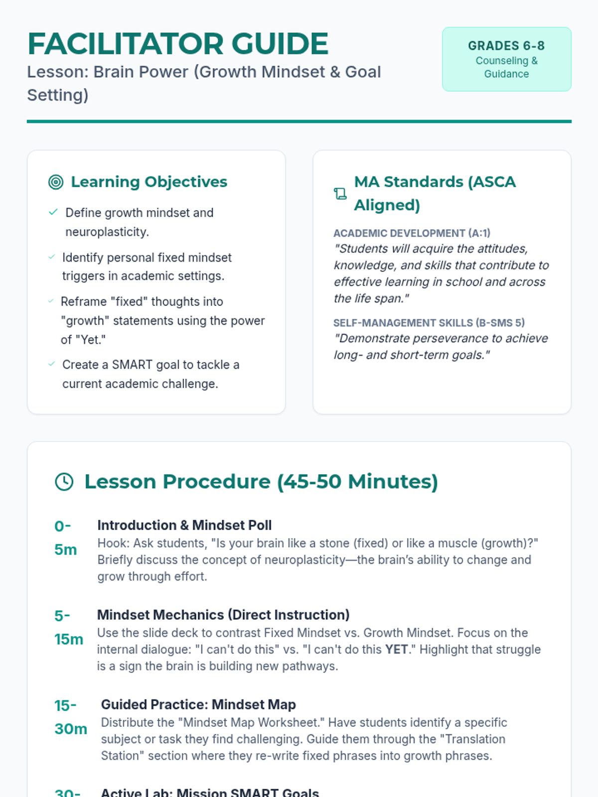 A middle school counseling lesson focused on developing a growth mindset, understanding neuroplasticity, and setting SMART goals to overcome academic hurdles. Aligned with Massachusetts School Counseling Framework standards.
