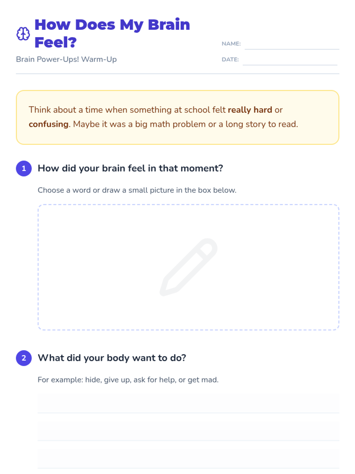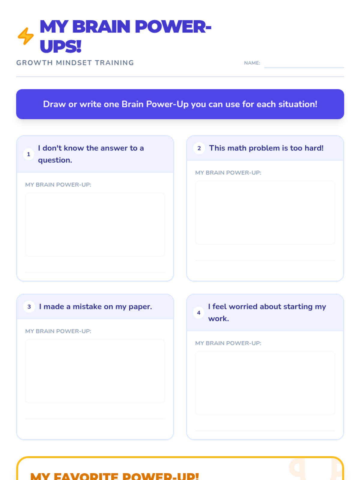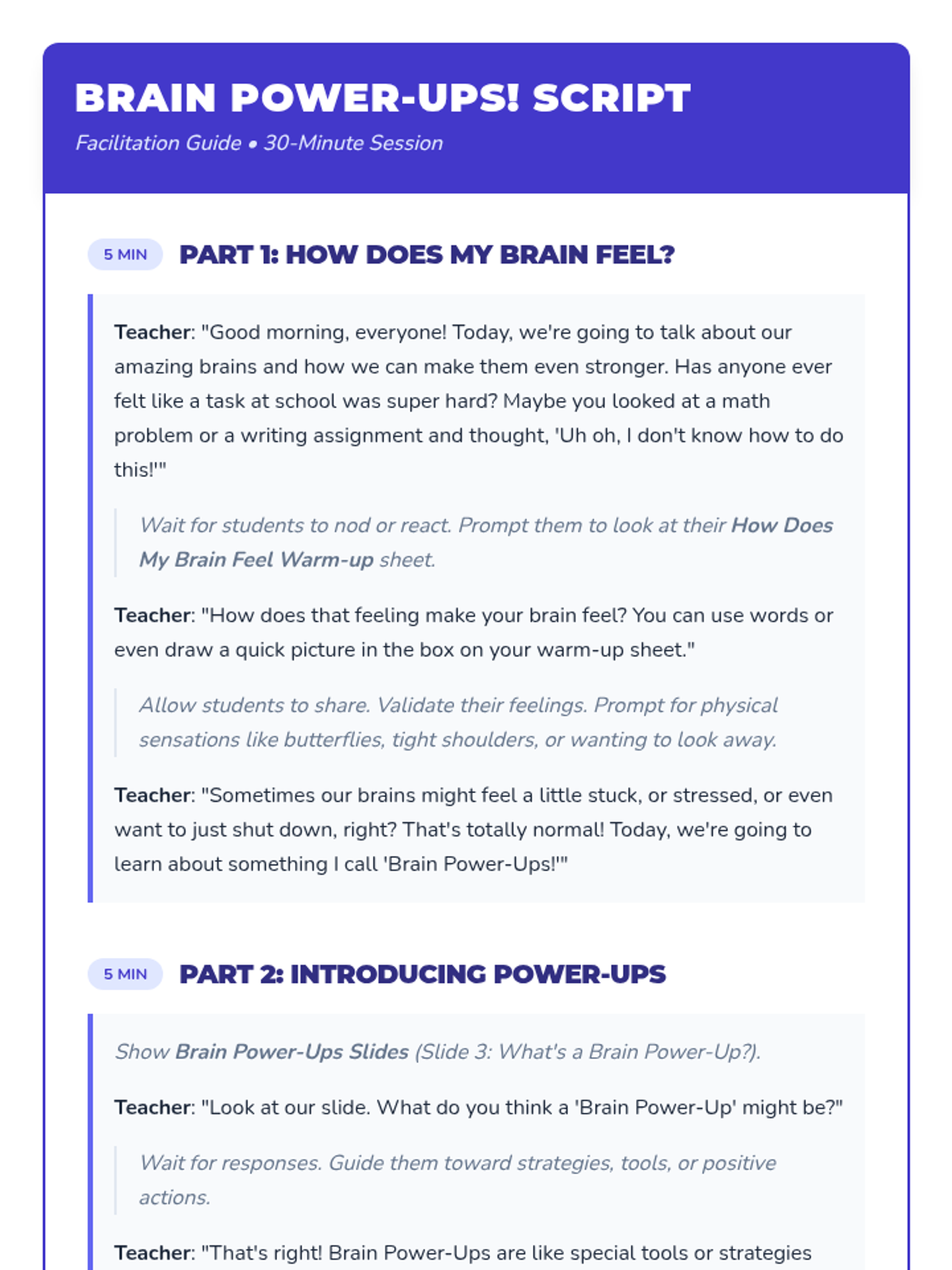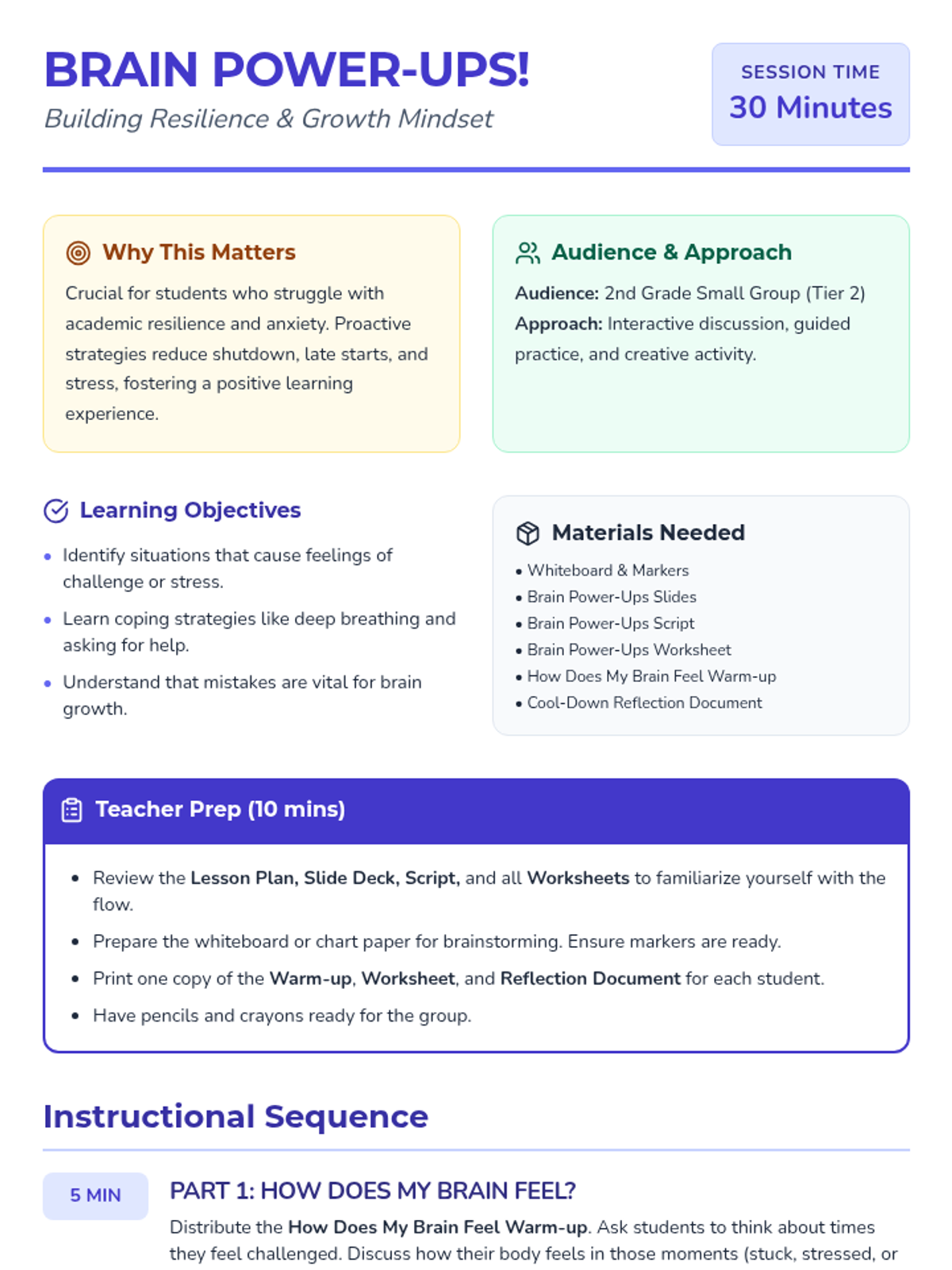 A 30-minute Tier 2 small group lesson for 2nd graders designed to build academic resilience and growth mindset. Students learn practical 'Brain Power-Ups' to manage anxiety and tackle challenging tasks with confidence.