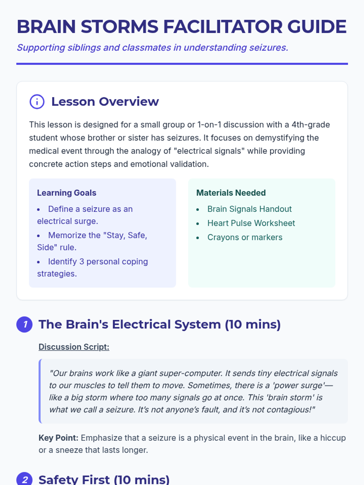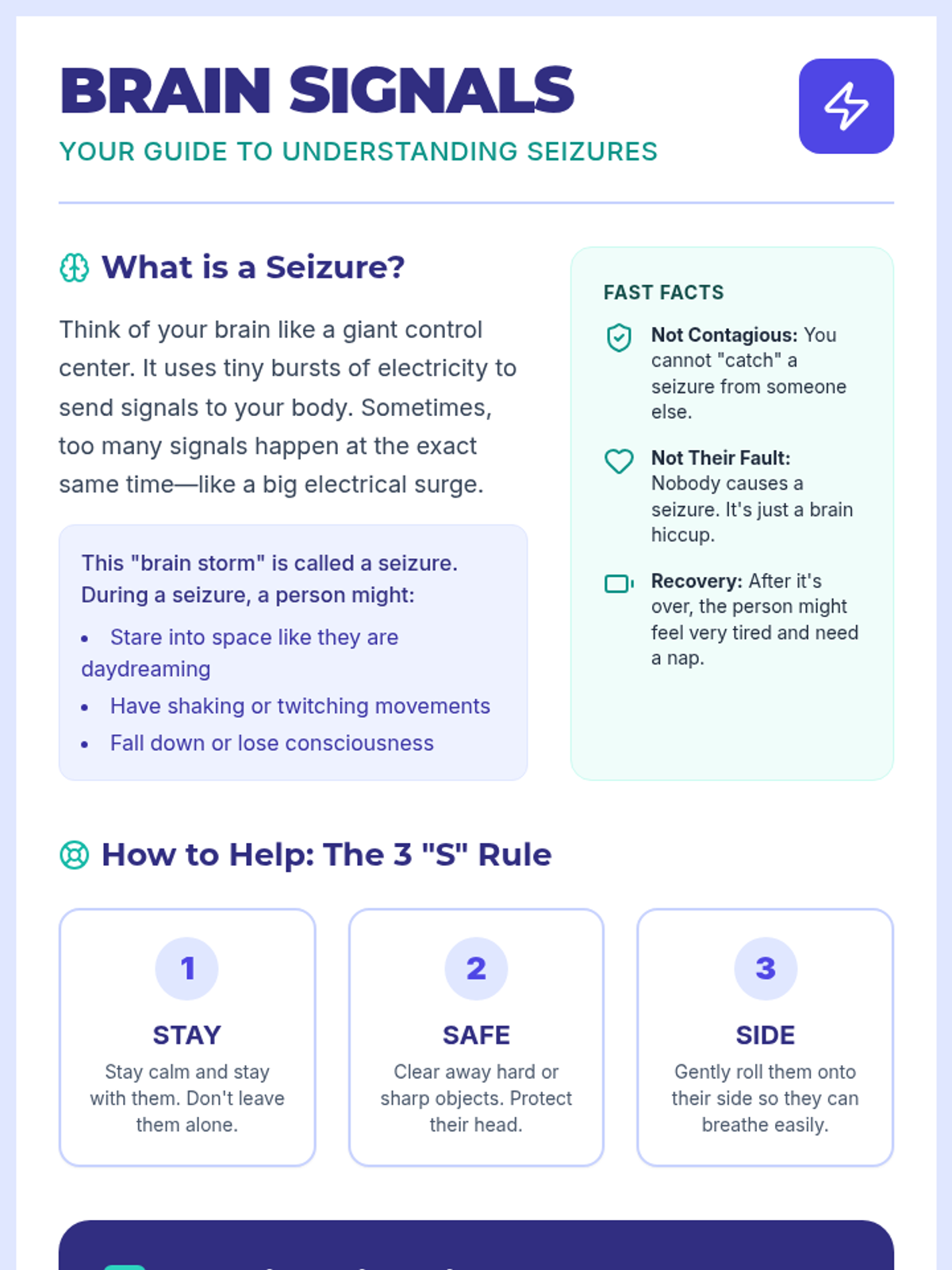 A gentle, informative lesson designed to help 4th graders understand seizures, especially when a sibling is affected. It covers the science of the brain, safety steps, and emotional coping strategies.