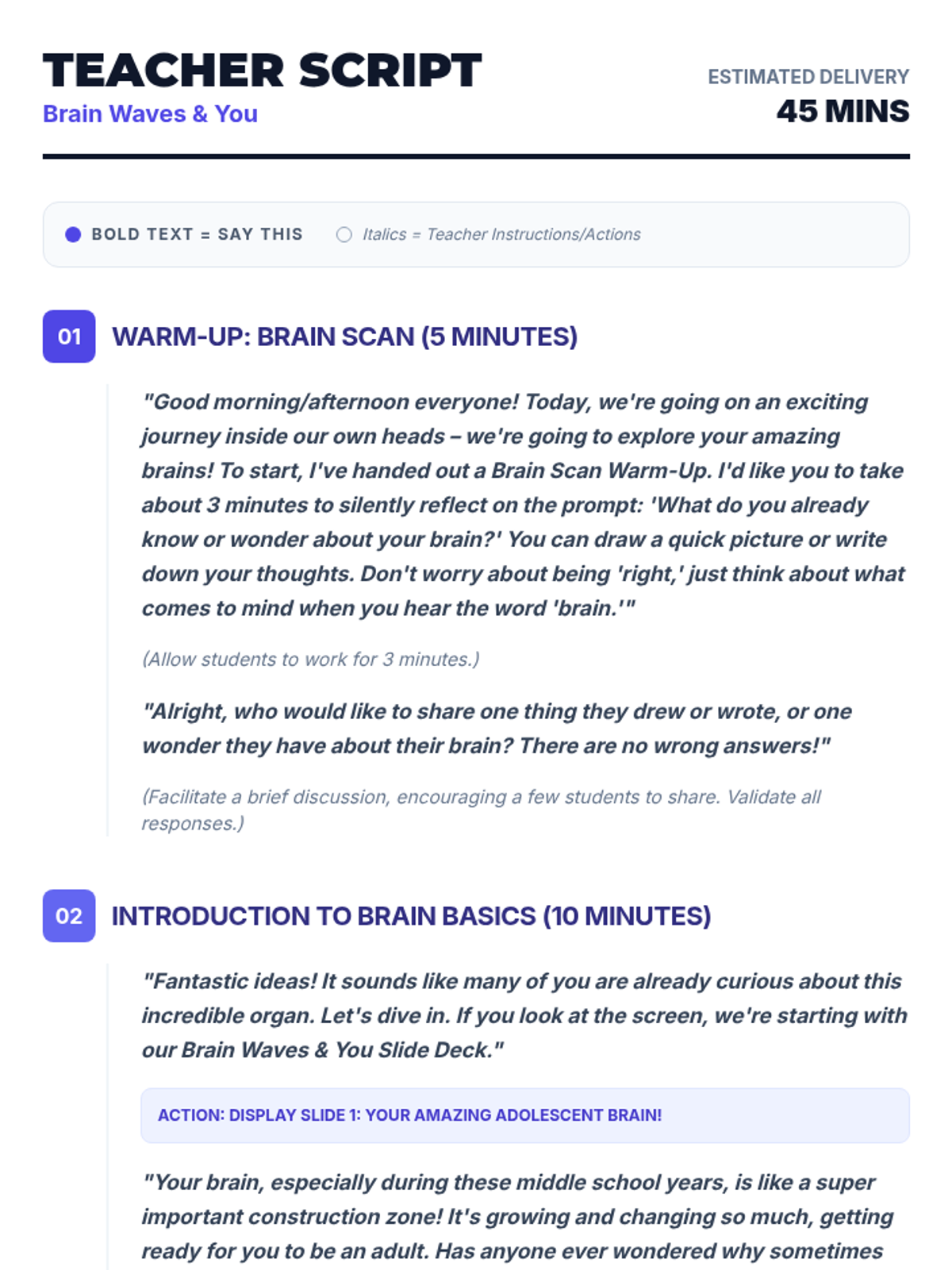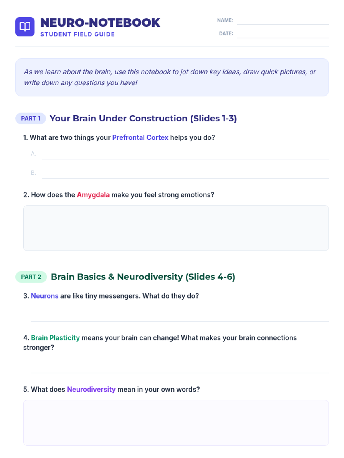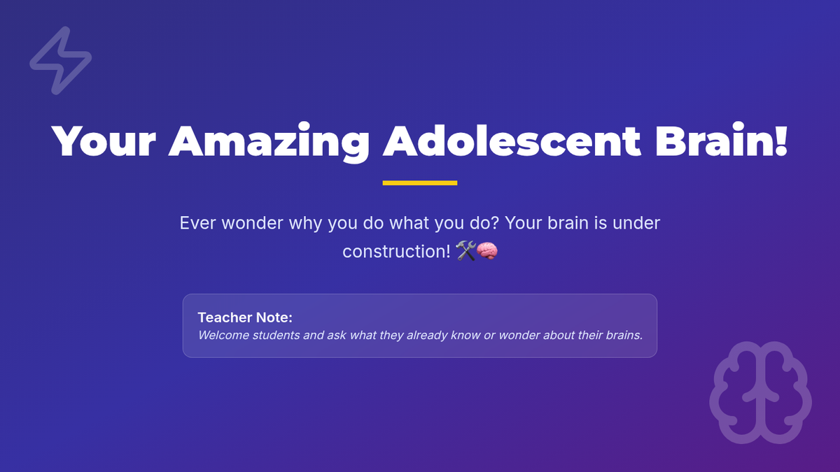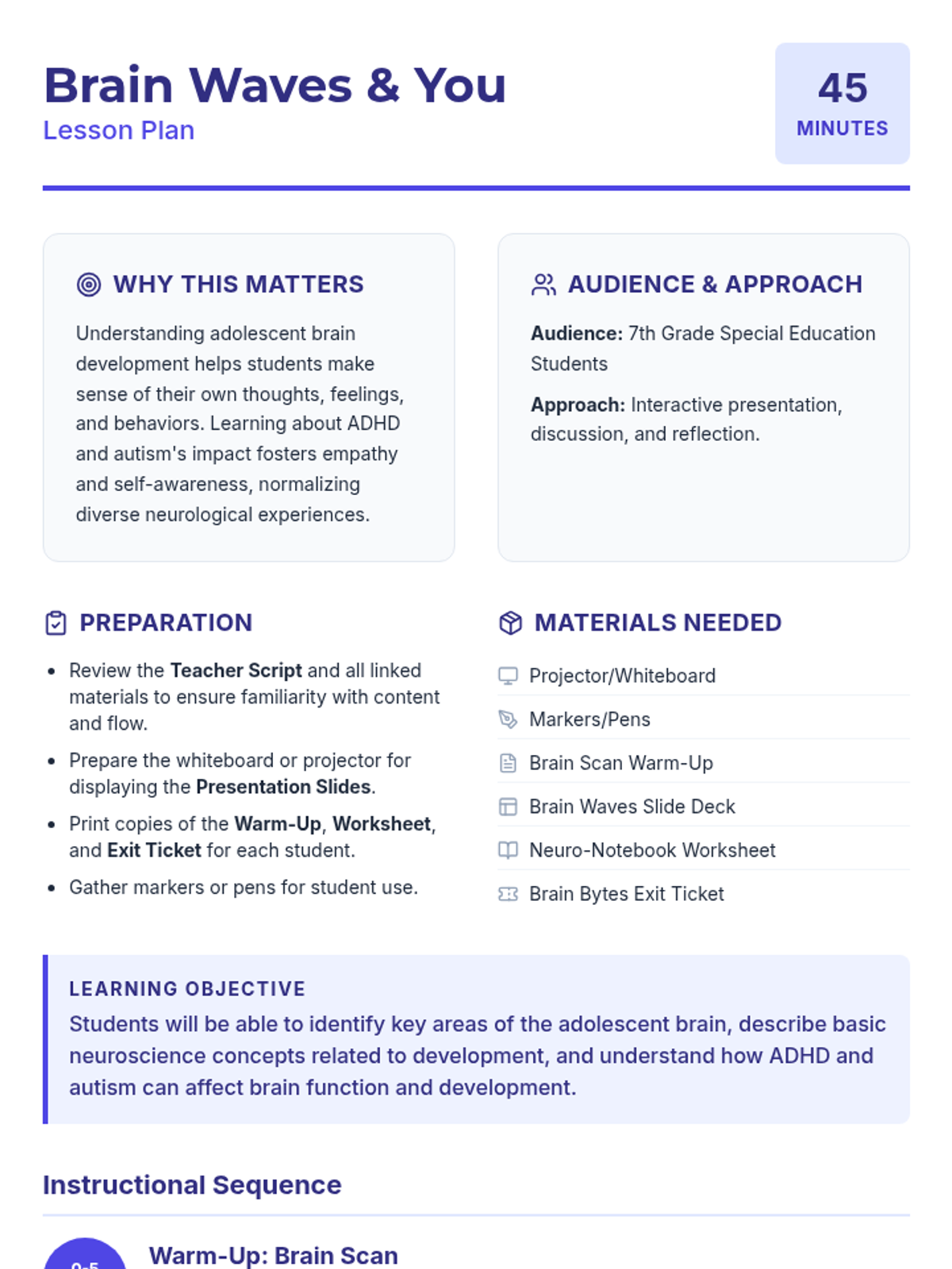 An introductory neuroscience lesson for 7th-grade students focusing on adolescent brain development, neurodiversity, and the unique wiring of ADHD and autistic brains.