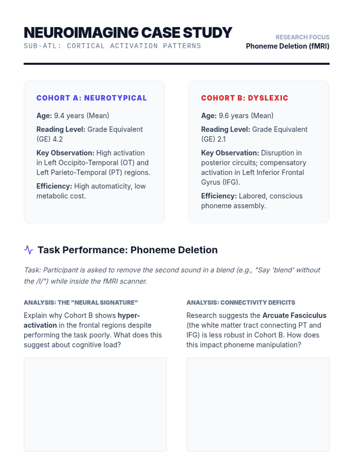 Examination of brain regions and neurological pathways involved in sound manipulation and reading deficits.