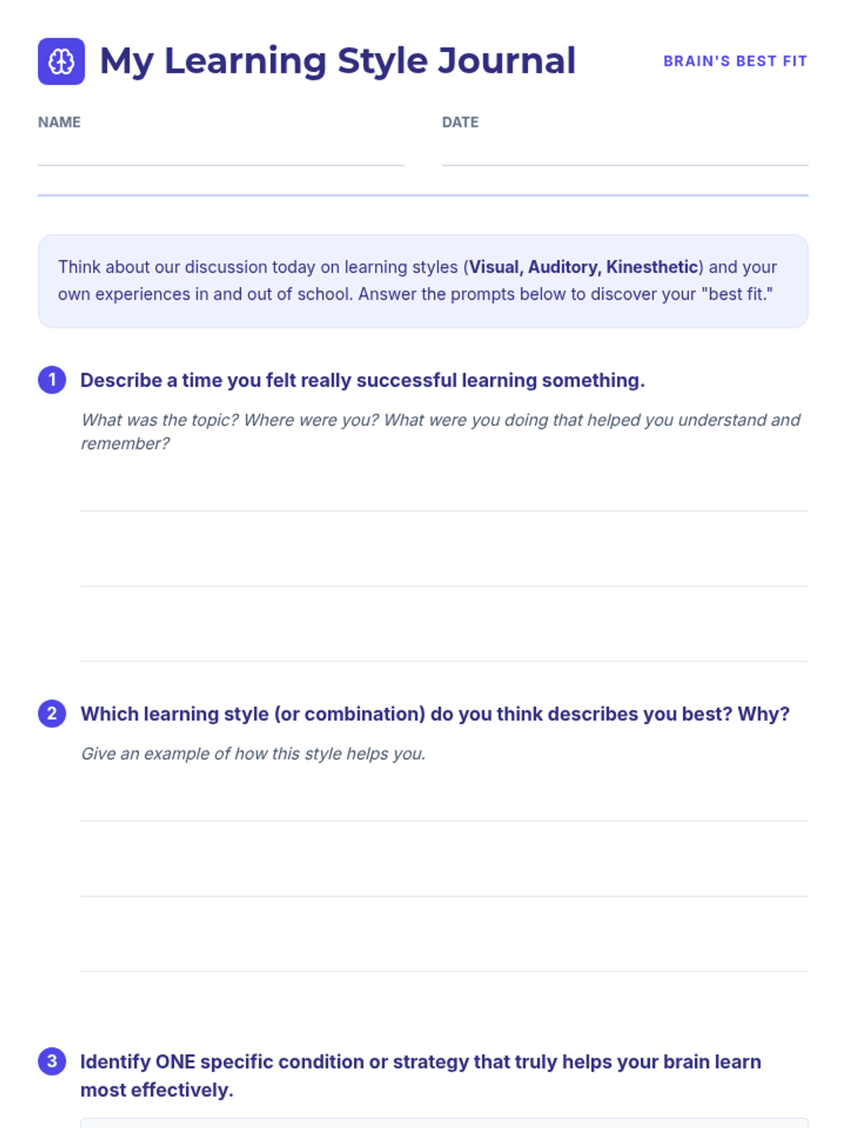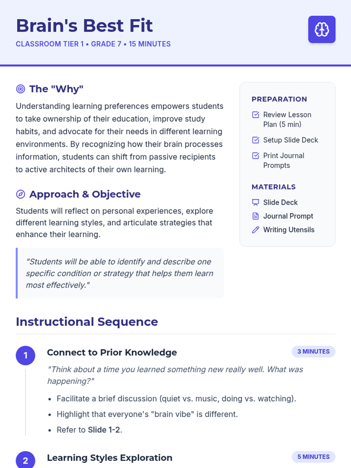 A 15-minute lesson for 7th-graders to explore learning styles and identify personal strategies for academic success and self-advocacy.